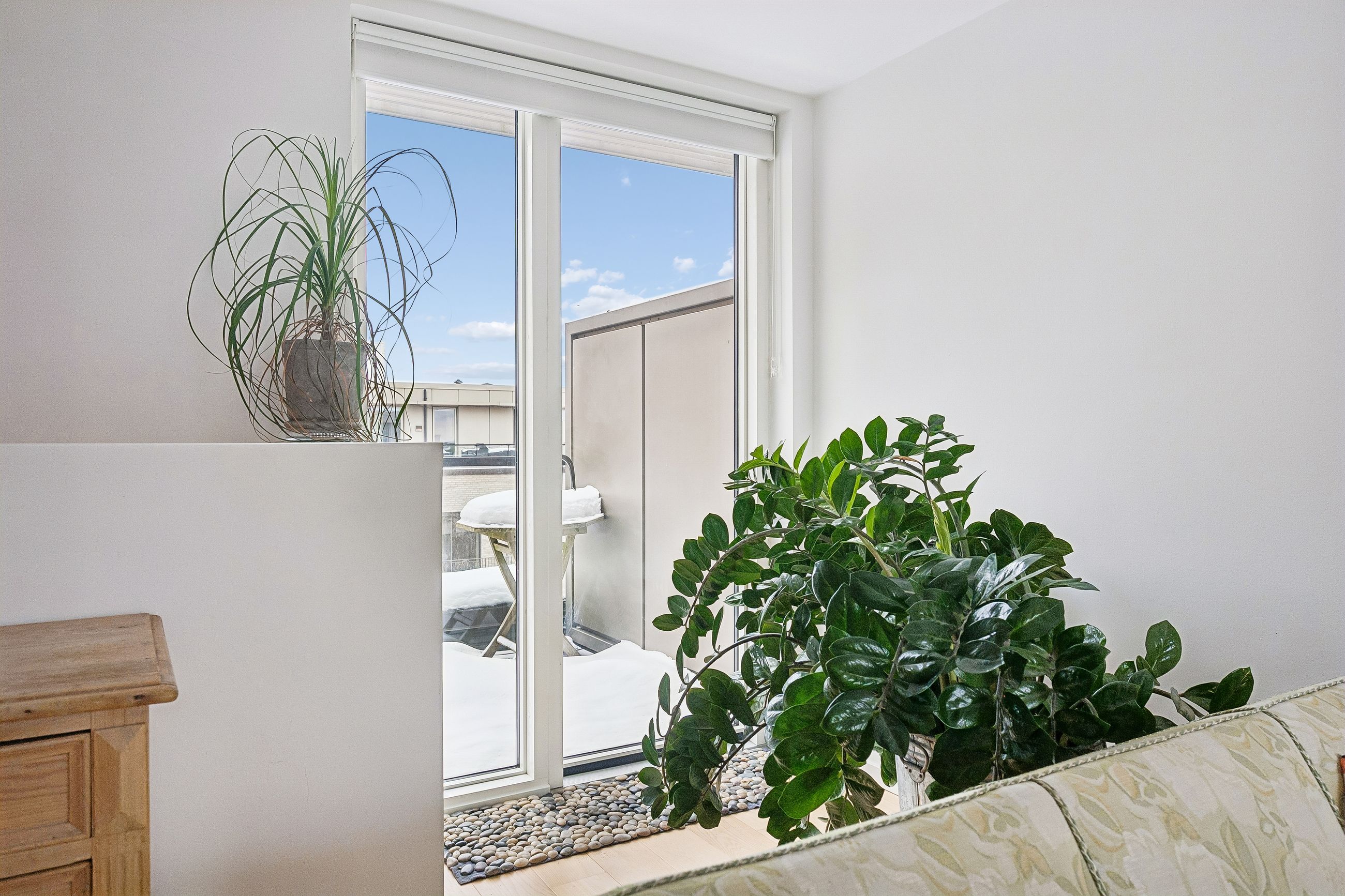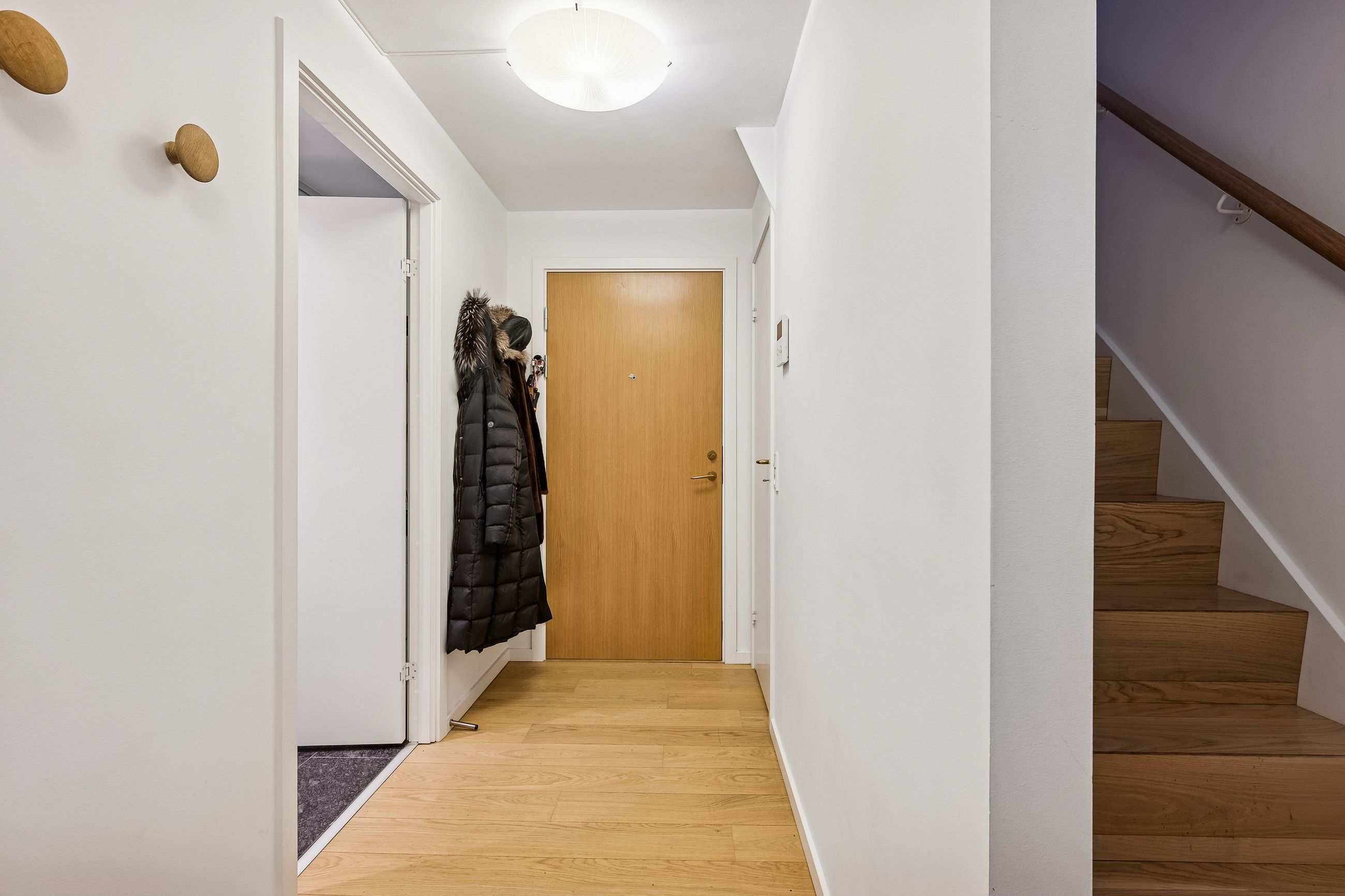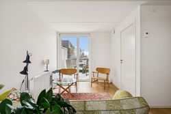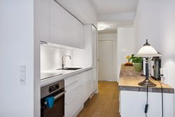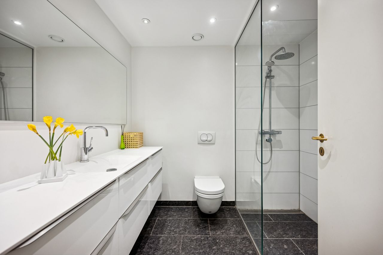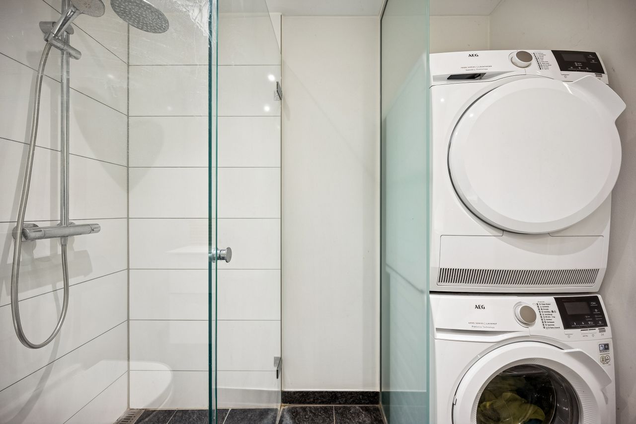Lejligheden rummer velindrettede værelser med indbyggede skabe samt et stilrent badeværelse udført i kvalitetsmaterialer med separat bruseniche og vaskefaciliteter. Overalt opleves en høj standard, rene linjer og en rolig, nordisk æstetik.