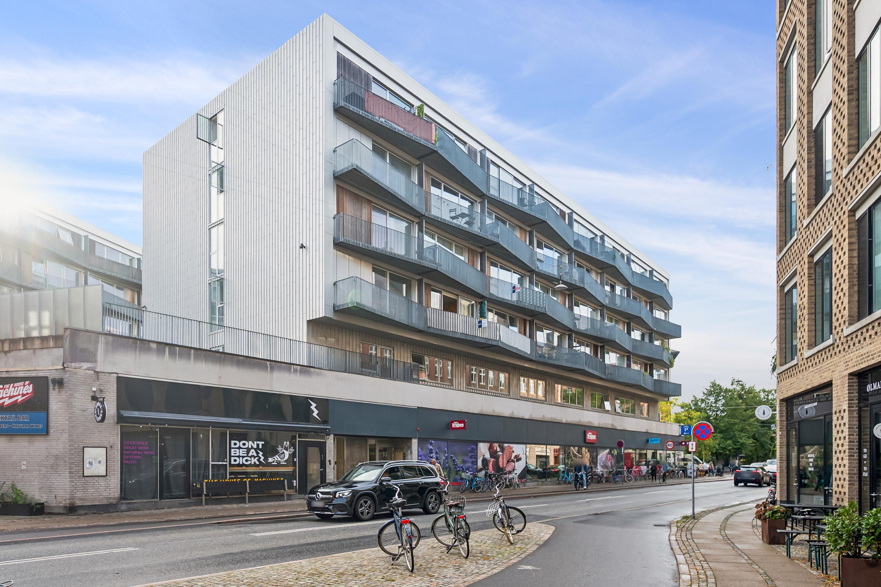 Opført i 1971 og kendetegnet ved det modernistiske formsprog med generøse vinduespartier og markante altaner, der giver bygningen et levende udtryk. Ejendommen rummer elevator, grønne fællesarealer og cykelparkering og som ekstra plus en tagterrasse med udsigt over København, der kan bruges af beboerne året rundt.