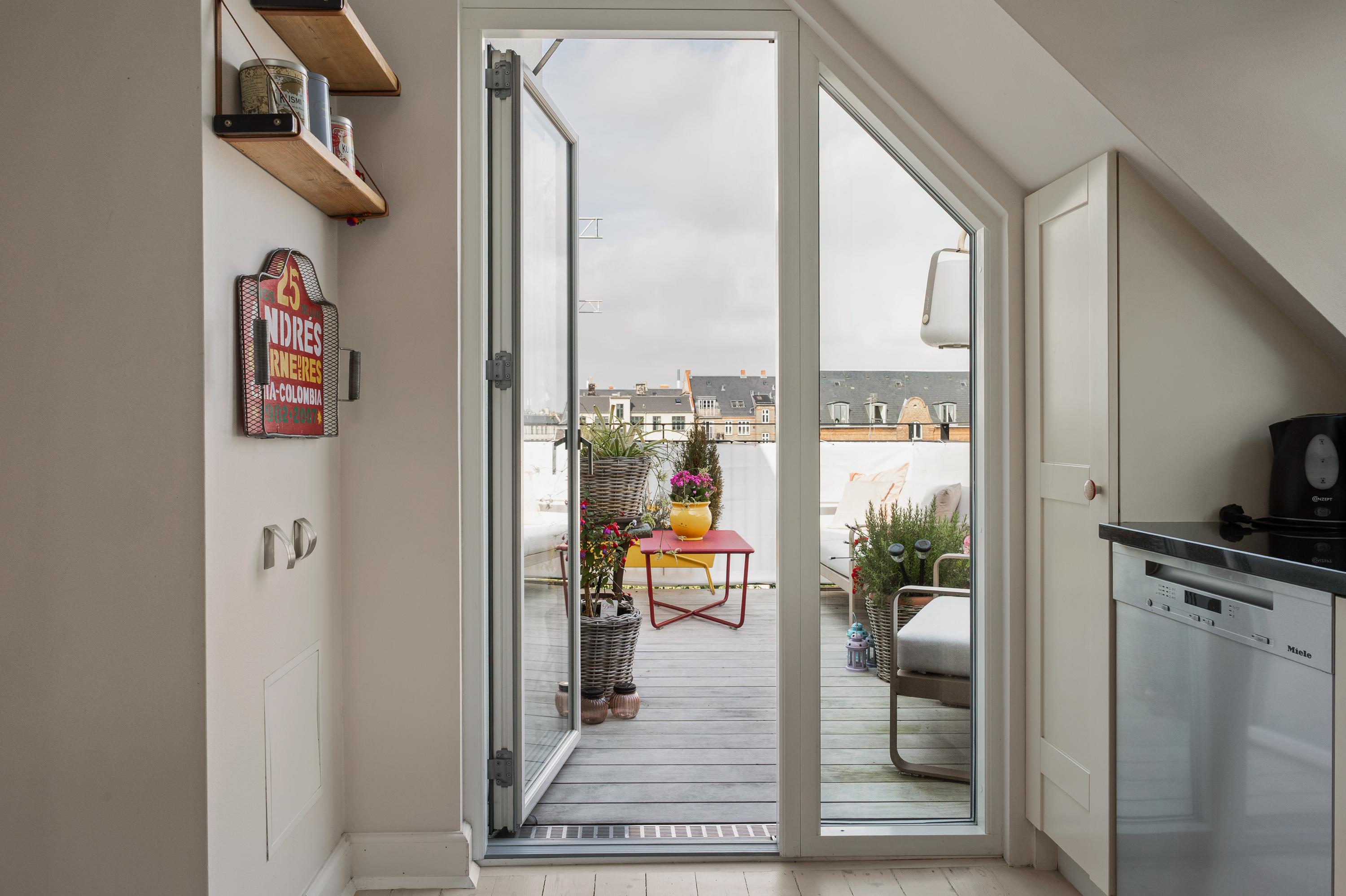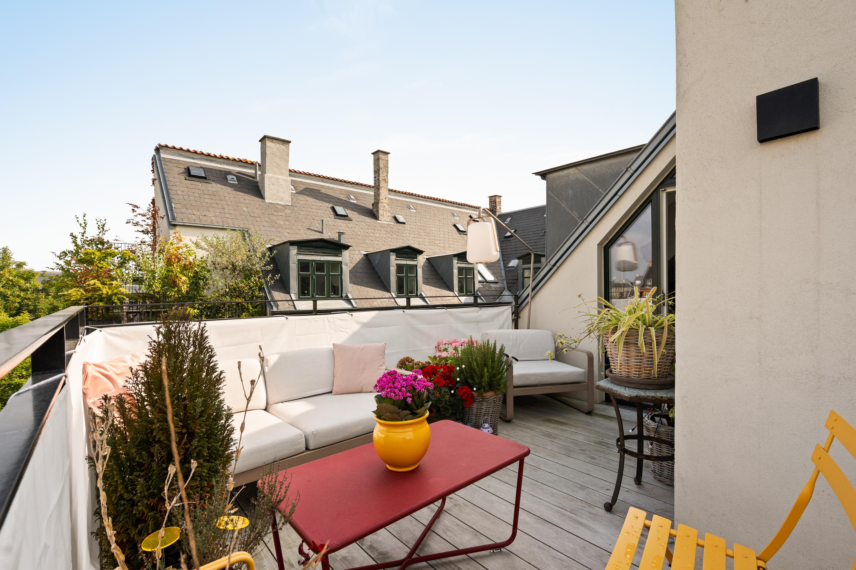 Liebhaveri på indre Frederiksberg. Sydvestvendt tagterrasse med fri udsigt, privat P-plads samt skøn fælles have.