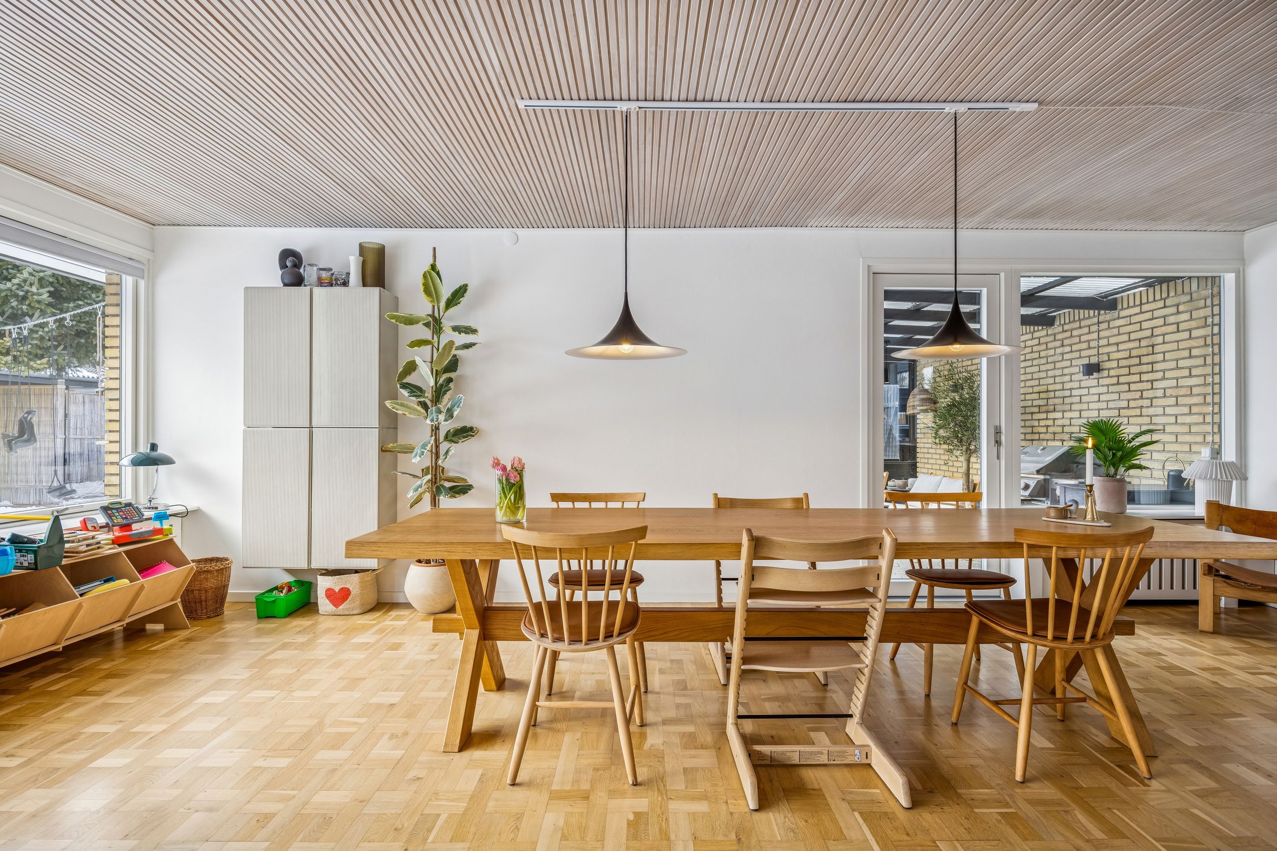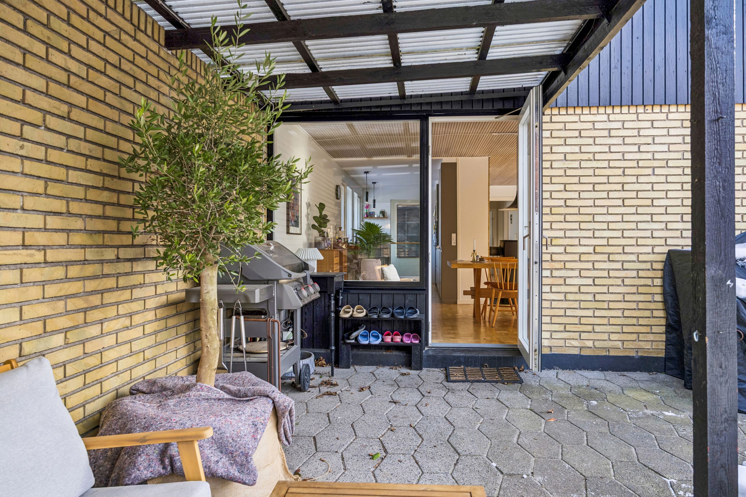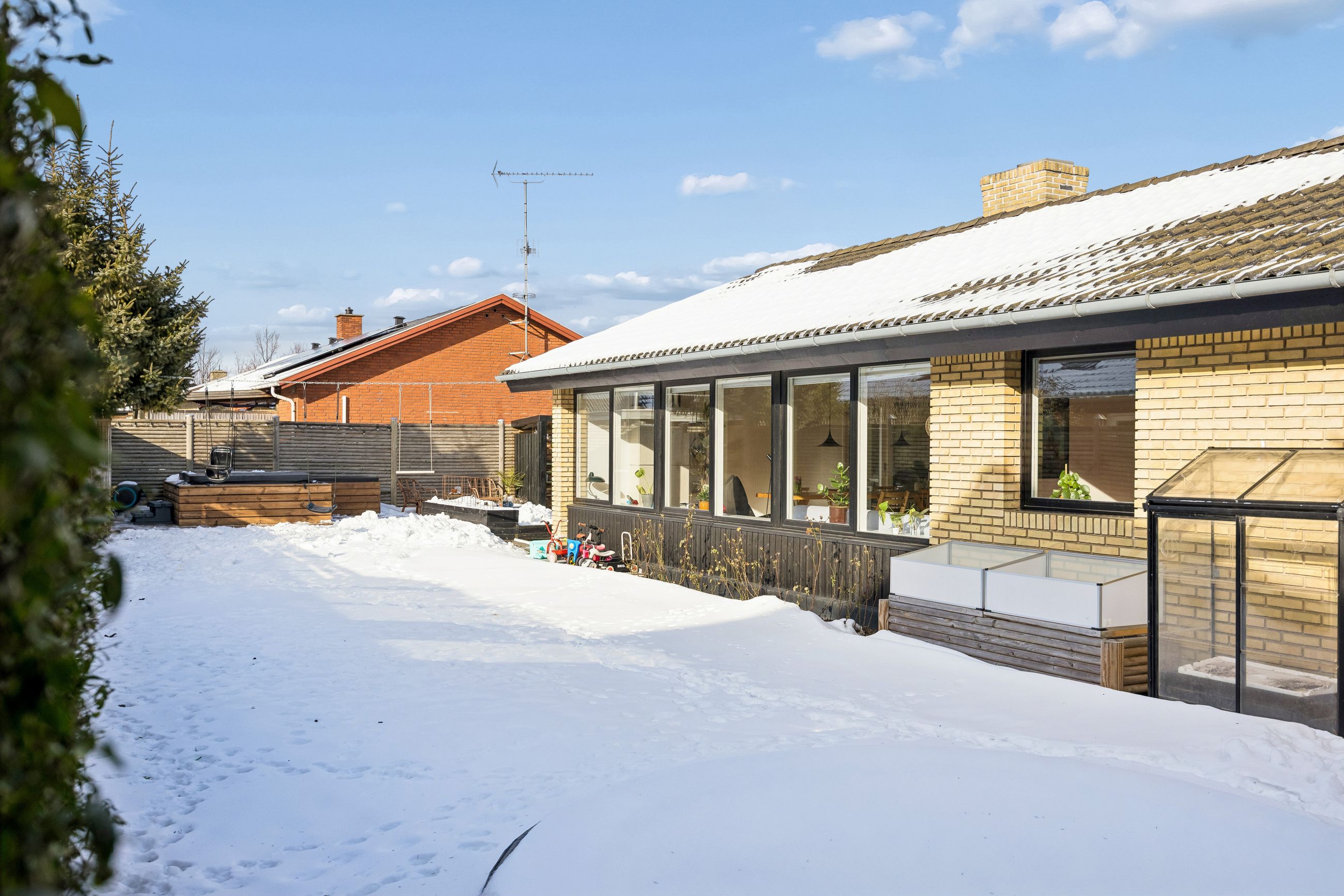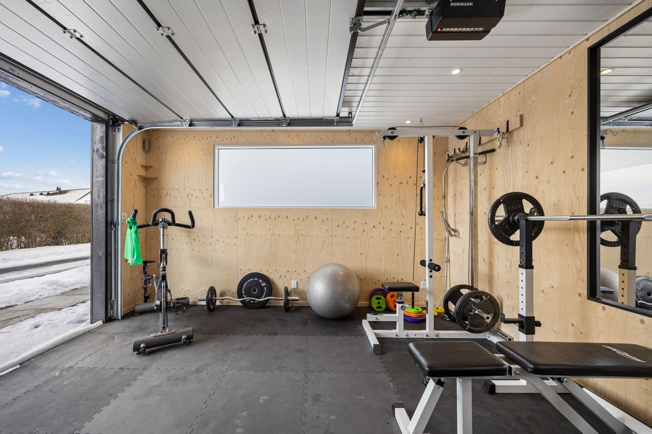 Haven er en grøn og indbydende ramme med plads til leg, odling og afslapning på terrassen. Den lukkede grund skaber tryghed og overskuelighed – perfekt for både børn og voksne, og giver samtidig mulighed for at skabe flere hyggelige uderum. Udvendigt er der carport, isoleret værksted og en ny garage fra 2025, ligeledes isoleret og med smart belysning.