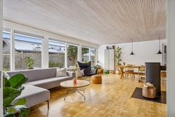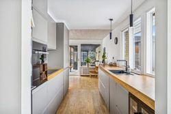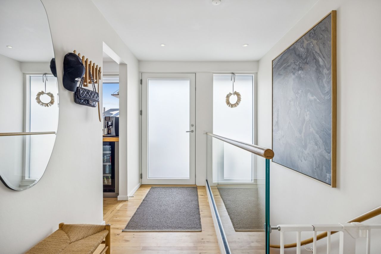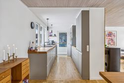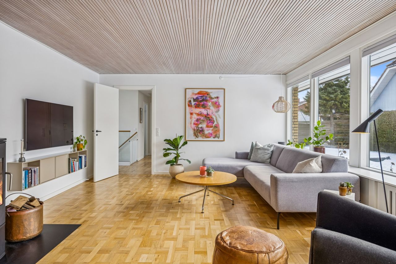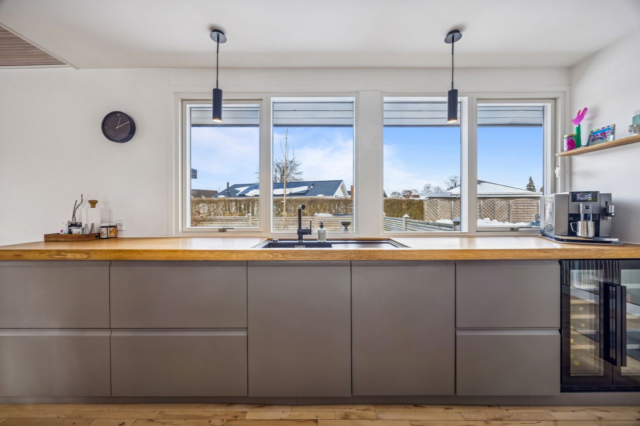Huset fremstår med et funktionelt udtryk og en planløsning, der er grundigt gennemarbejdet. I stueplan bydes du velkommen i en entré med fordelingsgang, som binder hjemmet naturligt sammen. Herfra er der adgang til et lyst og indbydende opholdsmiljø med stue og spiseafdeling, hvor store vinduespartier giver et flot lysindfald og direkte kontakt til haven. Køkkenet ligger praktisk i åben forbindelse med opholdszonen og er indrettet med god bordplads og kvalitetshvidevarer. Der er mulighed for at etablere et moderne køkken-alrum, hvis man ønsker endnu mere åbenhed.