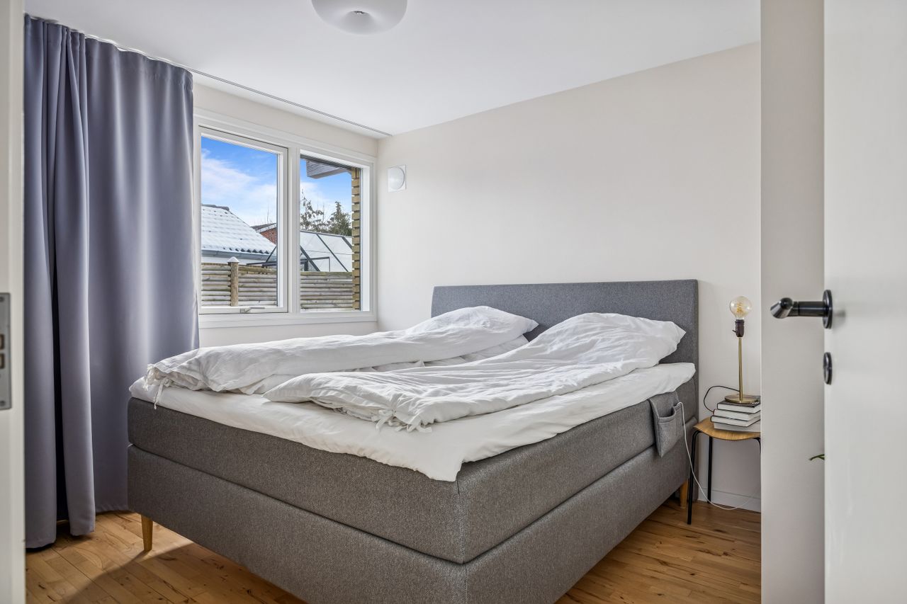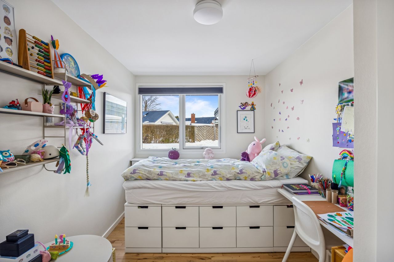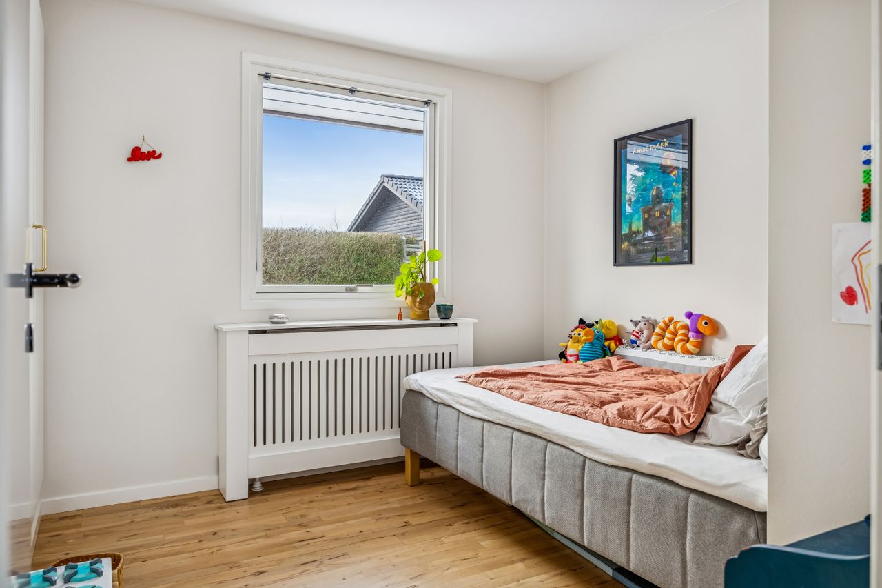 Værelsesafdelingen rummer flere regulære værelser, som kan tilpasses behov som soveværelse, børneværelser, kontor eller gæsterum. Badeværelset er praktisk indrettet og giver plads til opdatering, hvis man ønsker et mere nutidigt udtryk.