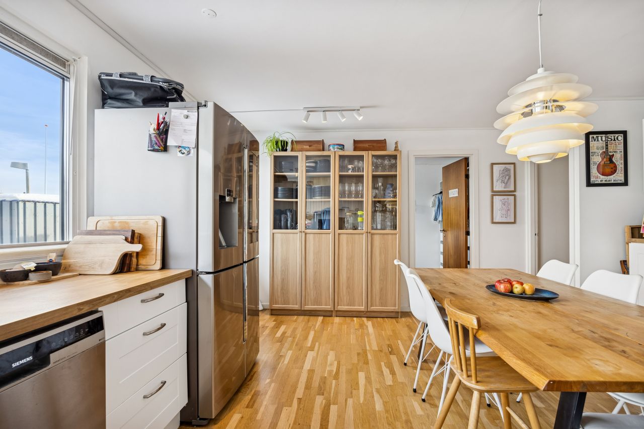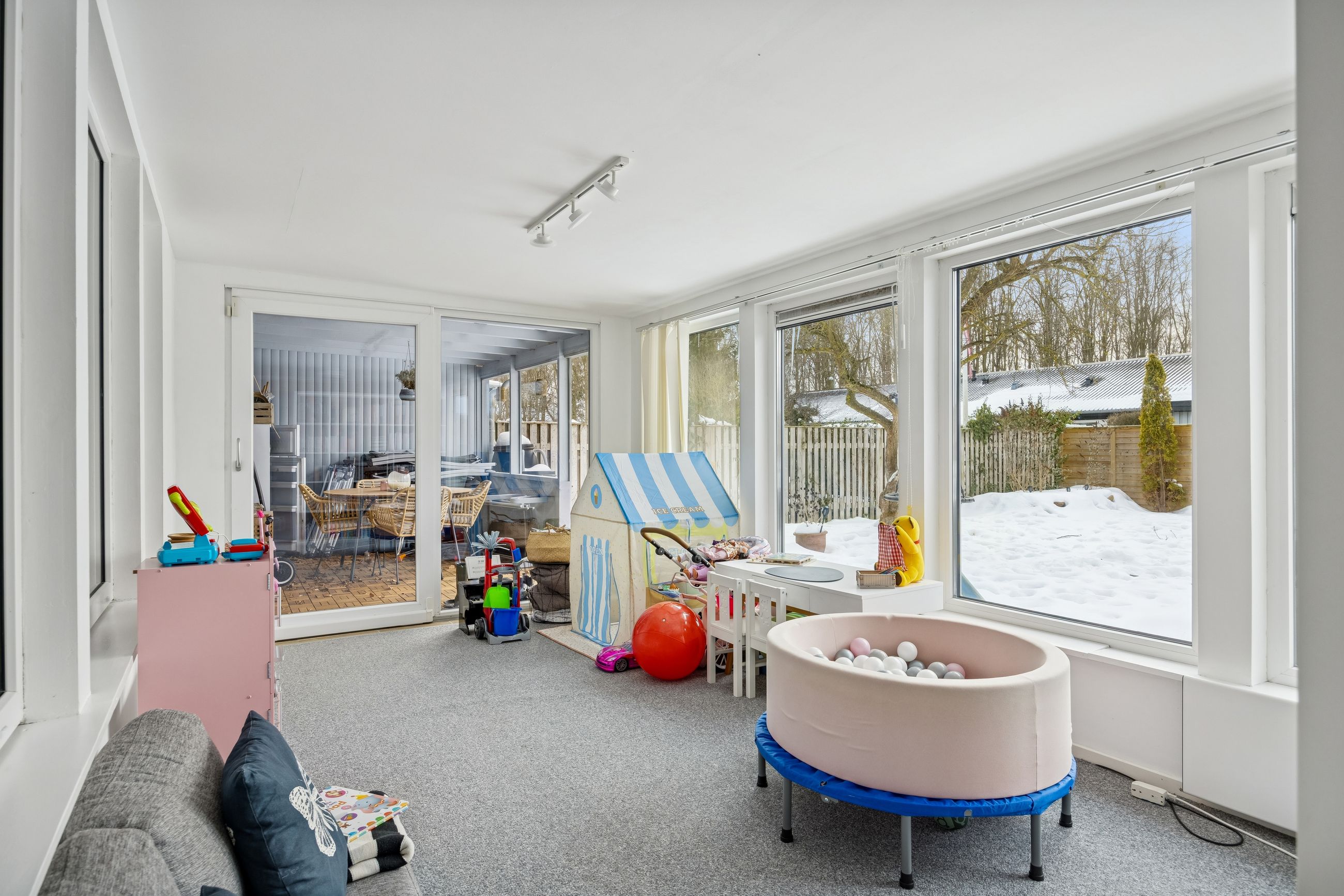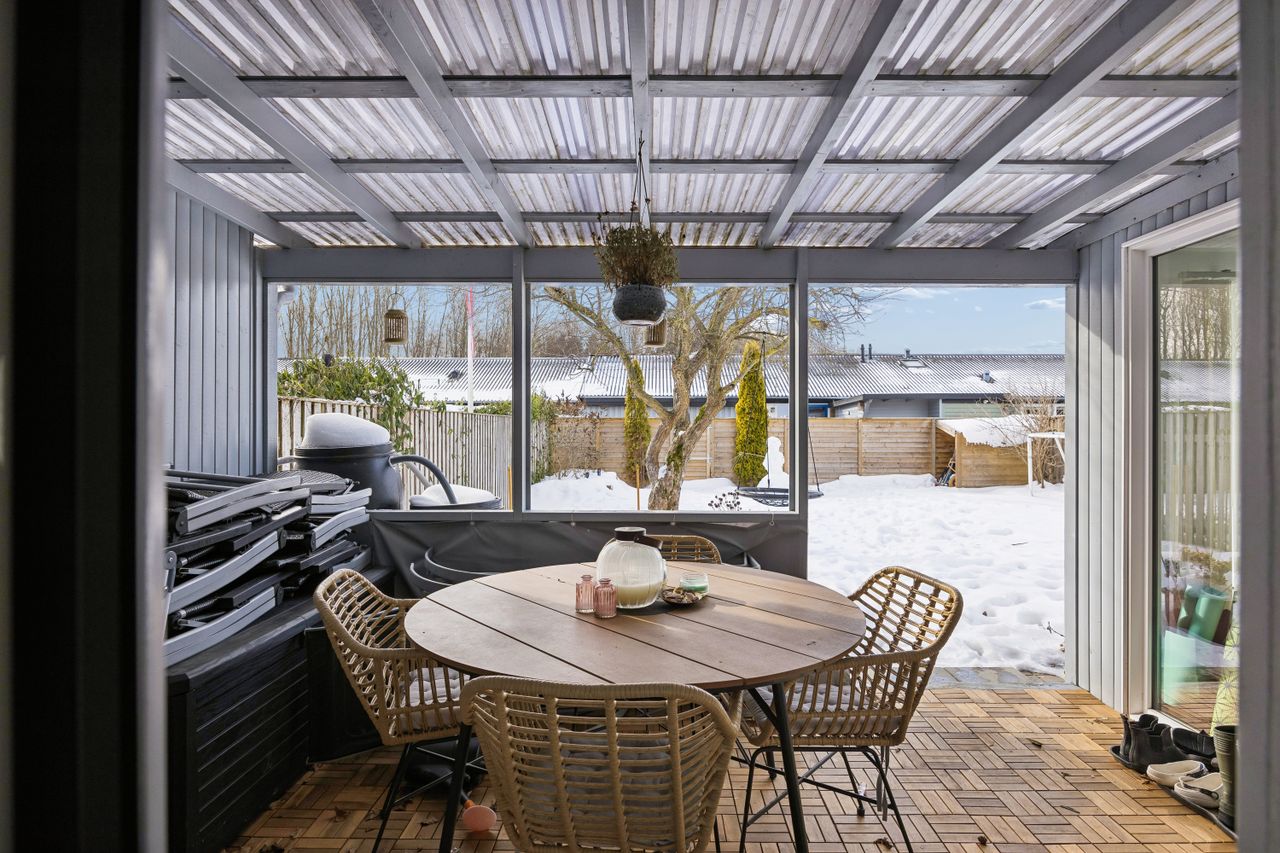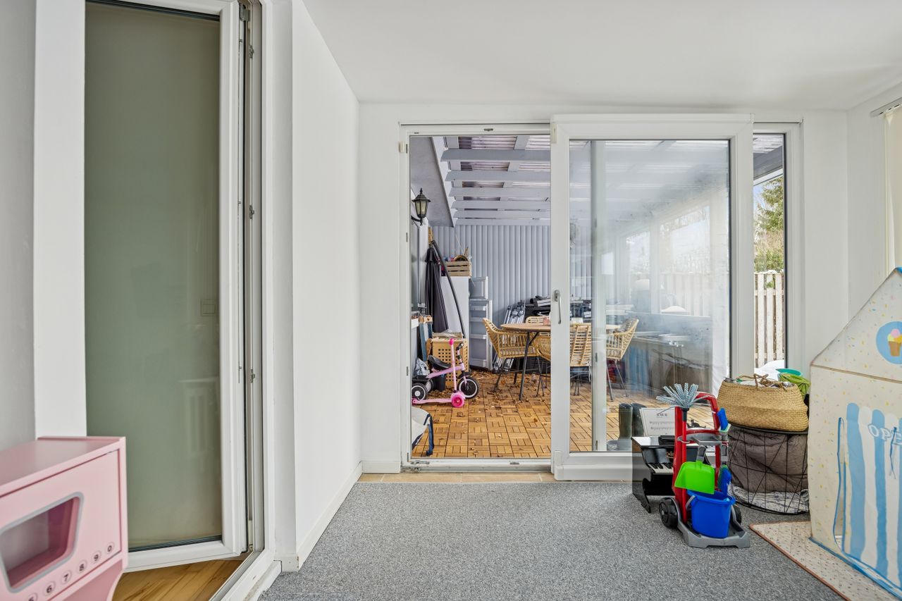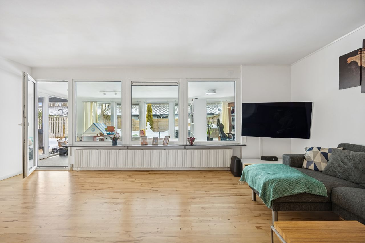Husets hjerte er den store stue, der ligger i åben forbindelse med køkkenet. Dette åbne ruminddelingskoncept skaber en lys og luftig atmosfære, hvor familien kan samles om hyggelige middage eller afslappende aftener foran fjernsynet. Fra stuen har du direkte adgang til den imponerende udestue på 21 m2 – her kan du nyde udsigten over haven året rundt uanset vejret udenfor.