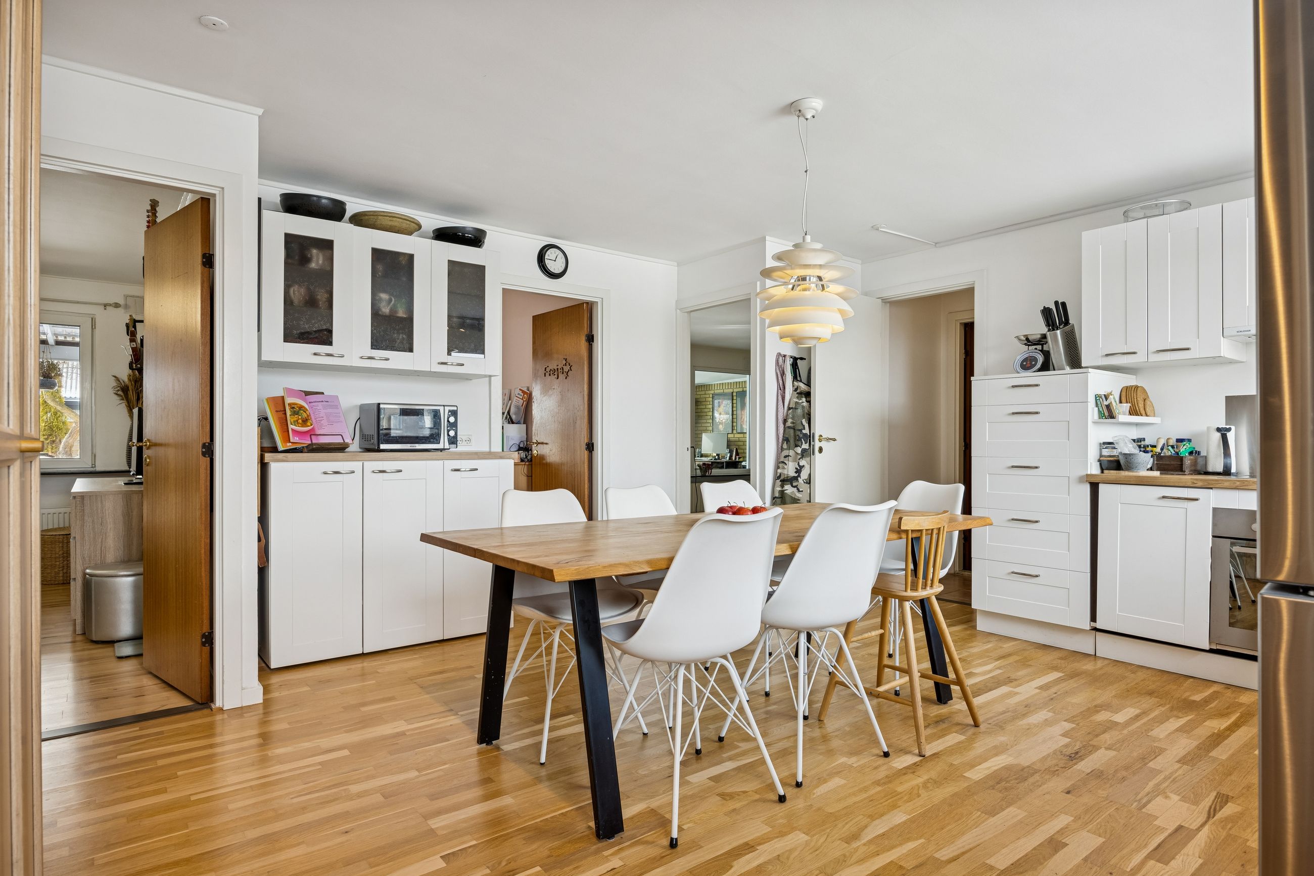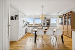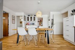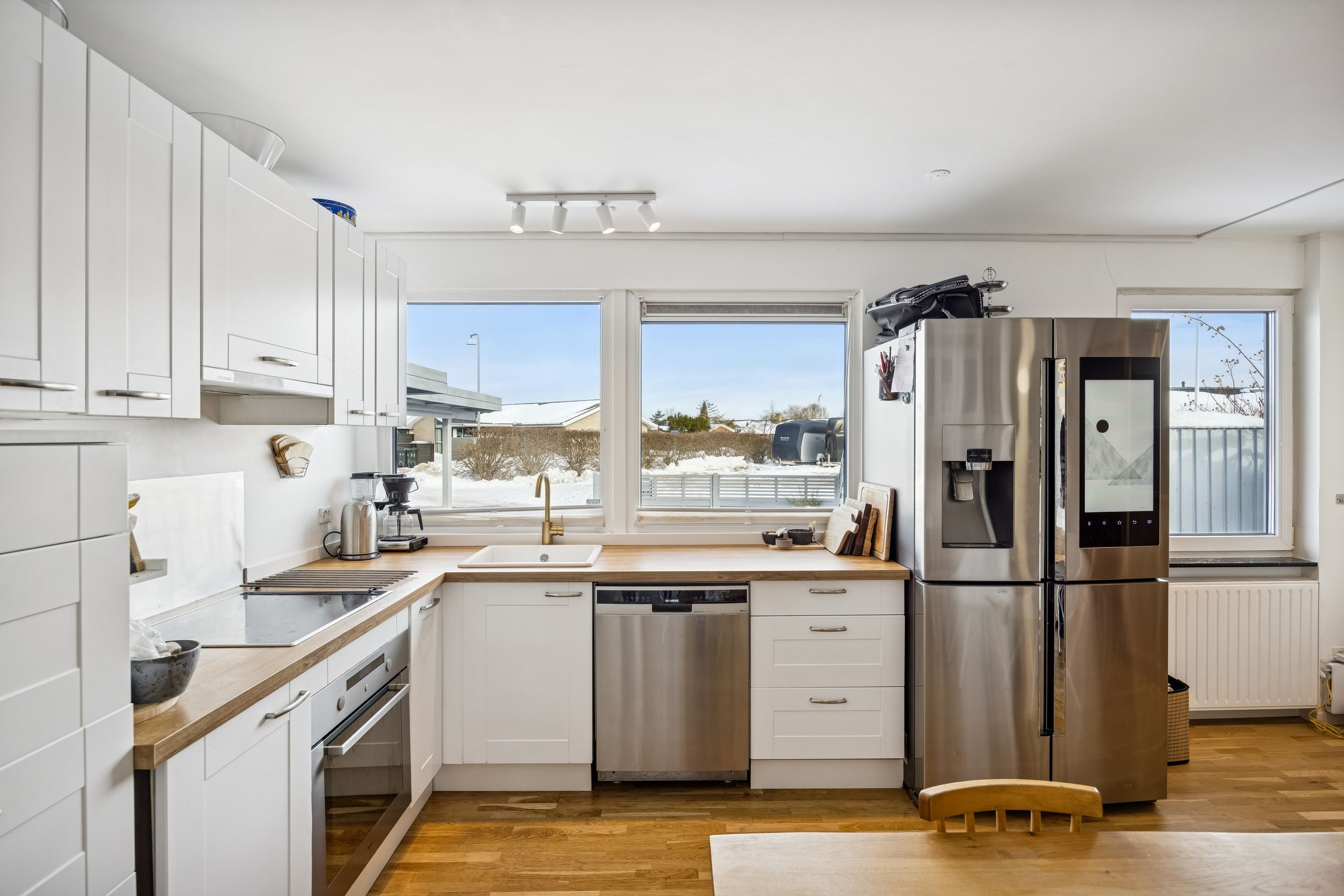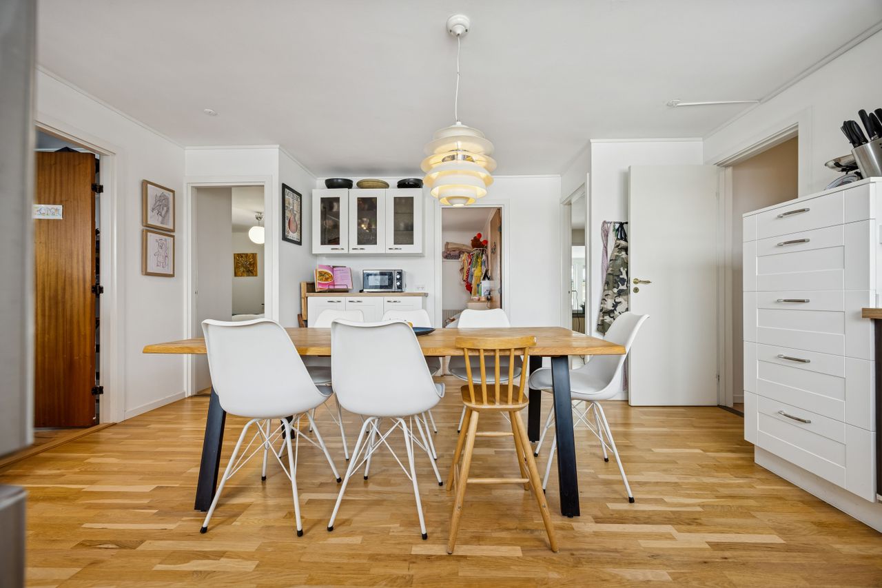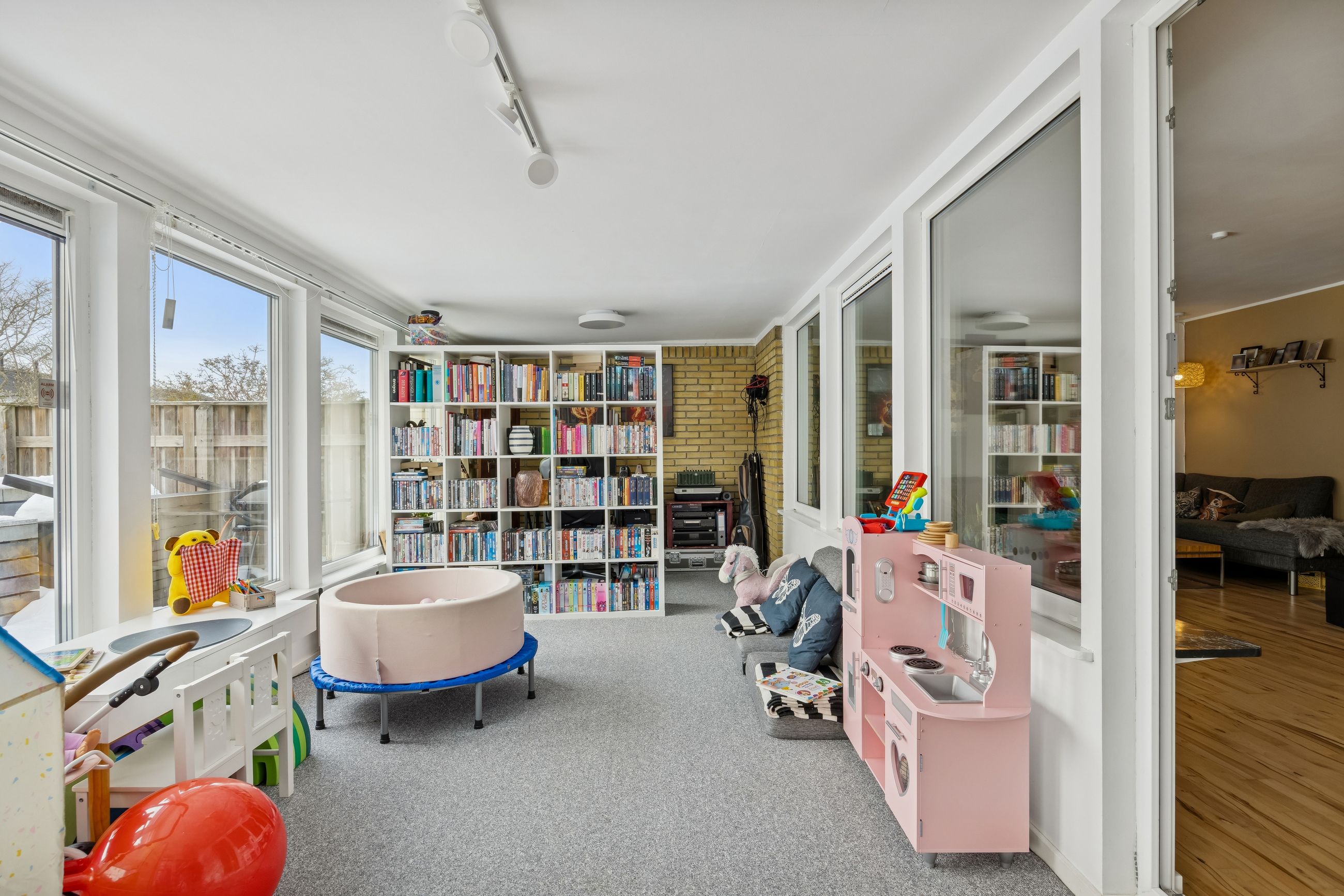 Husets hjerte er den store stue, der ligger i åben forbindelse med køkkenet. Dette åbne ruminddelingskoncept skaber en lys og luftig atmosfære, hvor familien kan samles om hyggelige middage eller afslappende aftener foran fjernsynet. Fra stuen har du direkte adgang til den imponerende udestue på 21 m2 – her kan du nyde udsigten over haven året rundt uanset vejret udenfor.