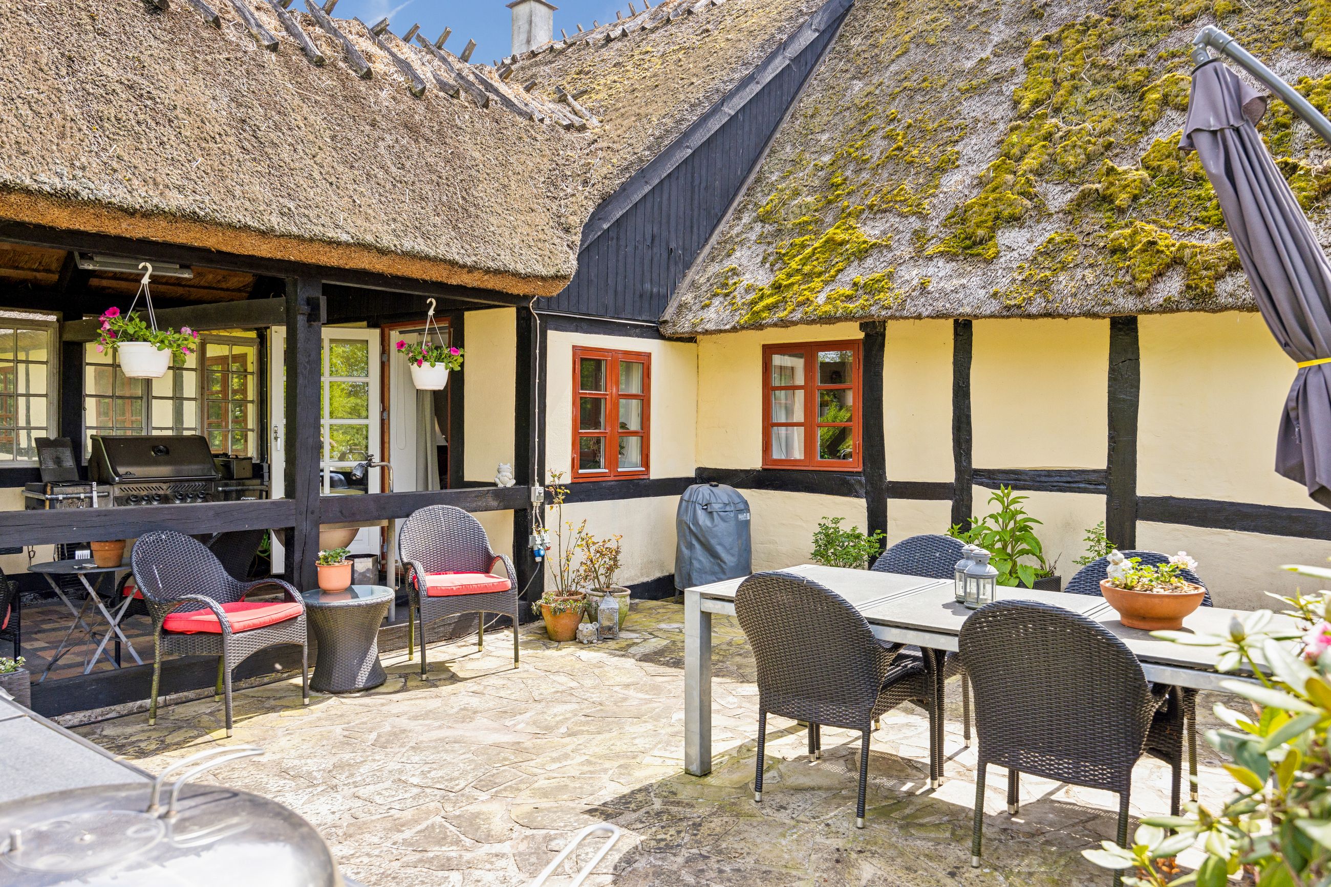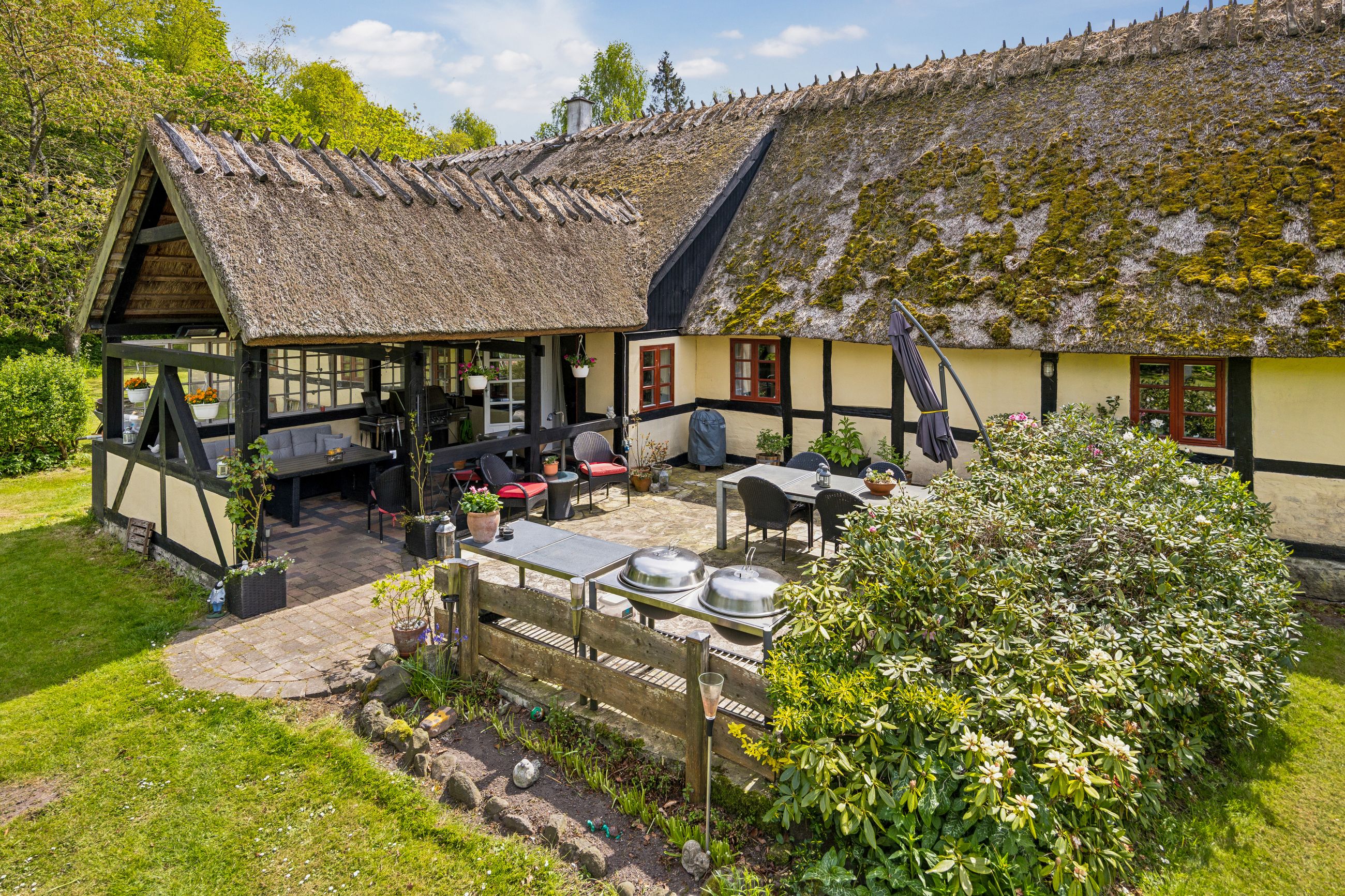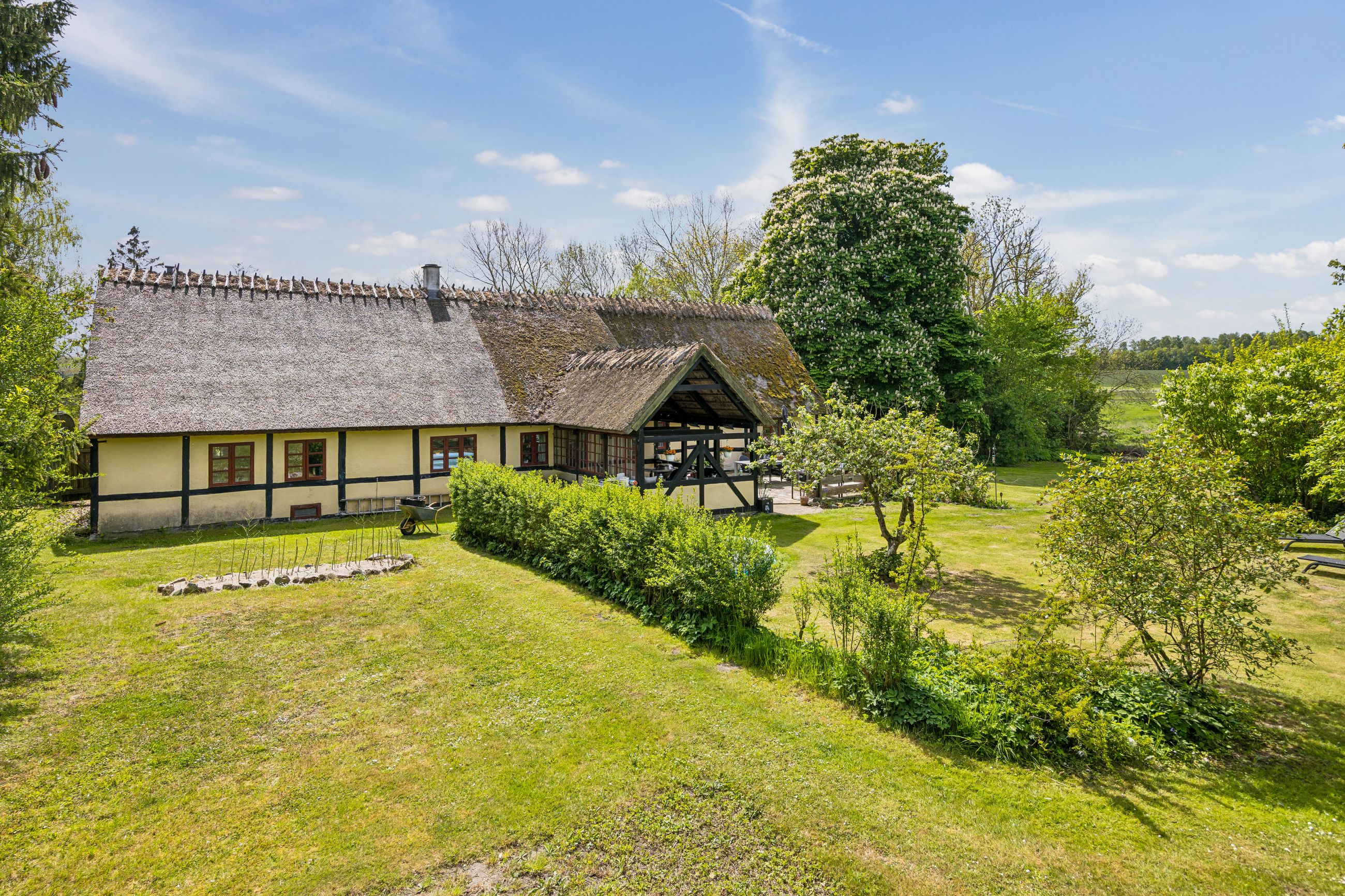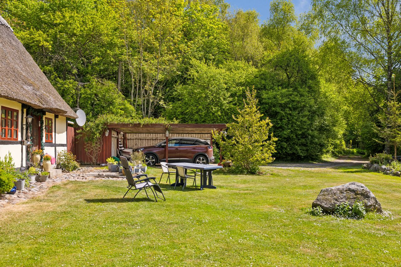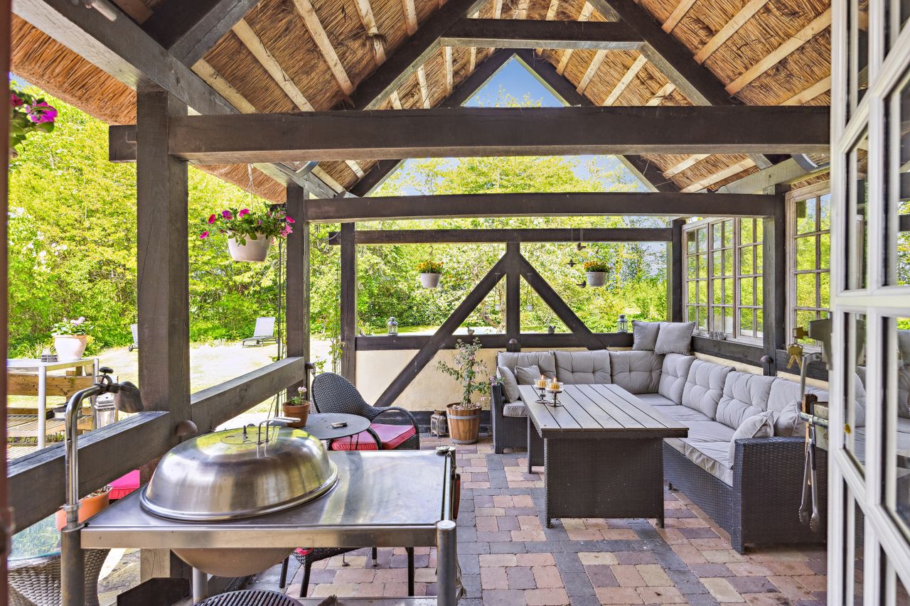 Udenfor venter en skøn ugeneret have, hvor solen kan nydes hele dagen lang. De smukke udendørsområder inviterer til afslapning og leg for både børn og voksne. De tilhørende udbygninger byder på utallige anvendelsesmuligheder, hvad enten du drømmer om dyrehold med direkte adgang til udendørs folde, opbevaring eller måske endda at indrette en gildesal eller værksted.