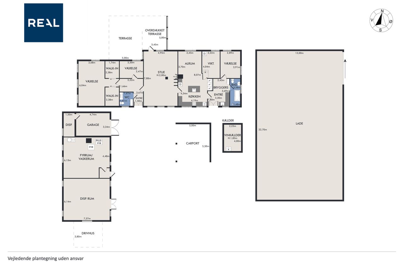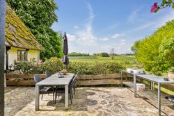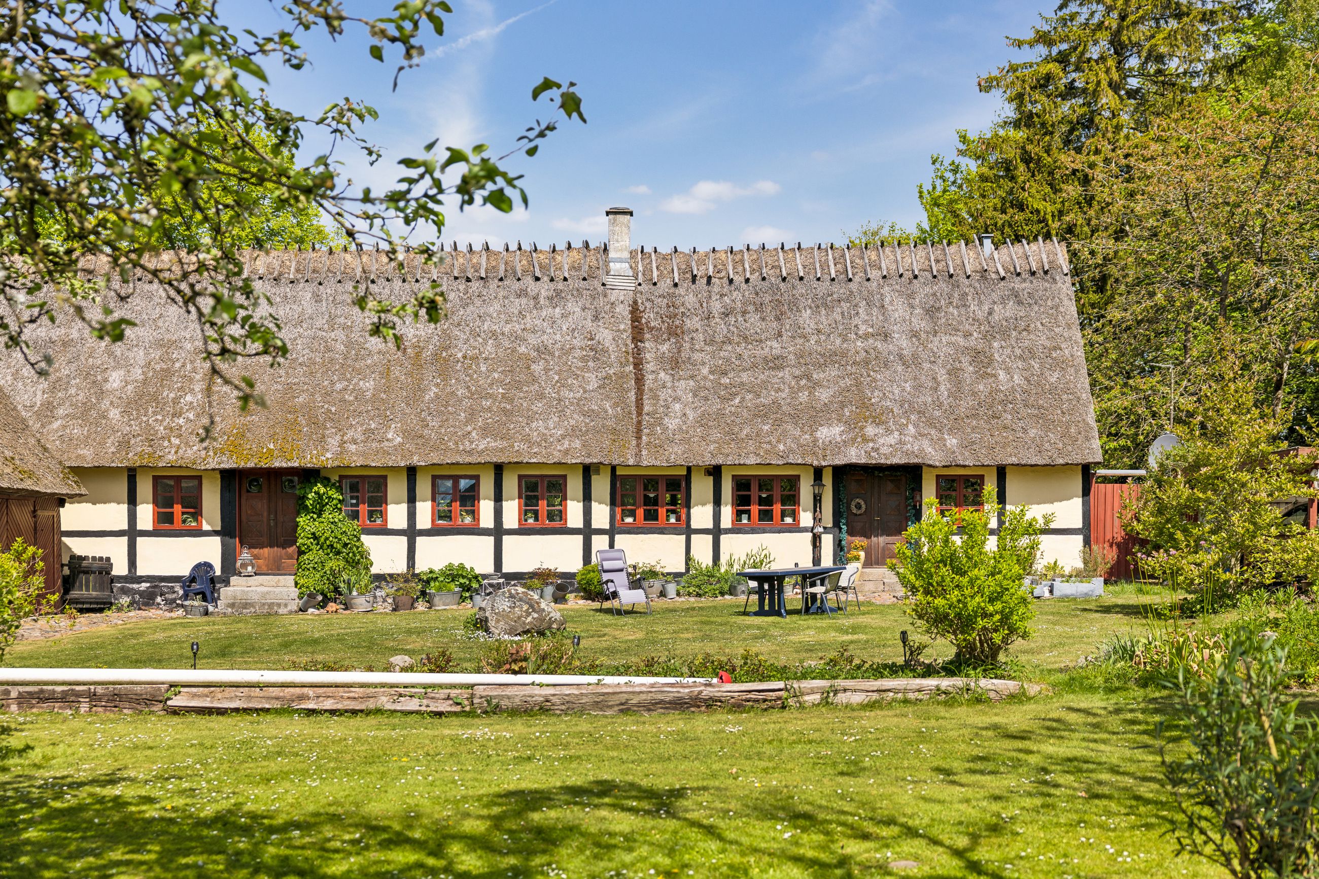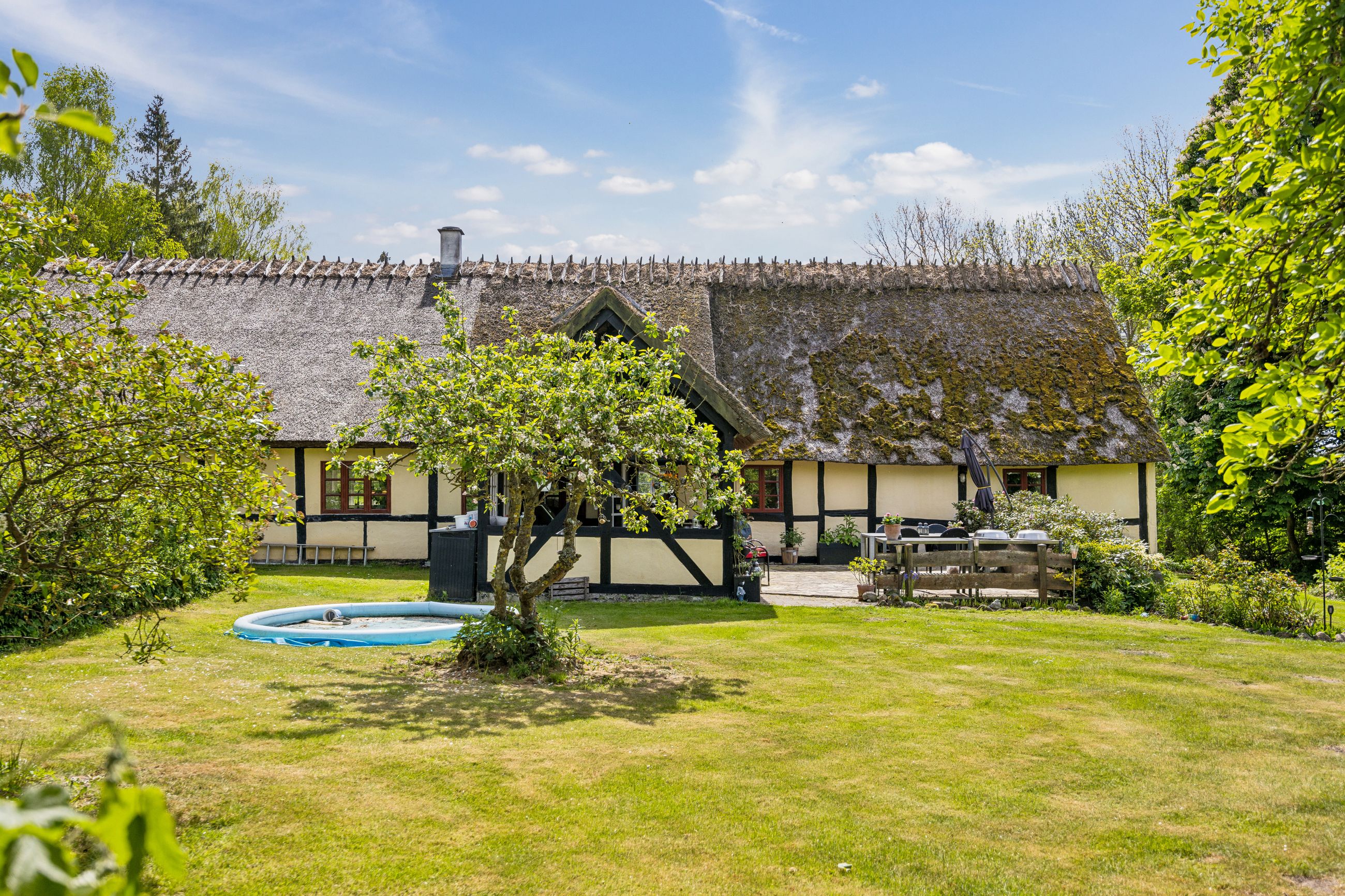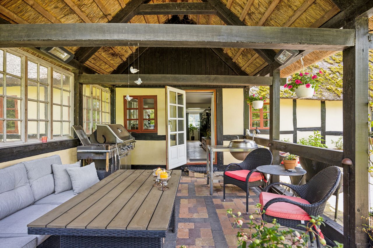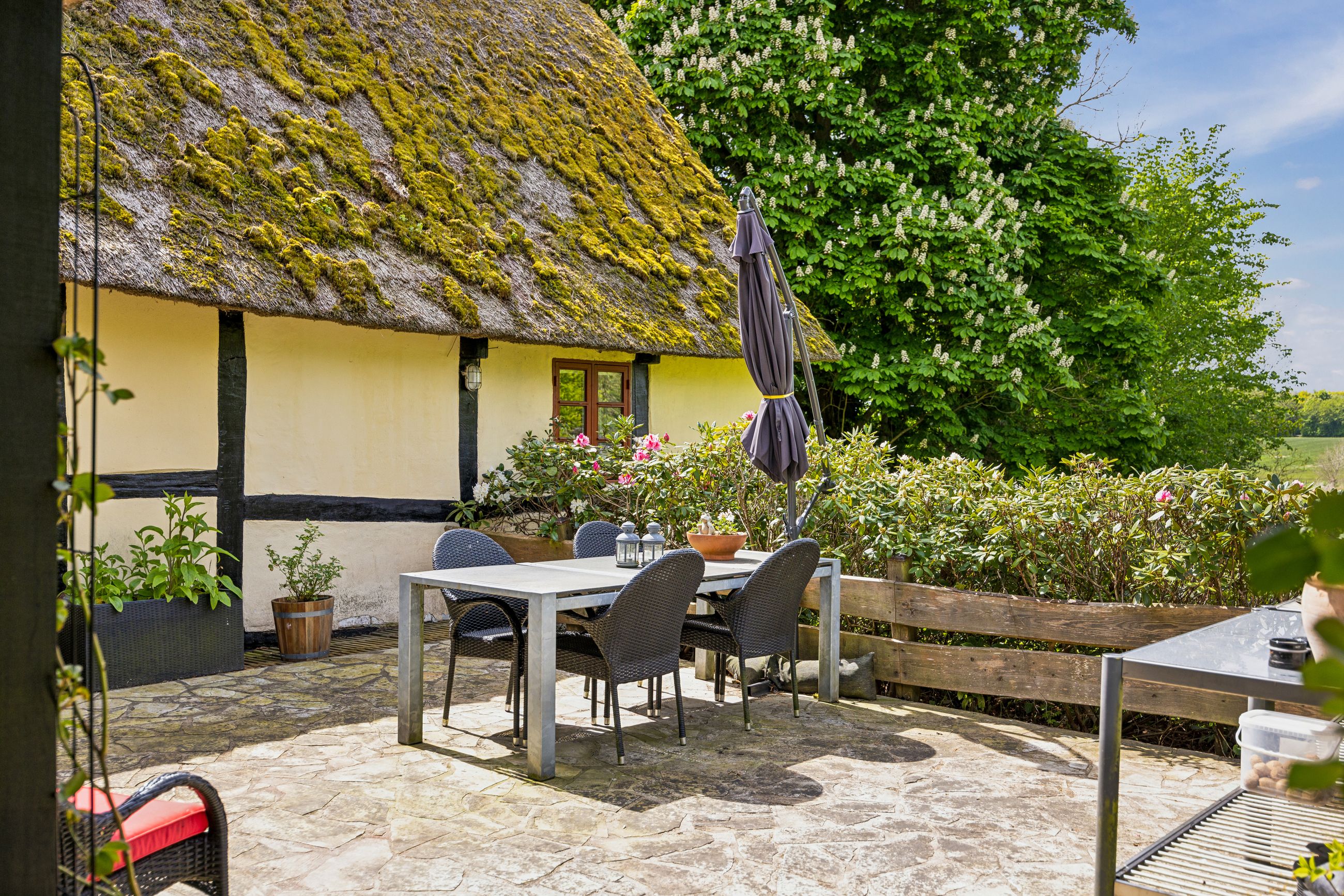 Udenfor venter en skøn ugeneret have, hvor solen kan nydes hele dagen lang. De smukke udendørsområder inviterer til afslapning og leg for både børn og voksne. De tilhørende udbygninger byder på utallige anvendelsesmuligheder, hvad enten du drømmer om dyrehold med direkte adgang til udendørs folde, opbevaring eller måske endda at indrette en gildesal eller værksted.