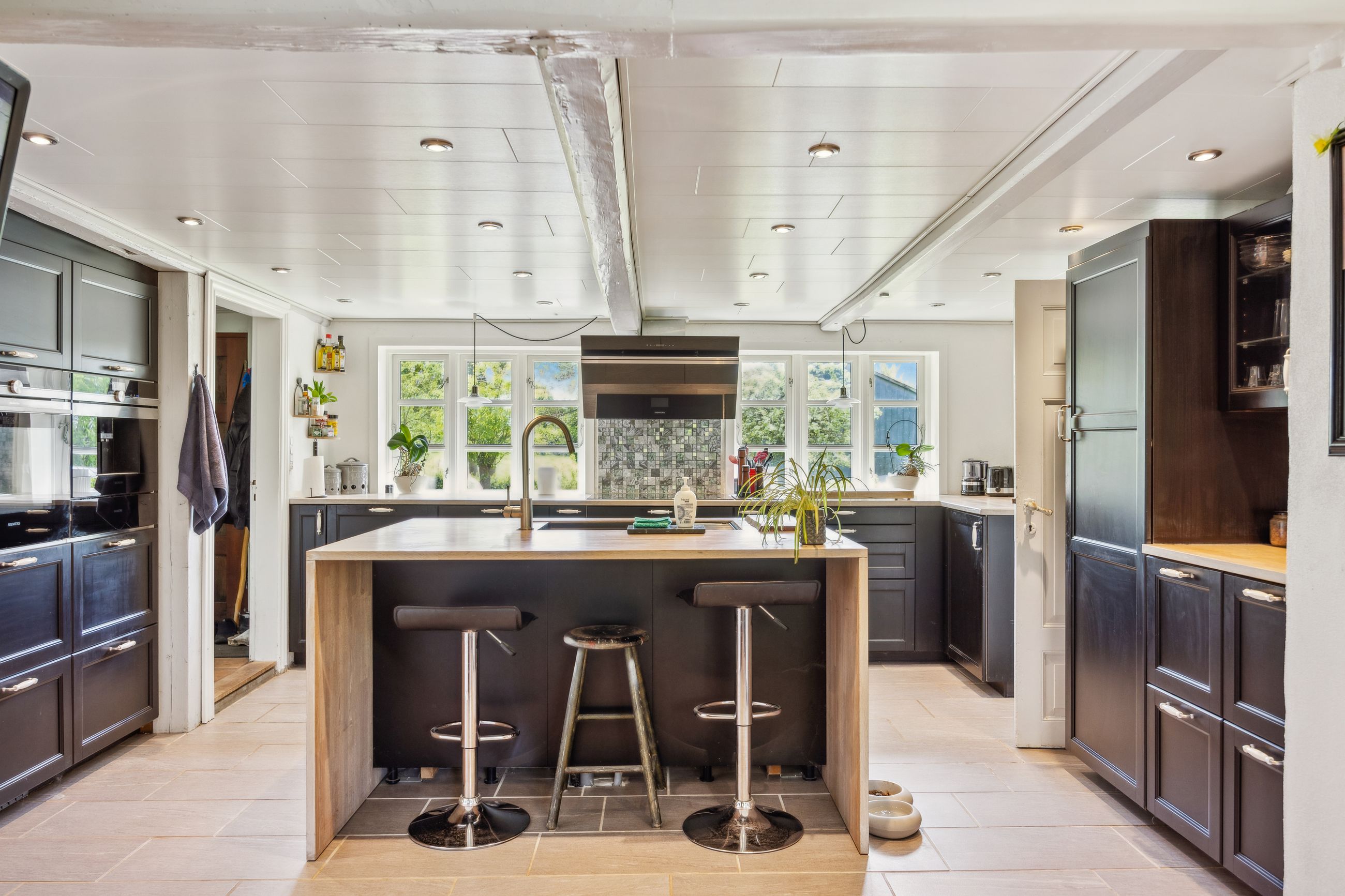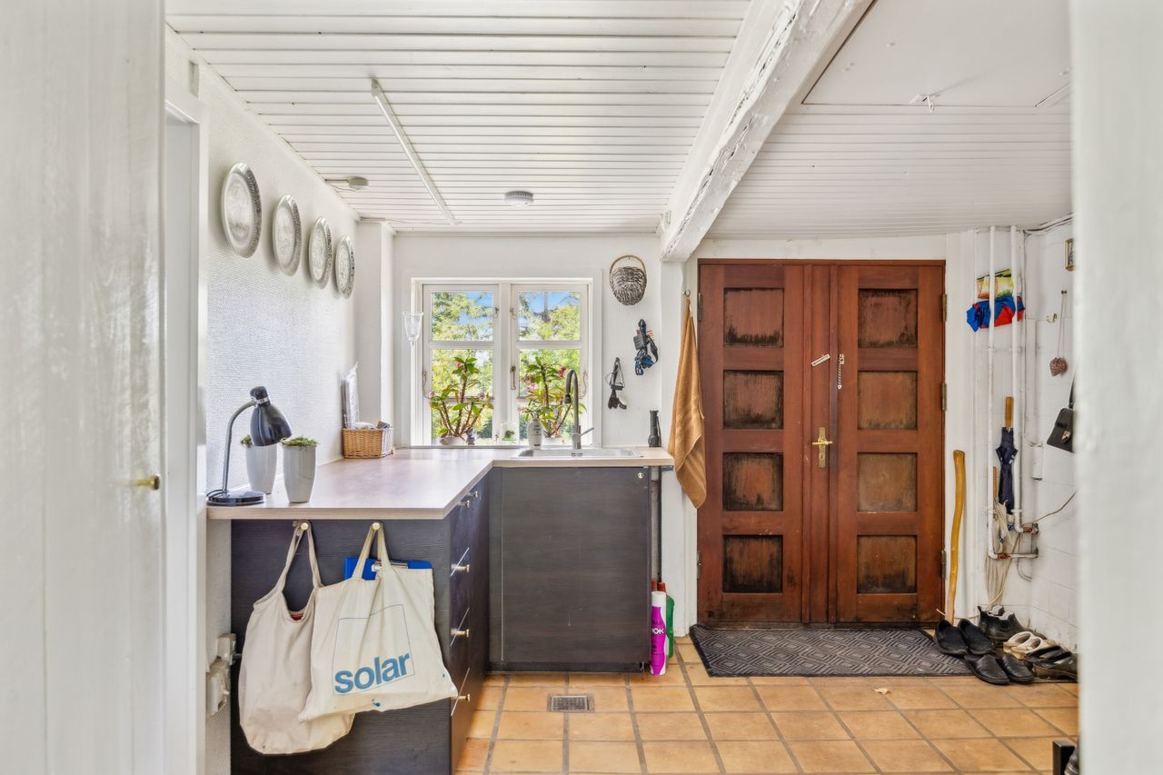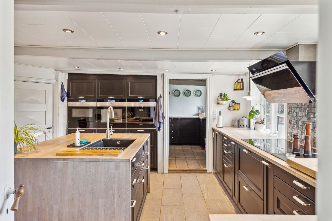Indenfor finder du et stilfuldt IKEA-køkken fra 2016 med tilhørende viktualierum / vinkælder, alt i skabe og skuffer samt hårde hvidevarer fra Siemens StudioLine og som sammen med det rummelige køkken-alrum/stueområde fungerer som husets hjerte. Her kan familien samles om måltiderne eller slappe af i de hyggelige omgivelser ved den indbyggede pejseindsats.