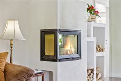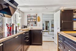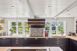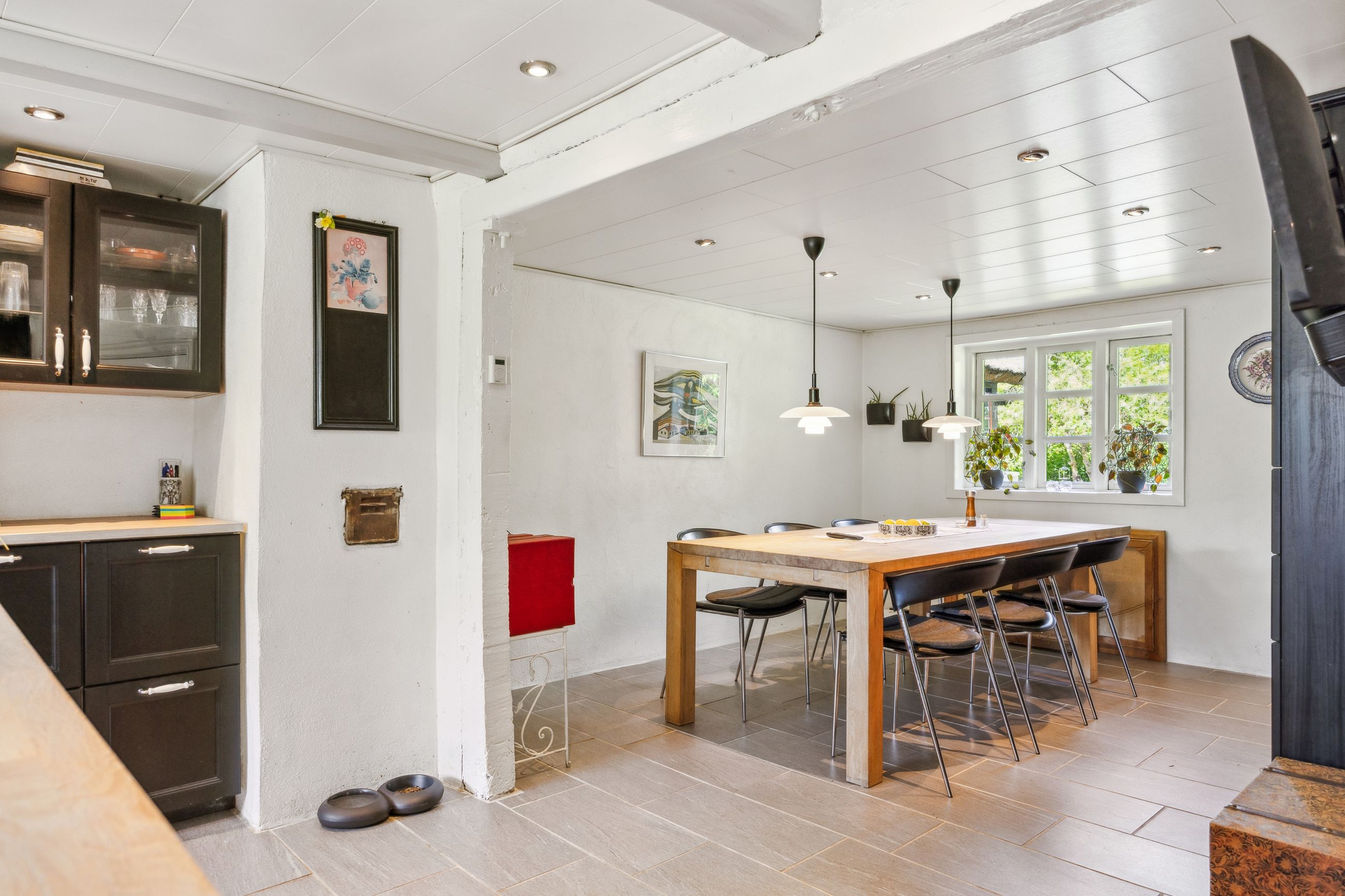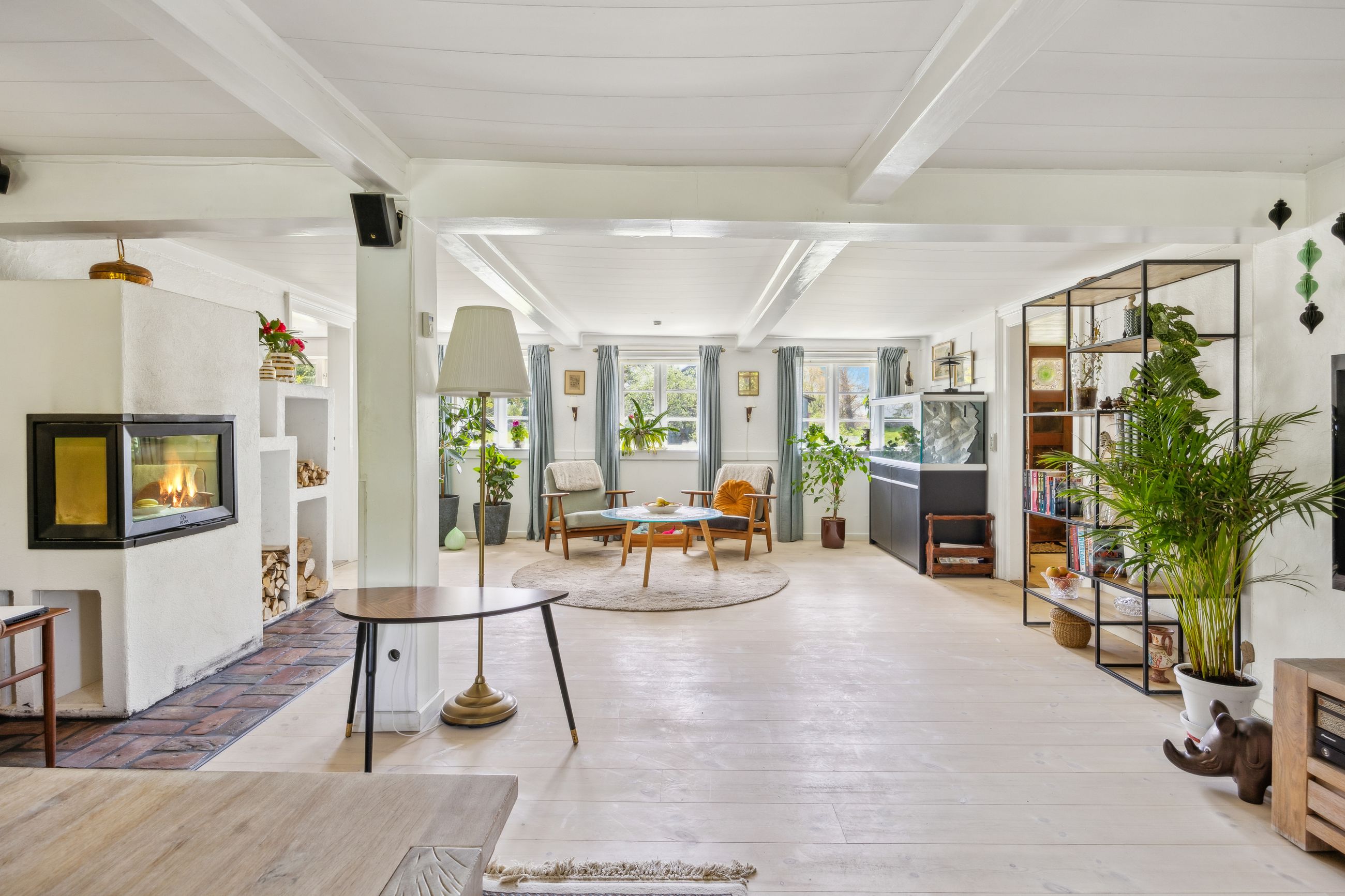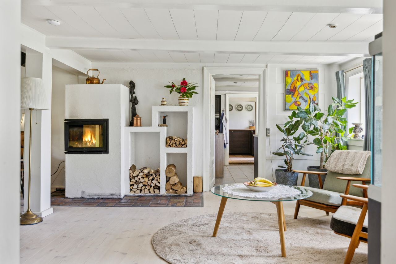 Indenfor finder du et stilfuldt IKEA-køkken fra 2016 med tilhørende viktualierum / vinkælder, alt i skabe og skuffer samt hårde hvidevarer fra Siemens StudioLine og som sammen med det rummelige køkken-alrum/stueområde fungerer som husets hjerte. Her kan familien samles om måltiderne eller slappe af i de hyggelige omgivelser ved den indbyggede pejseindsats.