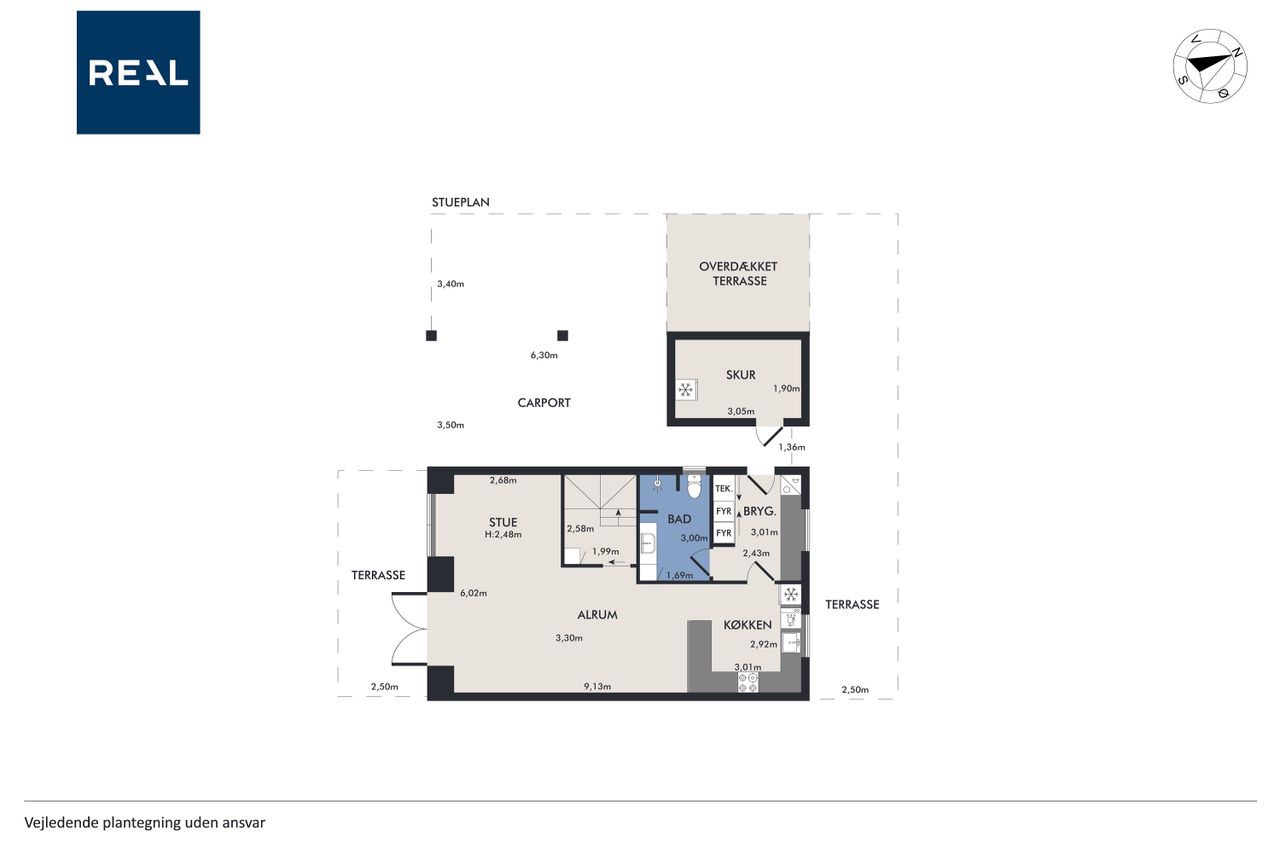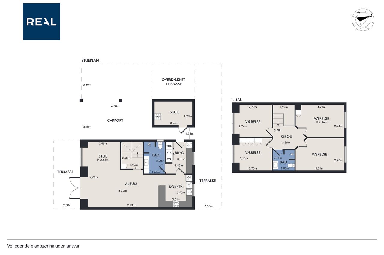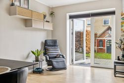 Indenfor byder huset på en gennemtænkt planløsning med et åbent køkken-alrum, der fungerer som hjertet i hjemmet. Her kan familien samles om madlavning og hyggelige stunder, mens lyset strømmer ind gennem de store vinduer. Boligen rummer fire velproportionerede soveværelser, hvilket giver god plads til både børn og gæster. Praktisk nok findes der badeværelser både i stueplan og på første sal, hvilket sikrer nem adgang fra alle værelser.