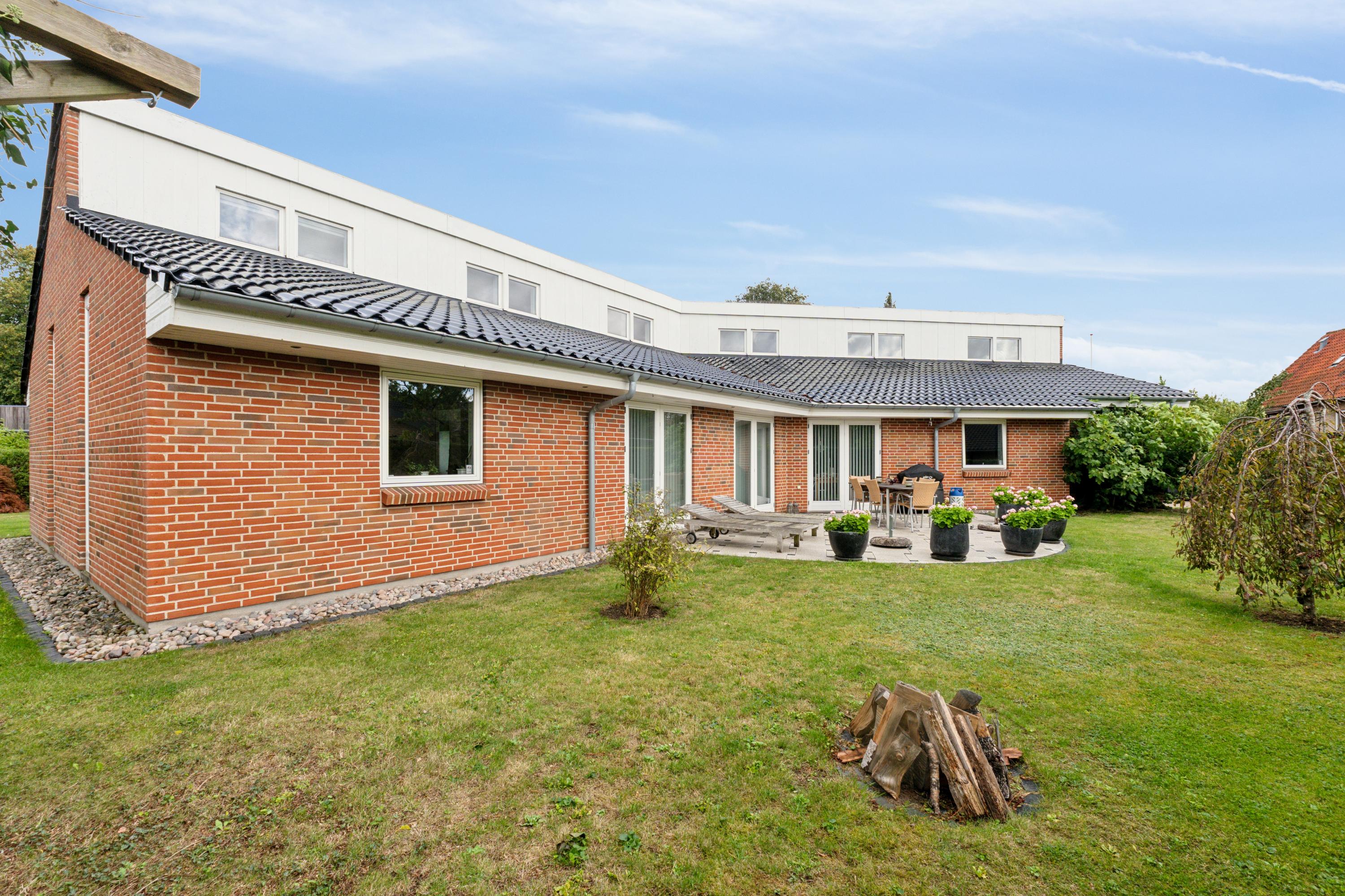 Huset er opført i klassiske materialer med rød mursten og sort tegltag, og indendørs mødes du af en gennemtænkt