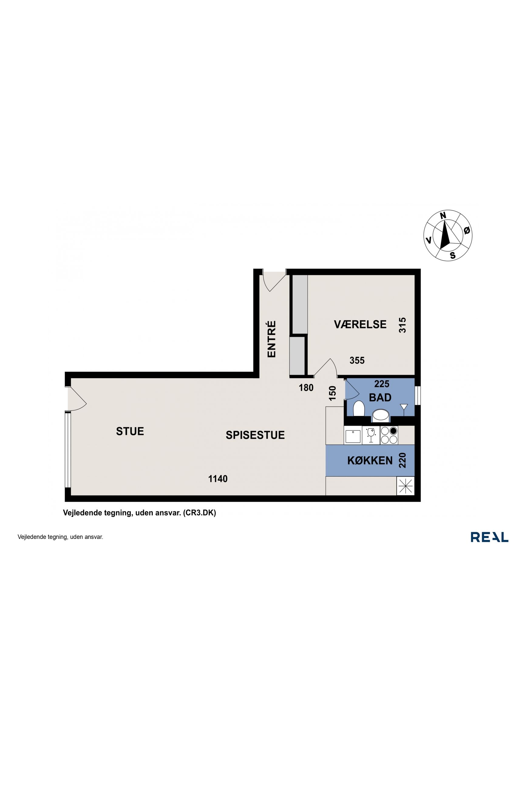 Entréen byder på et praktisk indbygget skab og leder videre ind i et stort, lyst opholdsrum med køkken og stue i åben forbindelse. Stuen har fransk altan og giver rigelig plads til både et stort spisebord og sofaarrangement.