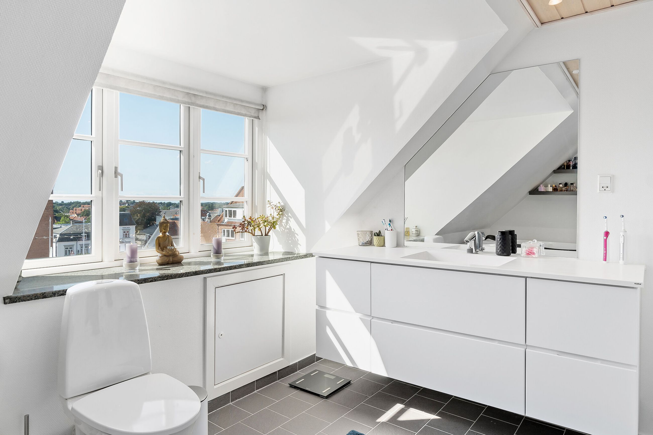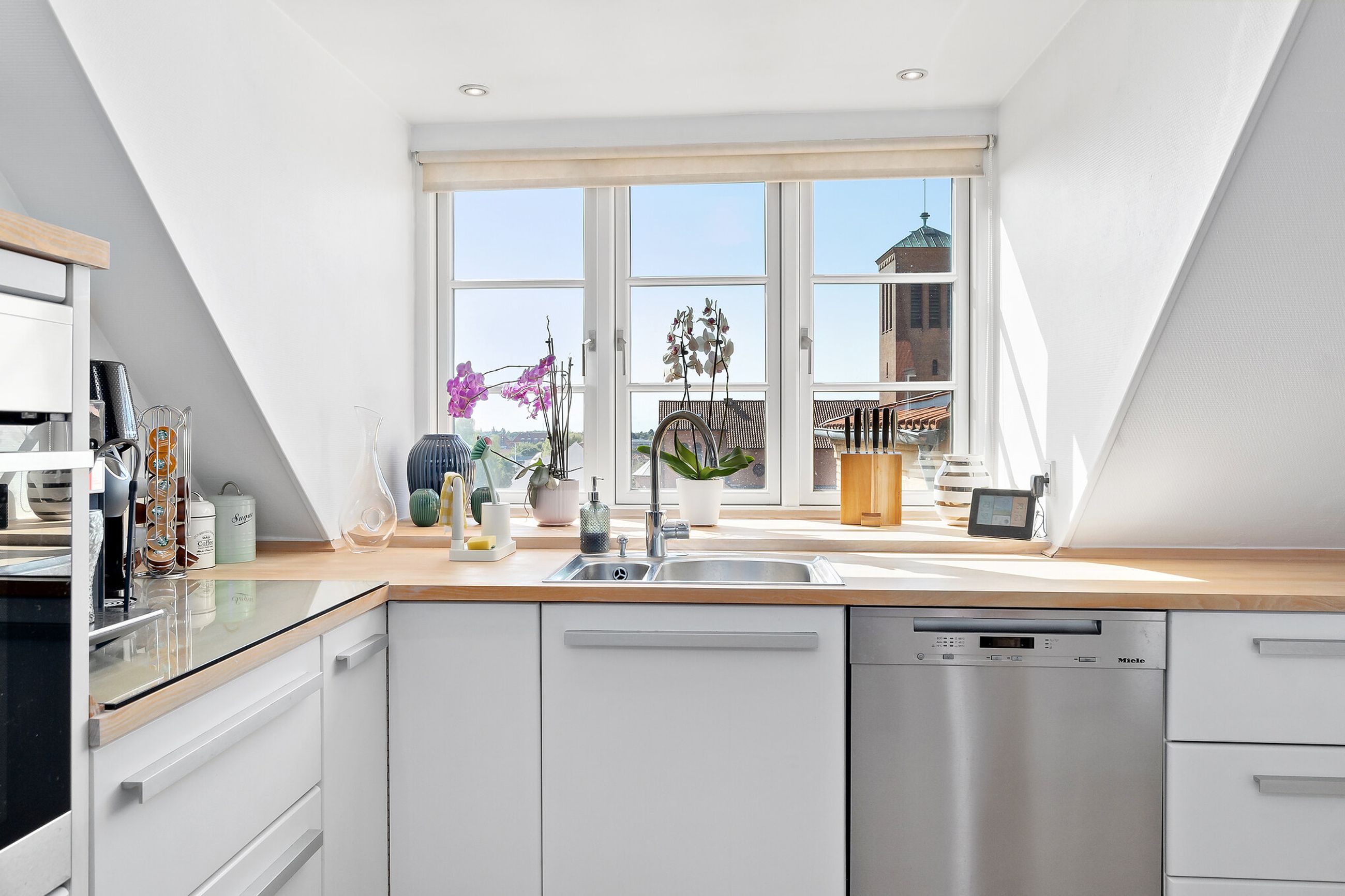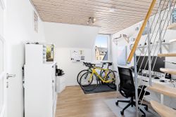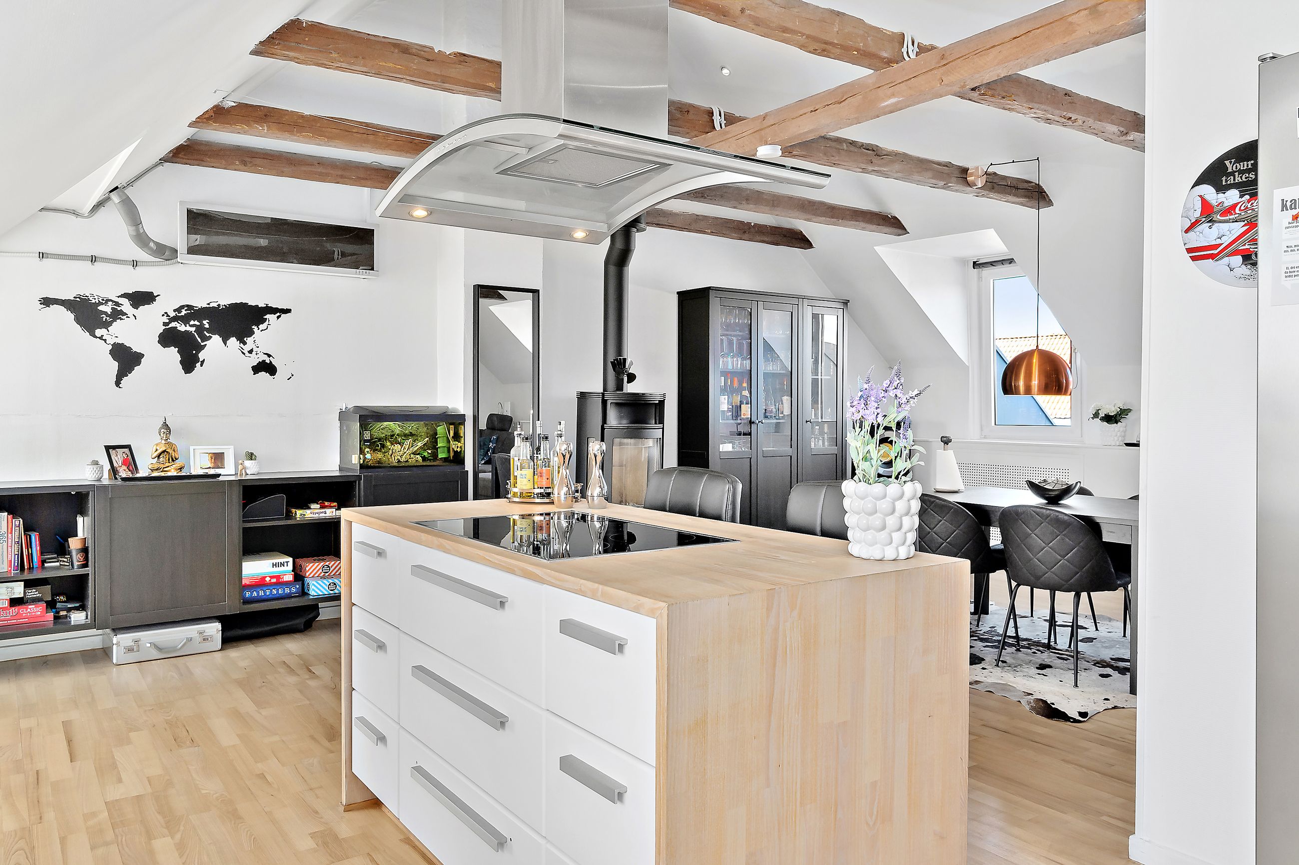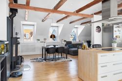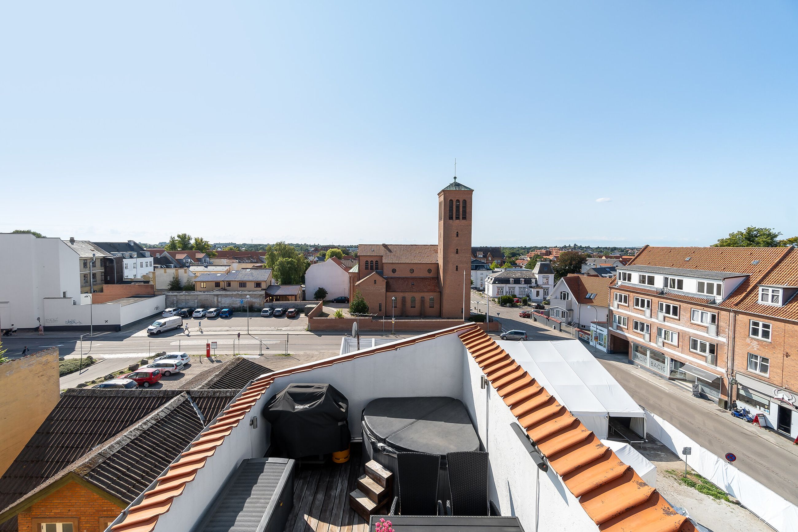 Boligens helt store trumfkort er tagterrasserne, hvortil I kommer fra et sæt døre ved køkkenet. Her kan I tage spabad med udsigt til byens tage, solbade eller sove under åben himmel i skæret fra stjernerne. Tænd grillen og invitér vennerne på et glas koldt hvidvin.