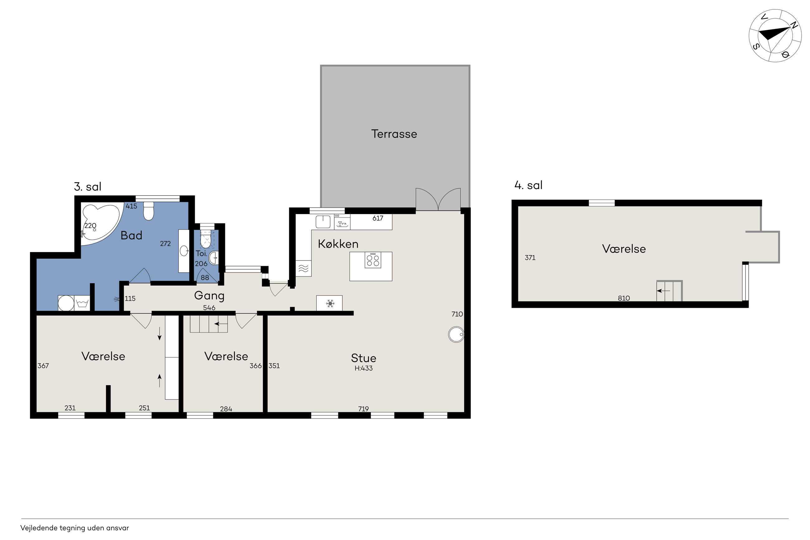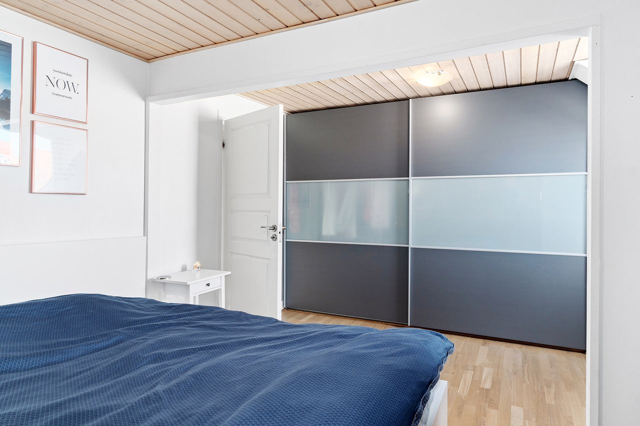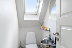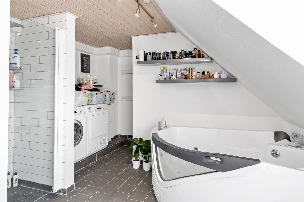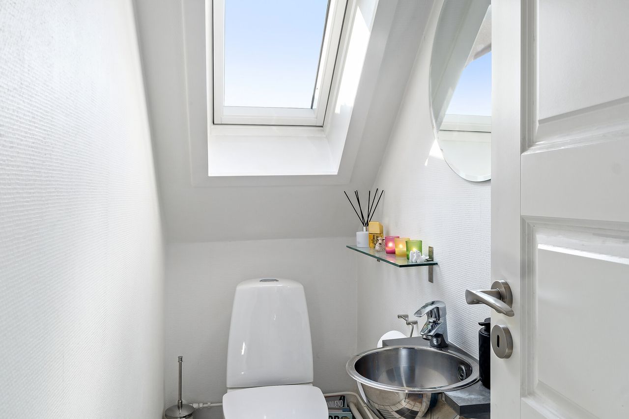 Videre er der et gæstetoilet og et nyt badeværelse fra 2018, hvor der bl.a. er indlagt gulvvarme. Herfra er der nem passage til to gode værelser, hvor det ene er udstyret med indbygningsskabe. Det andet værelse er indrettet med en trappe, der fører til et ekstra værelse.