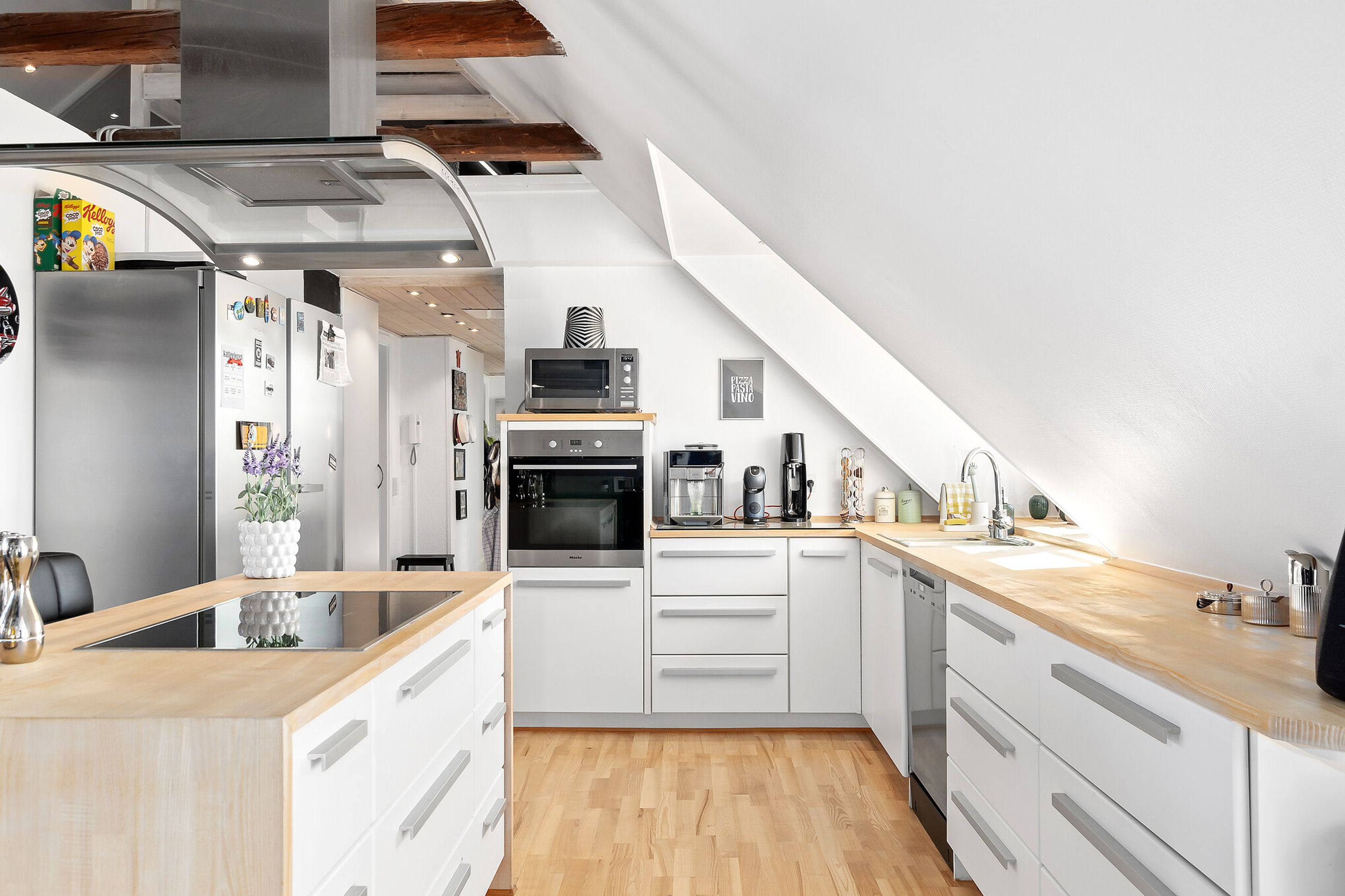 Hjemmets hjerte er det store opholdsrum, der består af stue og køkken i ét. Rummet fremtræder lyst og charmerende med fritliggende, rå loftsbjælker, og brændeovnen er prikken over i’et, hvor familien kan samles i vinterhalvåret. Køkkenet fremtræder flot med Miele hårde hvidevarer, der alle følger med boligen.
