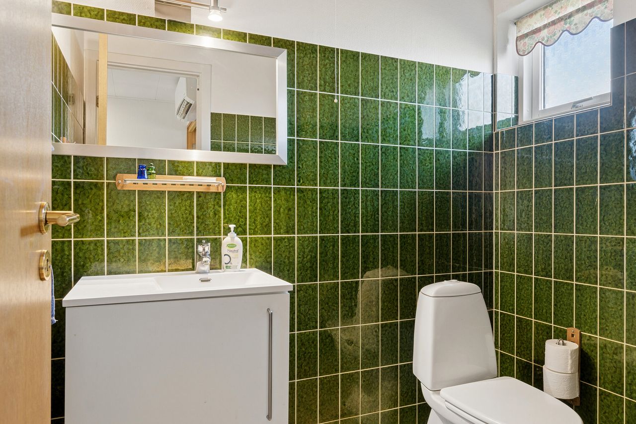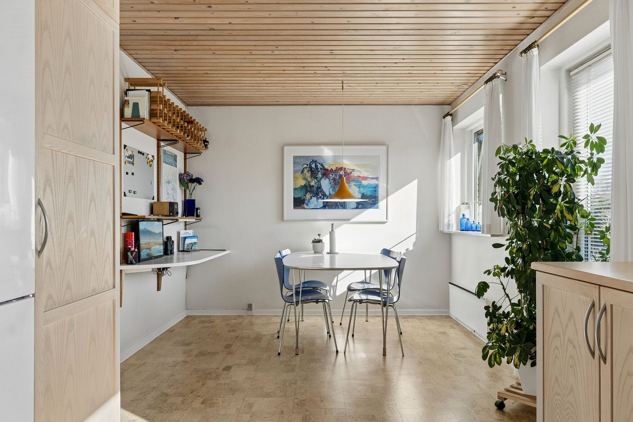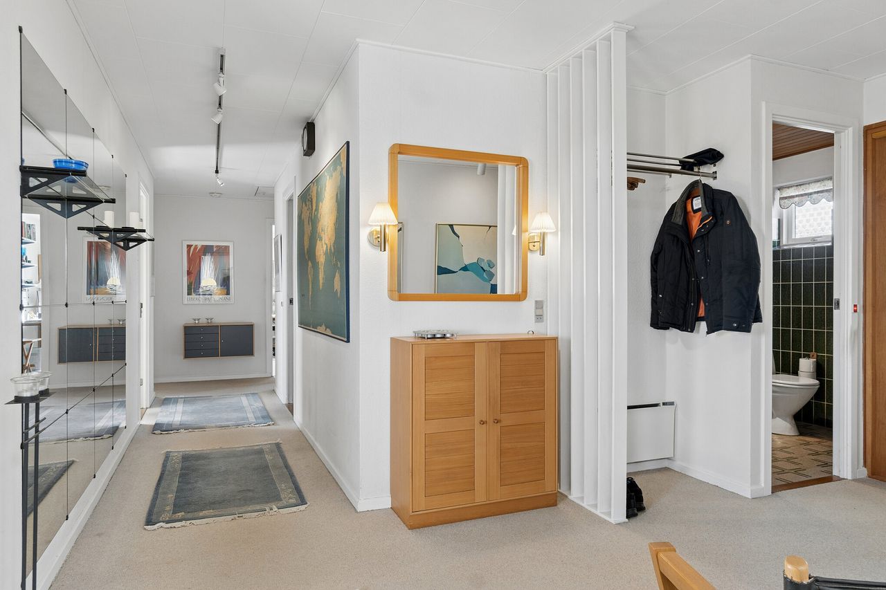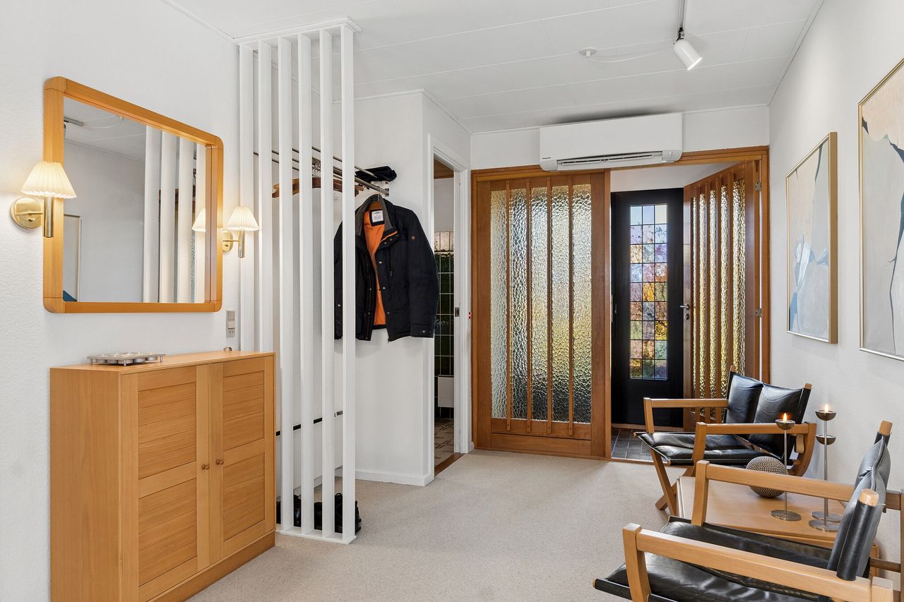 Villaen byder velkommen i en rummelig entré, der åbner op til en fordelingsgang med adgang til et gæstetoilet med gulvvarme. Videre finder I hjemmets samlingspunkt i form af det lyse køkken-alrum, hvor lågerne er opdateret, og her er god plads til at samles omkring spisebordet. I kan også glæde jer over en skøn stue, hvor store vinduespartier trækker havens liv helt ind i rummet. Ejendommen byder videre på tre værelser samt et badeværelse med kar, bruseniche og jeres egen sauna, mens et funktionelt bryggers gør hverdagens logistik enkel.