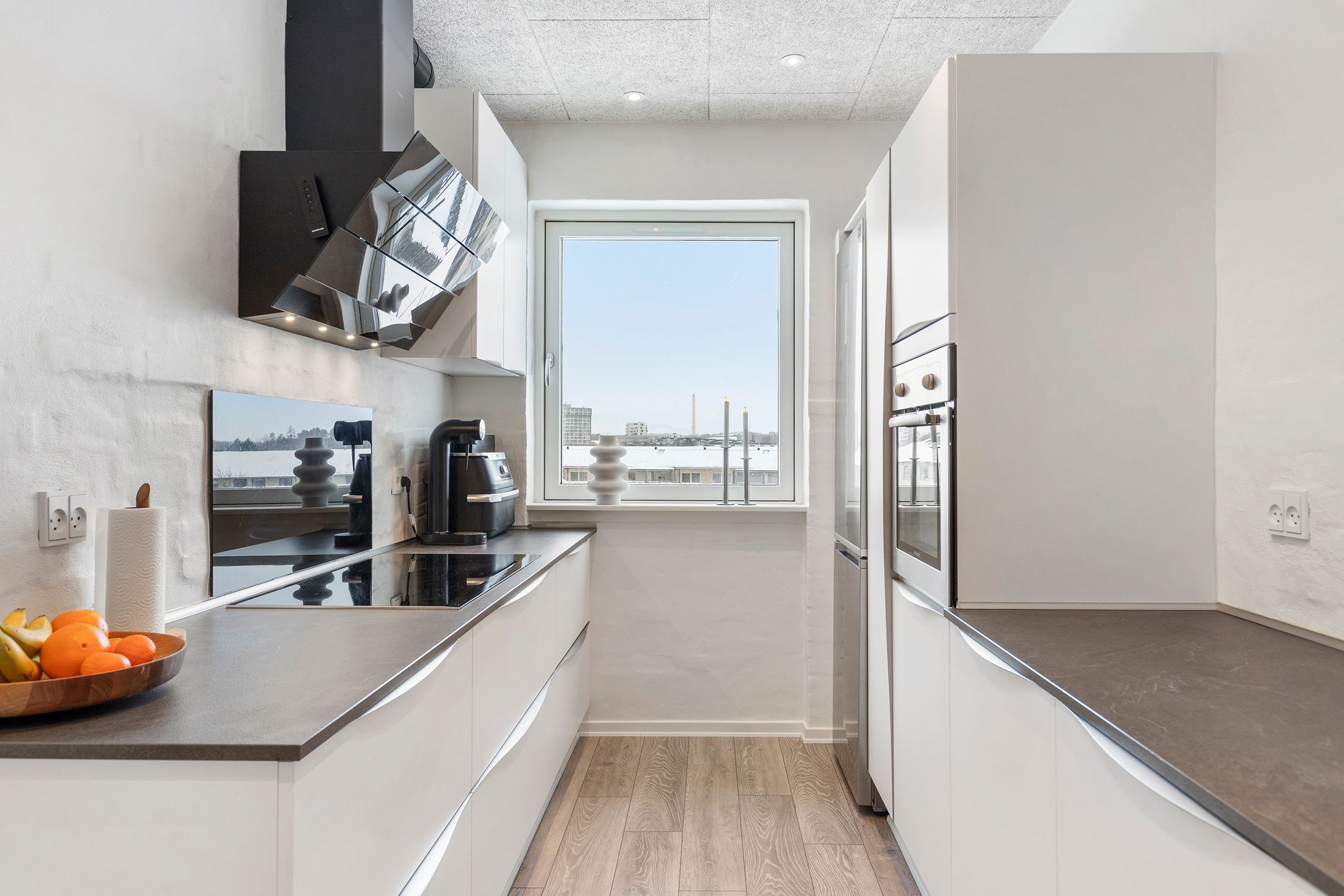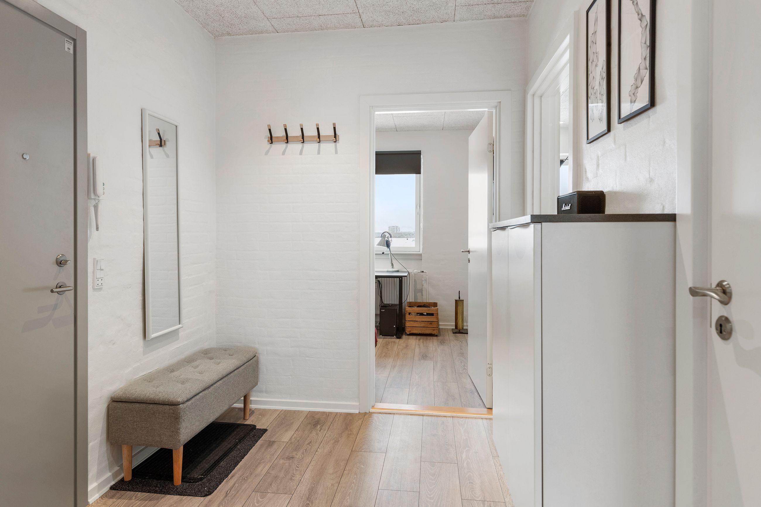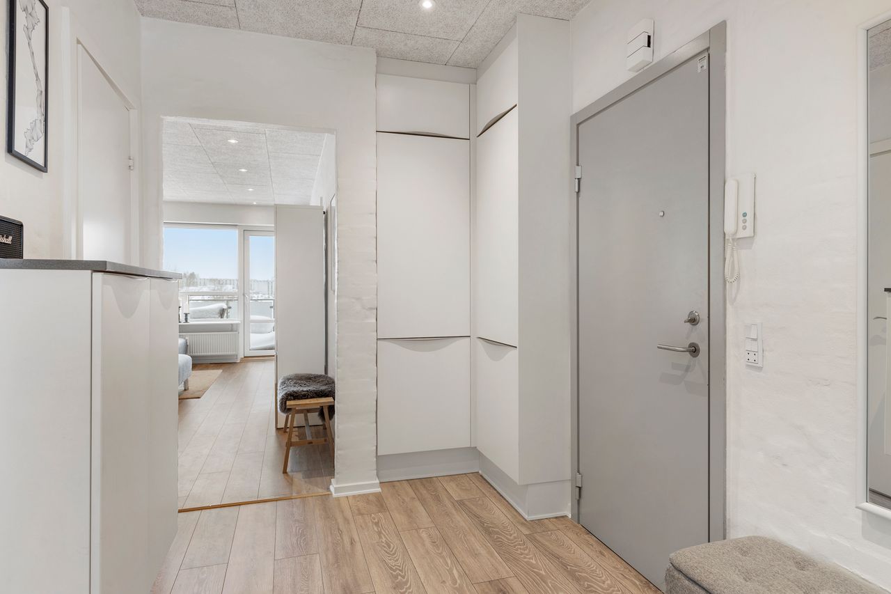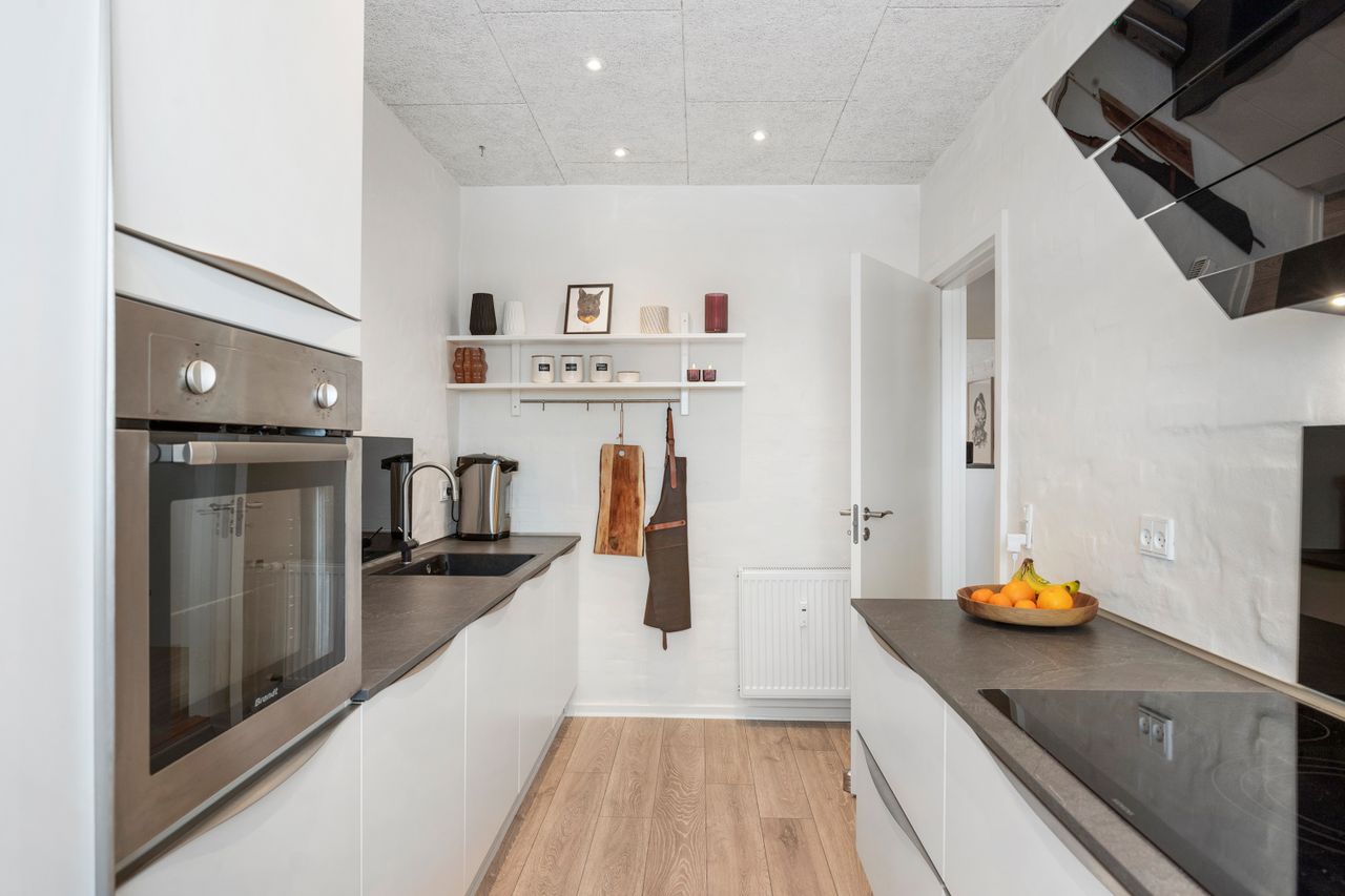 Man bydes velkommen i en rummelig fordelingsentré med god plads til overtøj og adgang til alle boligens rum. Køkkenet fra 2017 er tosidet og byder – foruden alt i hårde hvidevarer – på masser af bord- og skabsplads. Her er rig mulighed for at udfolde sig kulinarisk i et flot køkken i lyst design.
