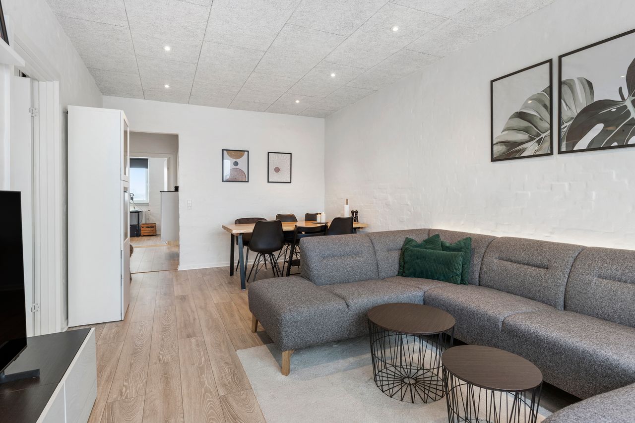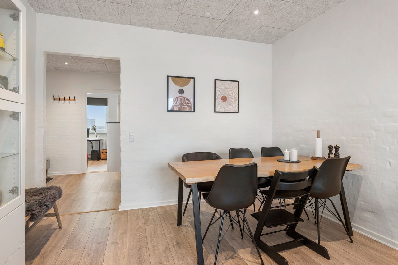 Boligen gennemgik i 2017–2018 en markant renovering og fremstår i dag lys og tidssvarende hele vejen igennem – blandt andet med skønne Troldtekt-lofter med spots samt flotte pudsede murstensvægge. Senest er gulvene udskiftet i 2024.