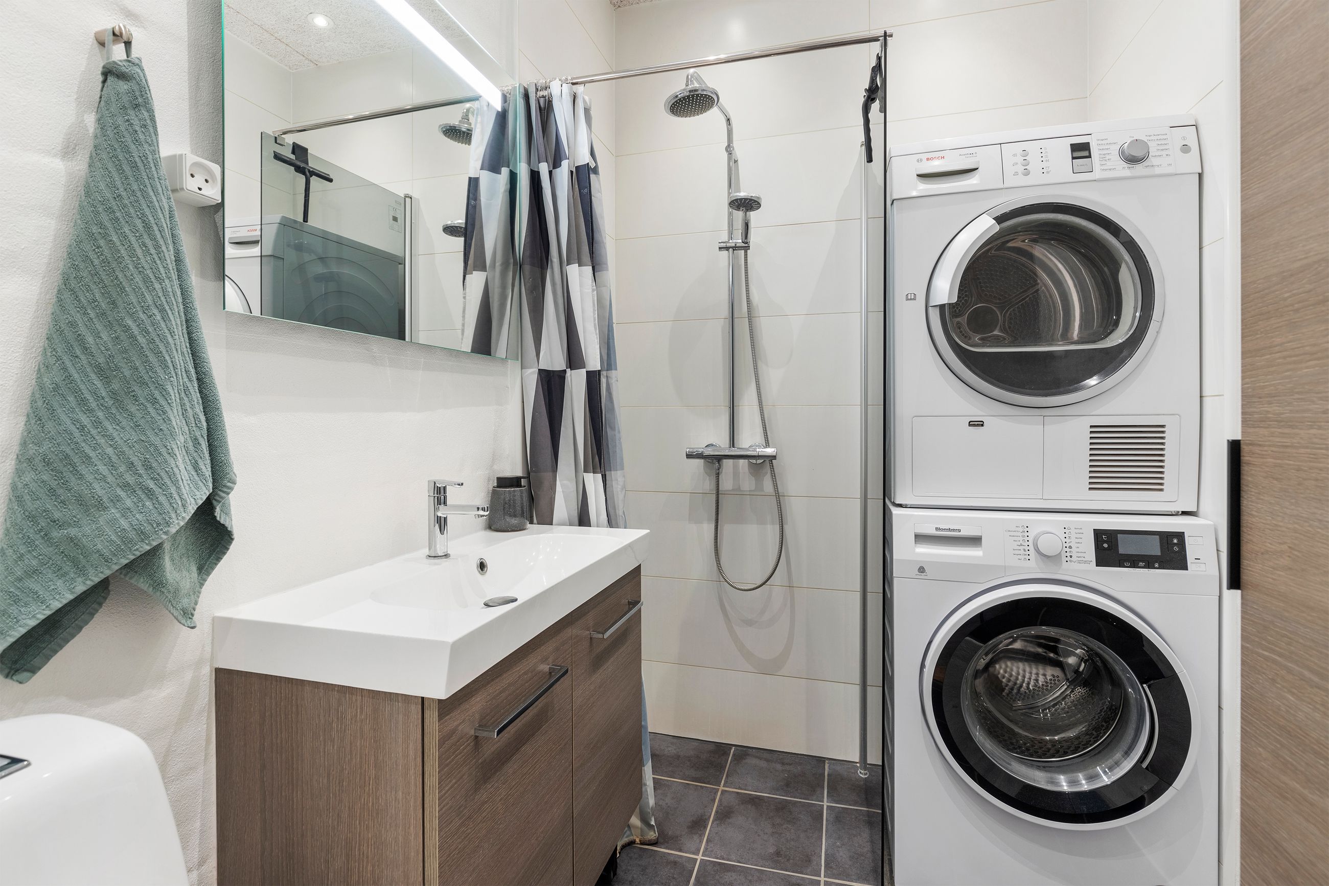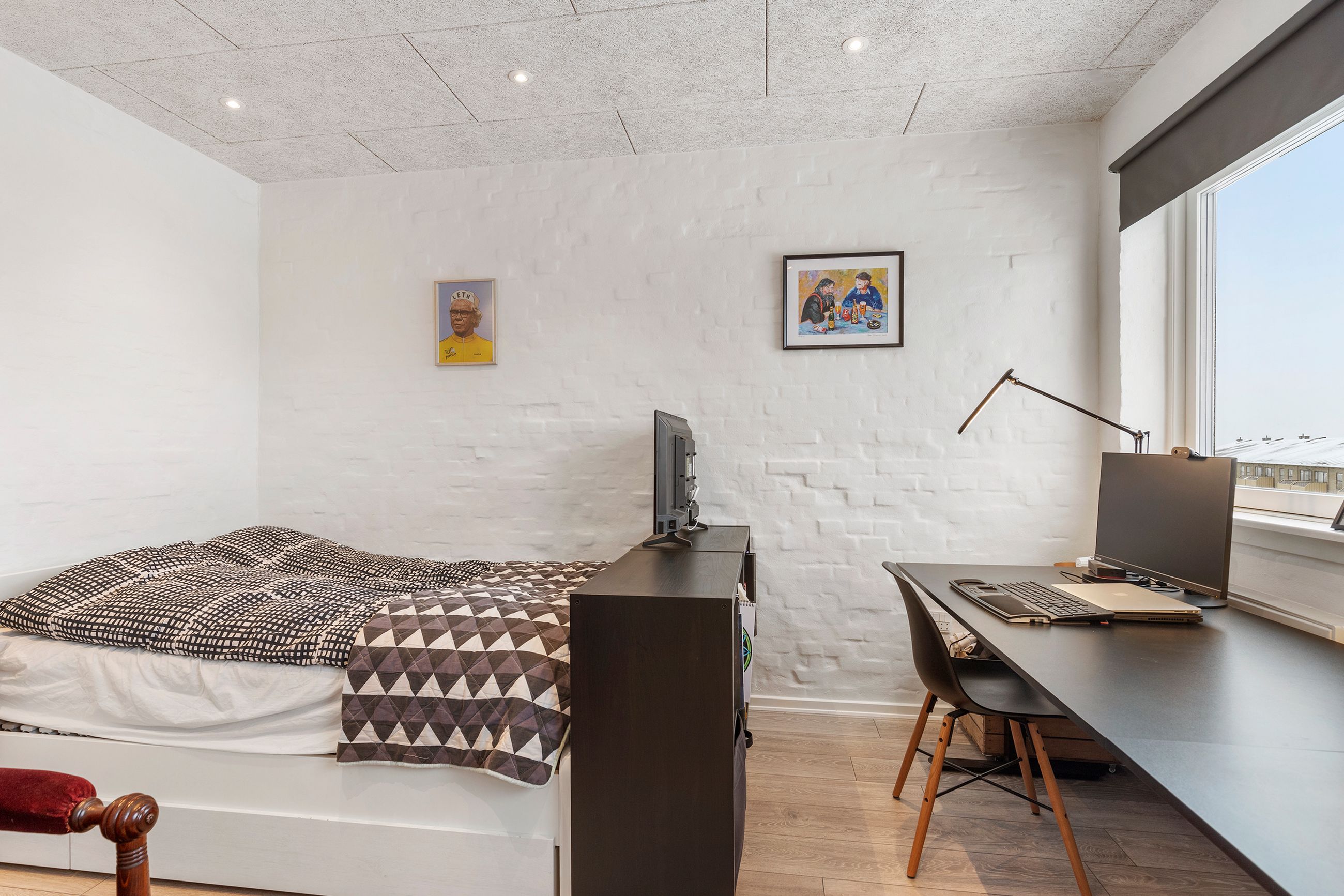 Ved siden af køkkenet ligger et stort værelse, som tidligere har været opdelt i to værelser, og som derfor giver mange indretningsmuligheder. Badeværelset, der ligeledes er renoveret i 2017, fremstår flot med klinker på både gulv og vægge og byder – foruden vaskesøjle – på en stor, rummelig bruseniche.