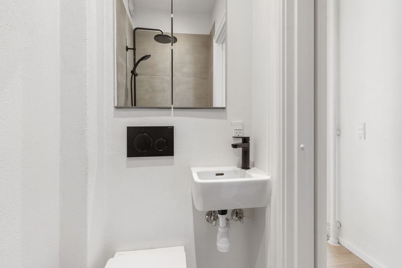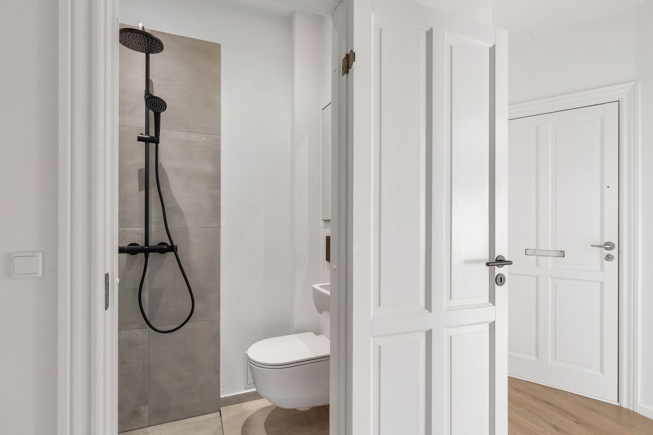 Badeværelset er ligeledes renoveret. Selvom badeværelserne i Øgadekvarteret ofte er kompakte, er pladsen her udnyttet forbilledligt, så rummet både er funktionelt og pænt indrettet.