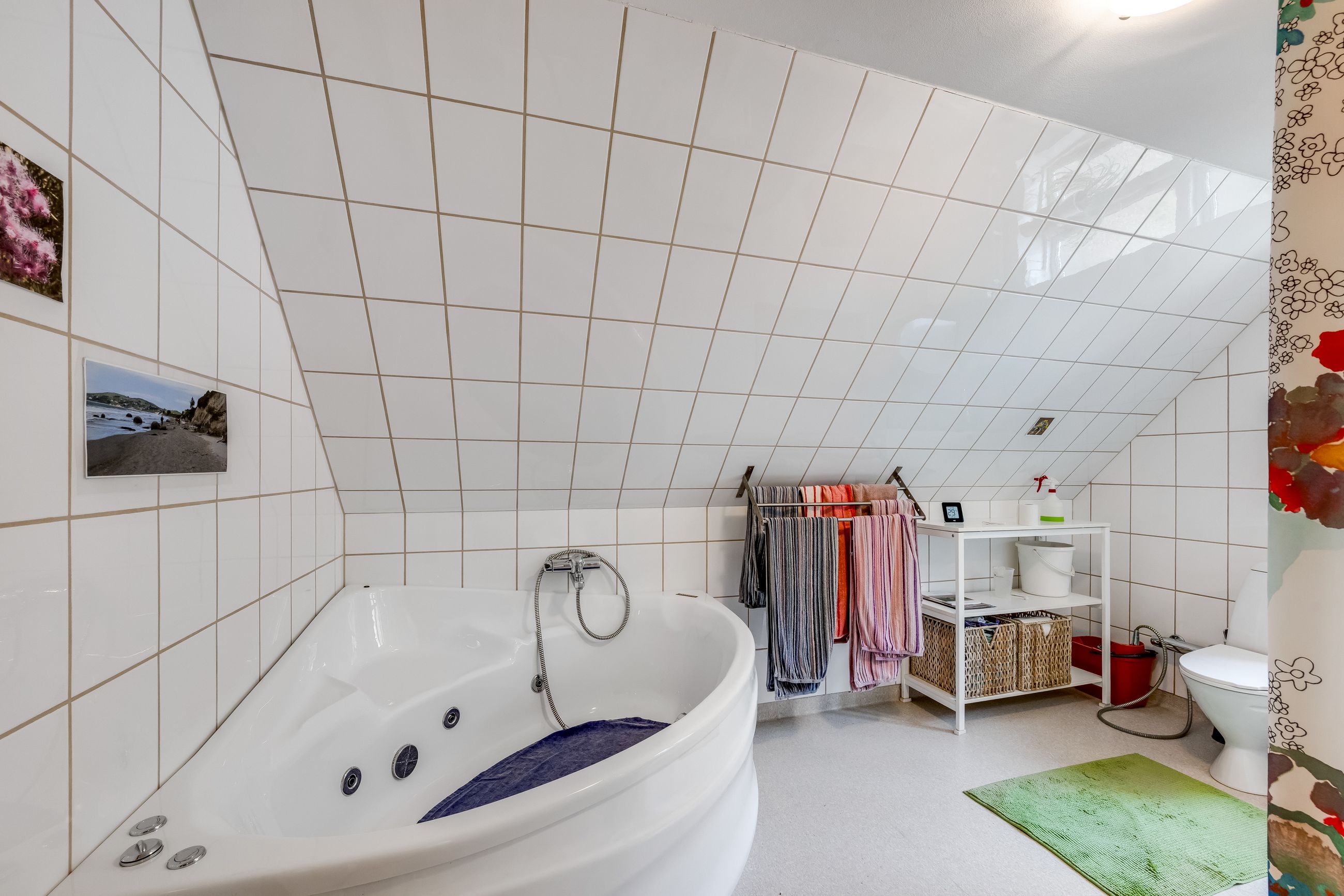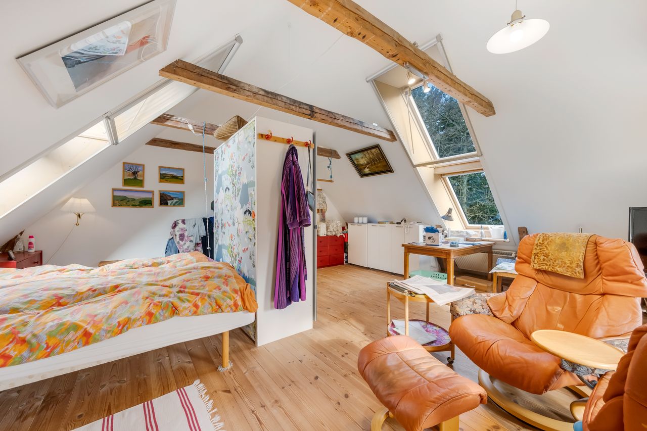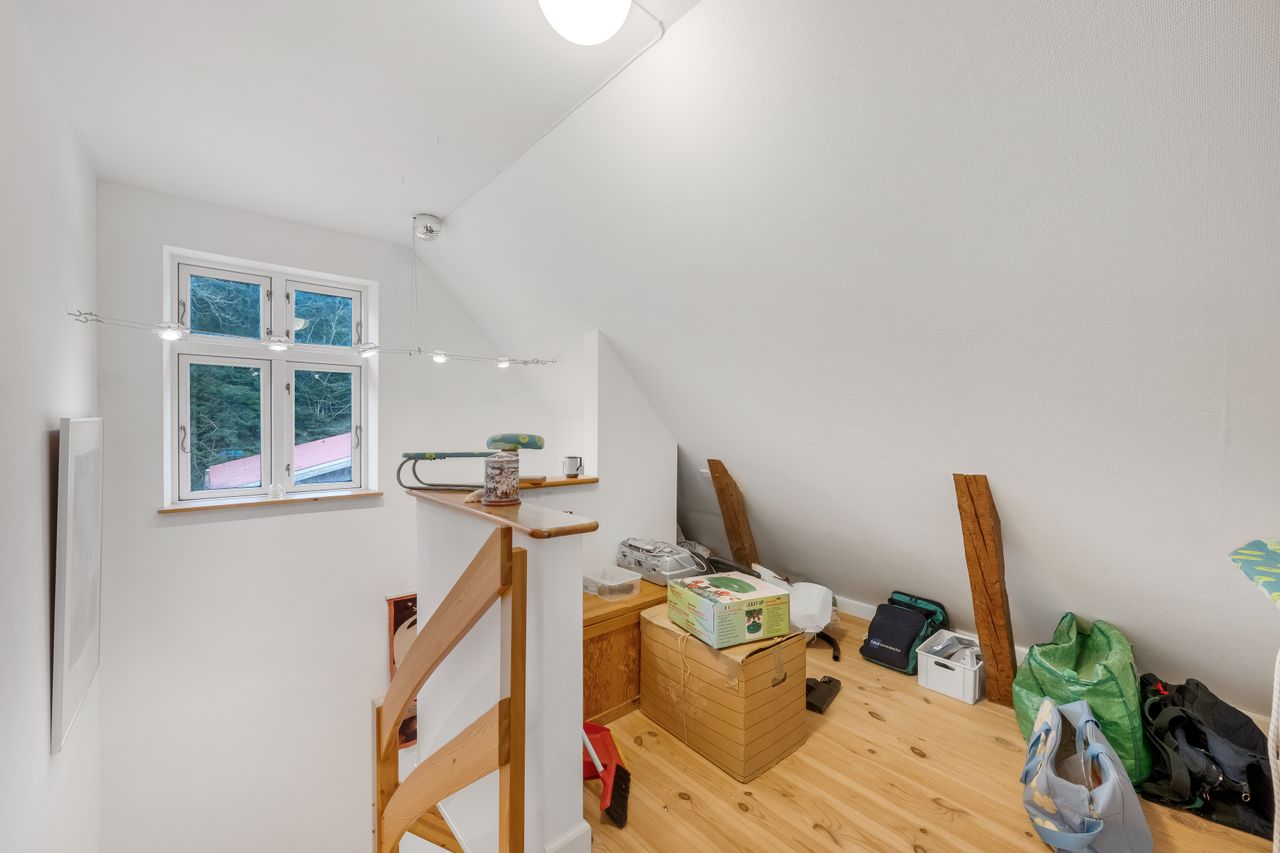 Tagetagen er sat i stand for cirka 20 år siden, og her finder man dejligt badeværelse med hjørnespa og bruseniche samt stort dejligt, lyst opholdsrum med ovenlysvinduer og loft til kip.