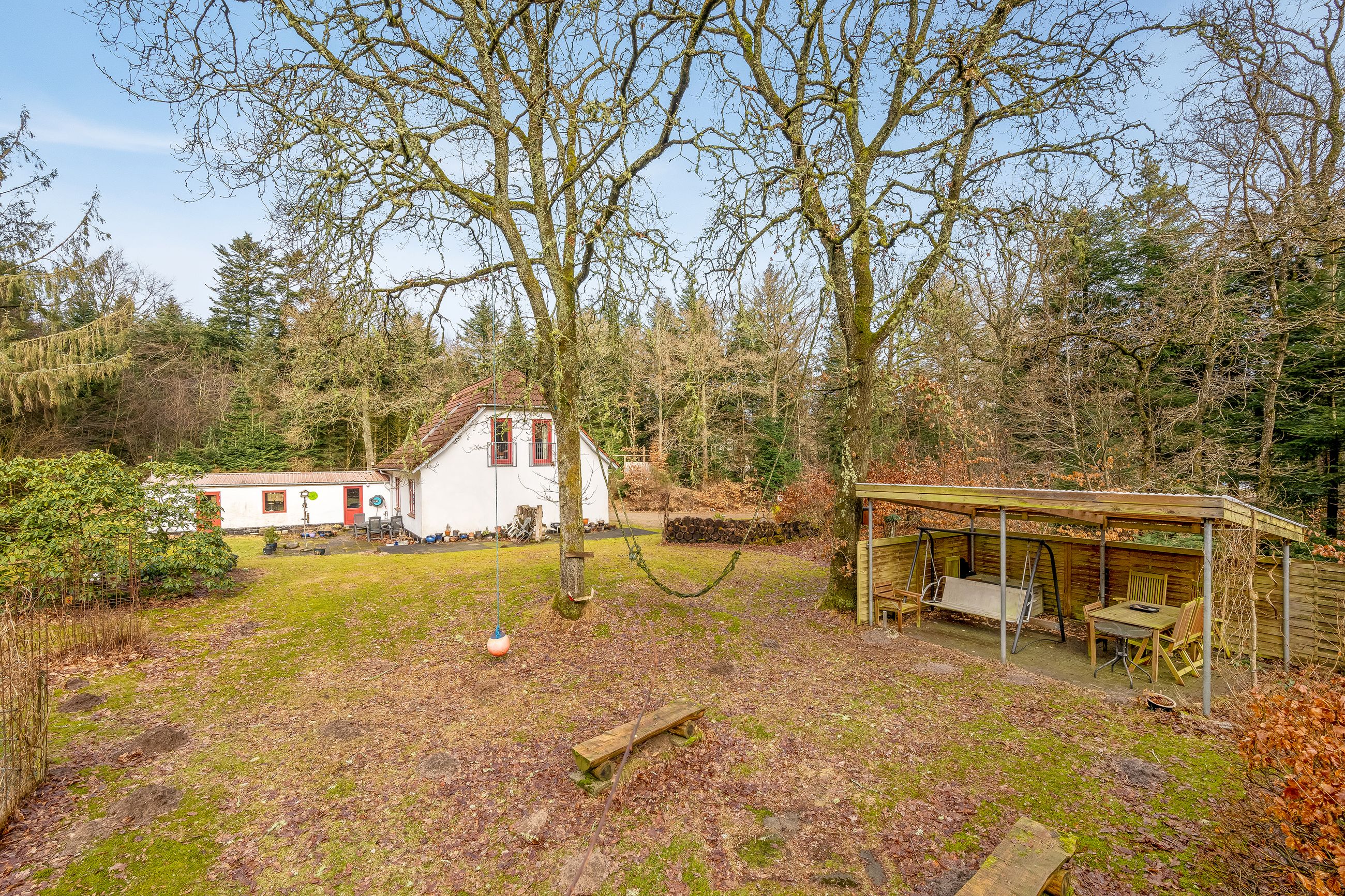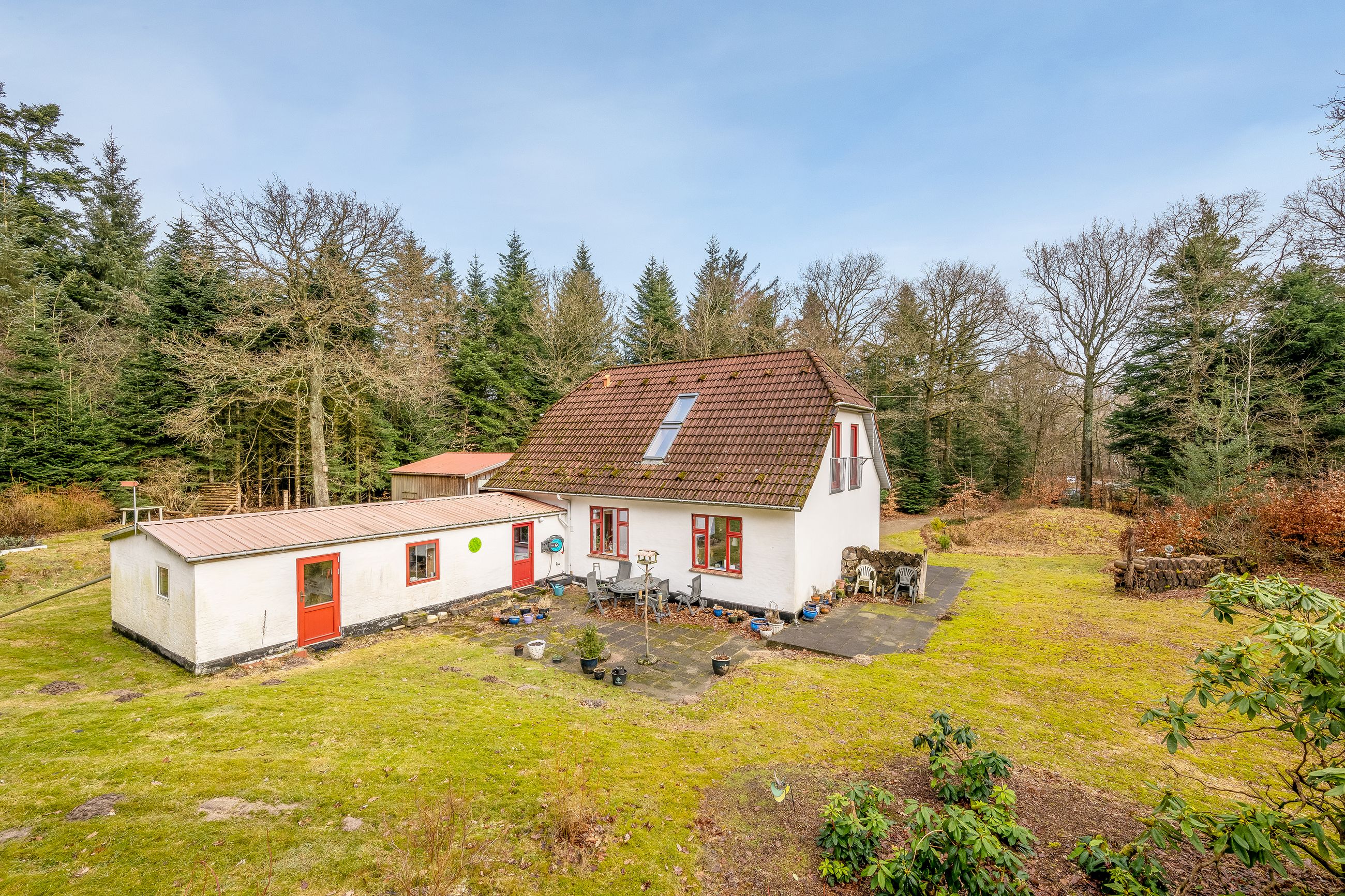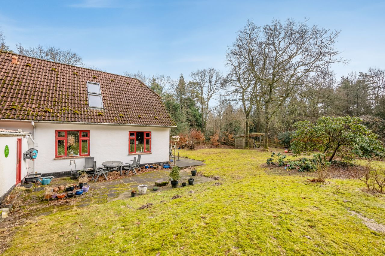På cirka 8.000 kvadratmeter stor skovgrund og med Blåbjerg Plantage som nærmeste nabo tilbydes denne meget hyggelige fritliggende, hvidpudsede villa, der har betonsten på taget. Denne skønne naturgrund har hyggelige stier og unikke opholdssteder, hvor man kan nyde roen og lade tankerne fare.