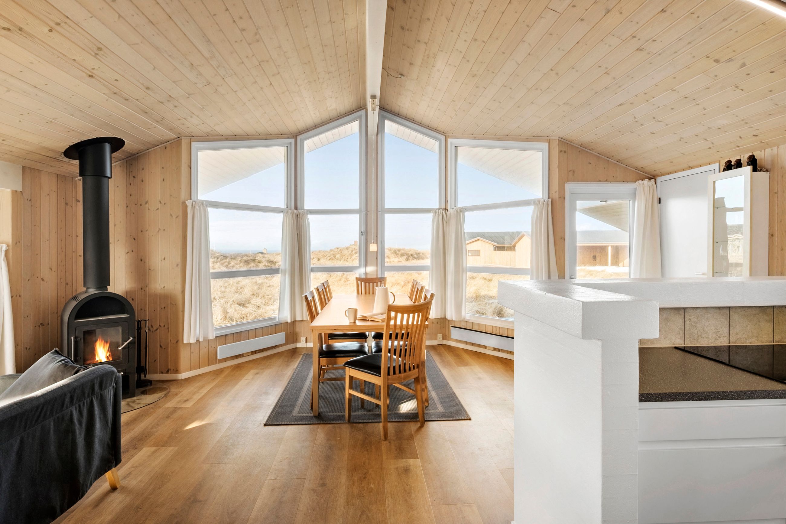 Fra den indbydende entré træder du ind i husets naturlige samlingspunkt – det hyggelige køkken-alrum, hvor der er god plads til både madlavning og samvær. I forlængelse heraf ligger stuen, hvorfra du kan nyde den smukke udsigt til vandet gennem vinduerne.