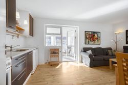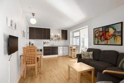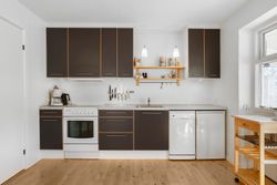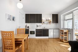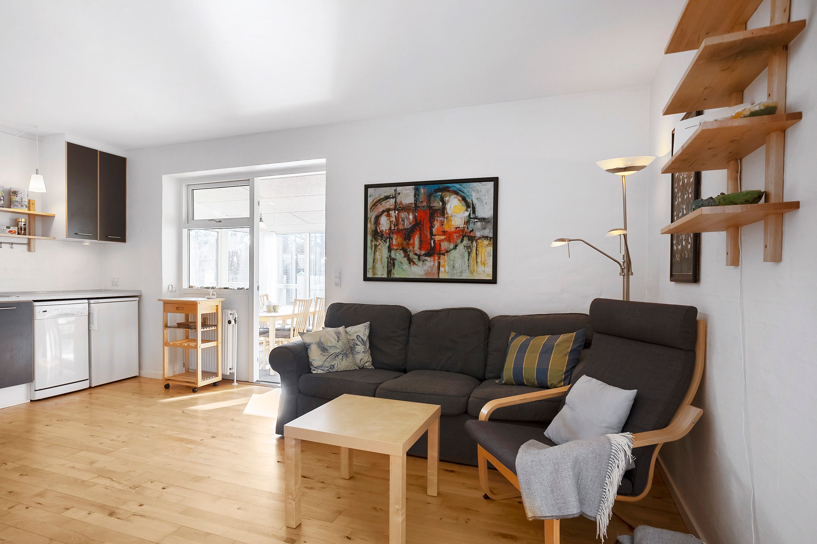 Boligen byder på et indbydende køkken-alrum i åben forbindelse med en dejlig udestue. Her sørger de mange vinduespartier for et fantastisk lysindfald og en skøn udsigt til haven, mens der samtidig er direkte udgang til terrassen, hvor udelivet kan nydes i rolige omgivelser. Køkkenet fremstår pænt og funktionelt og er blandt andet udstyret med opvaskemaskine.