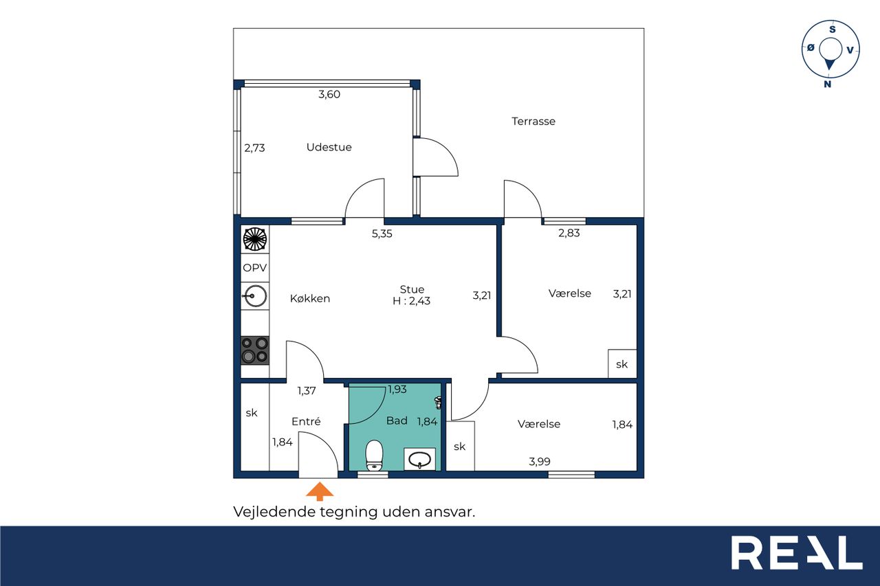 Huset rummer to gode værelser, hvoraf det ene har direkte udgang til den sydvendte terrasse – perfekt til at nyde morgensolen. Derudover findes en entré med god skabsplads samt et rummeligt badeværelse.