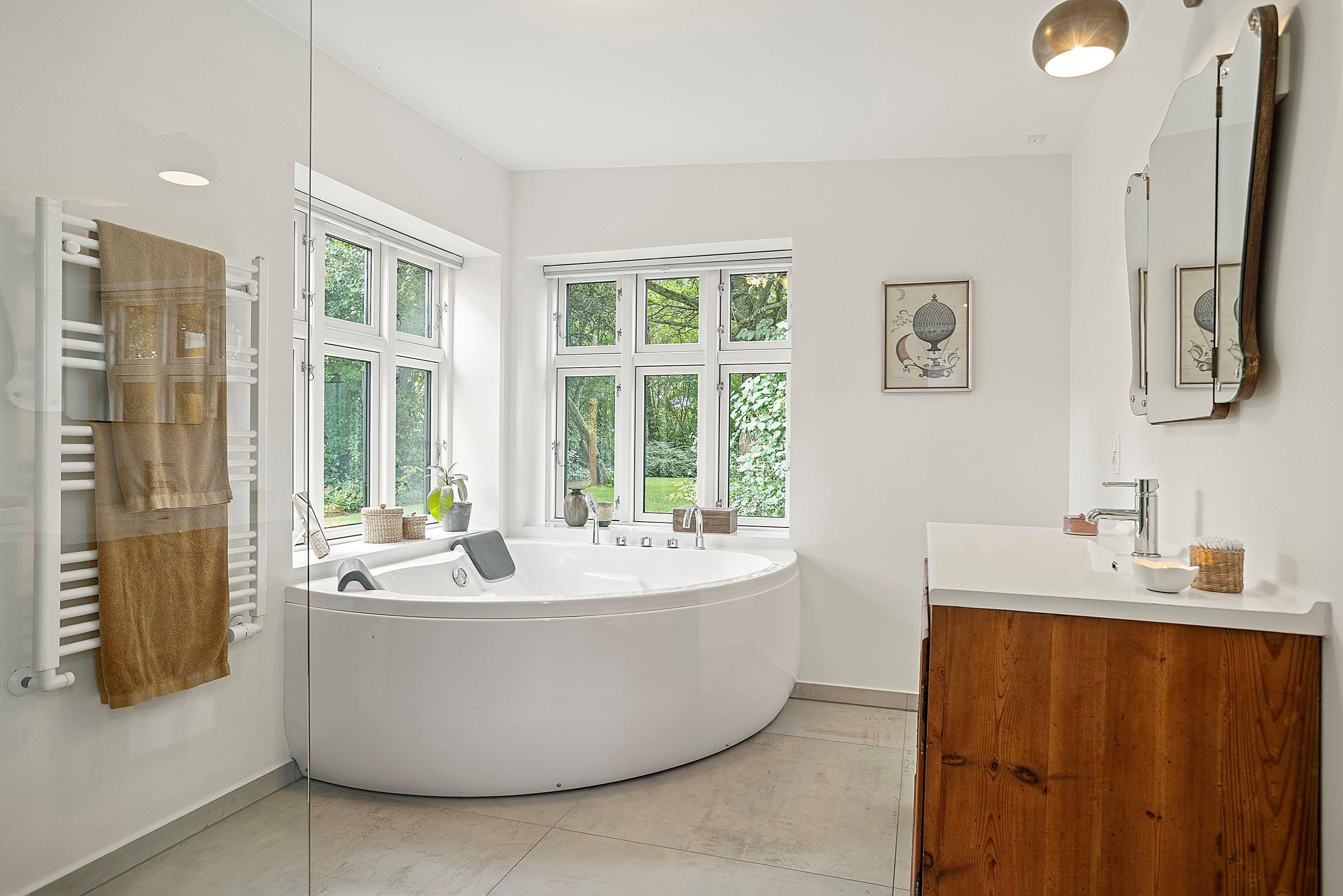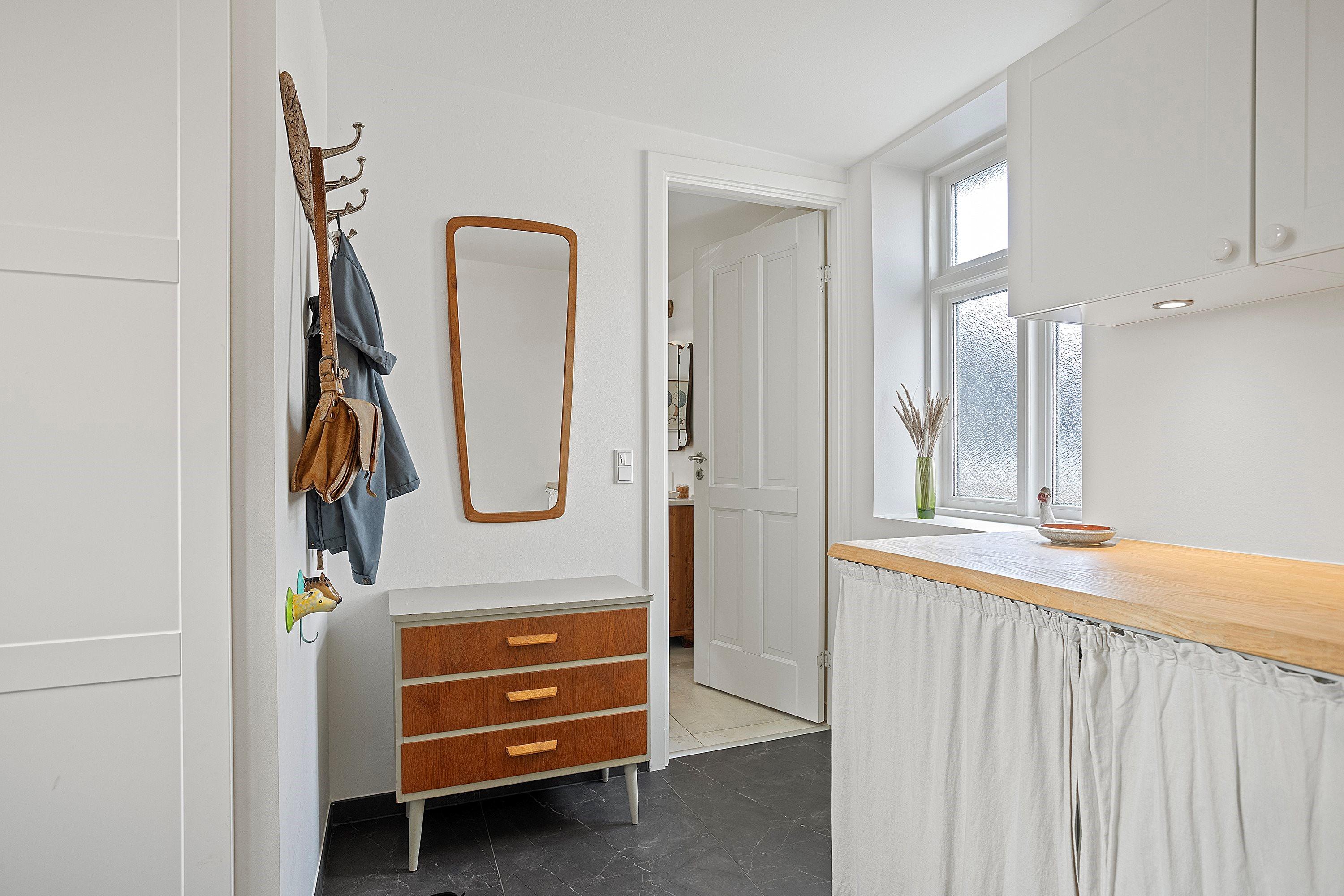 Man kommer ind i lys Entre med vaskesøjle og videre ud i stort badeværelse som både har både bruseniche og spabad. Entre og badeværelse er renoveret i 2018.
