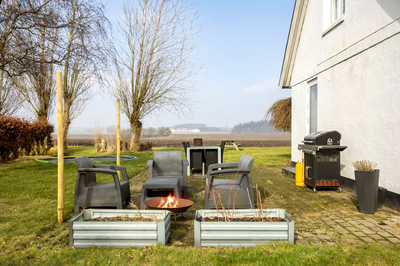Haven er hyggelig og nem at holde, og fra både hus og terrasse er der en fantastisk udsigt over de åbne marker. Området er roligt med gode naboer, og skolebussen som stopper lige ved indkørslen.