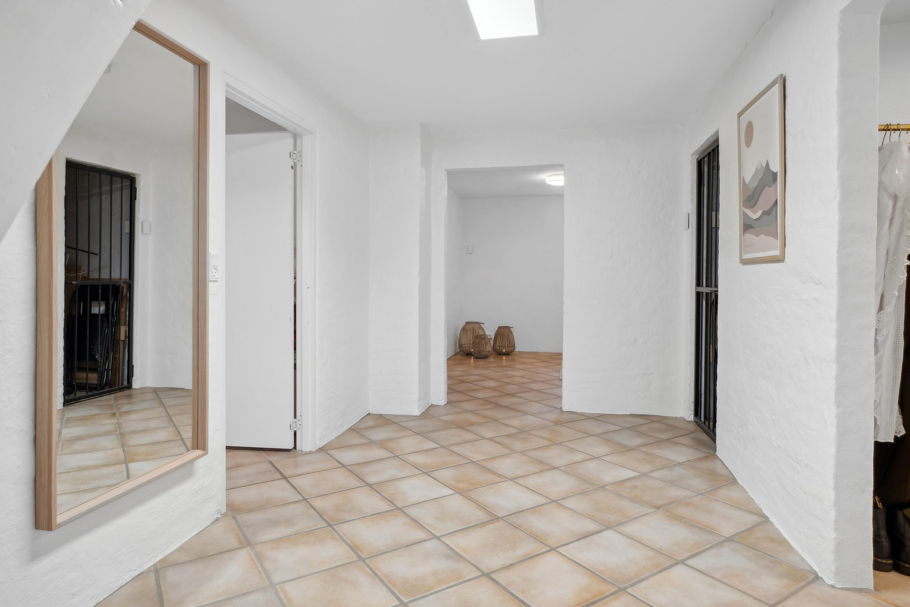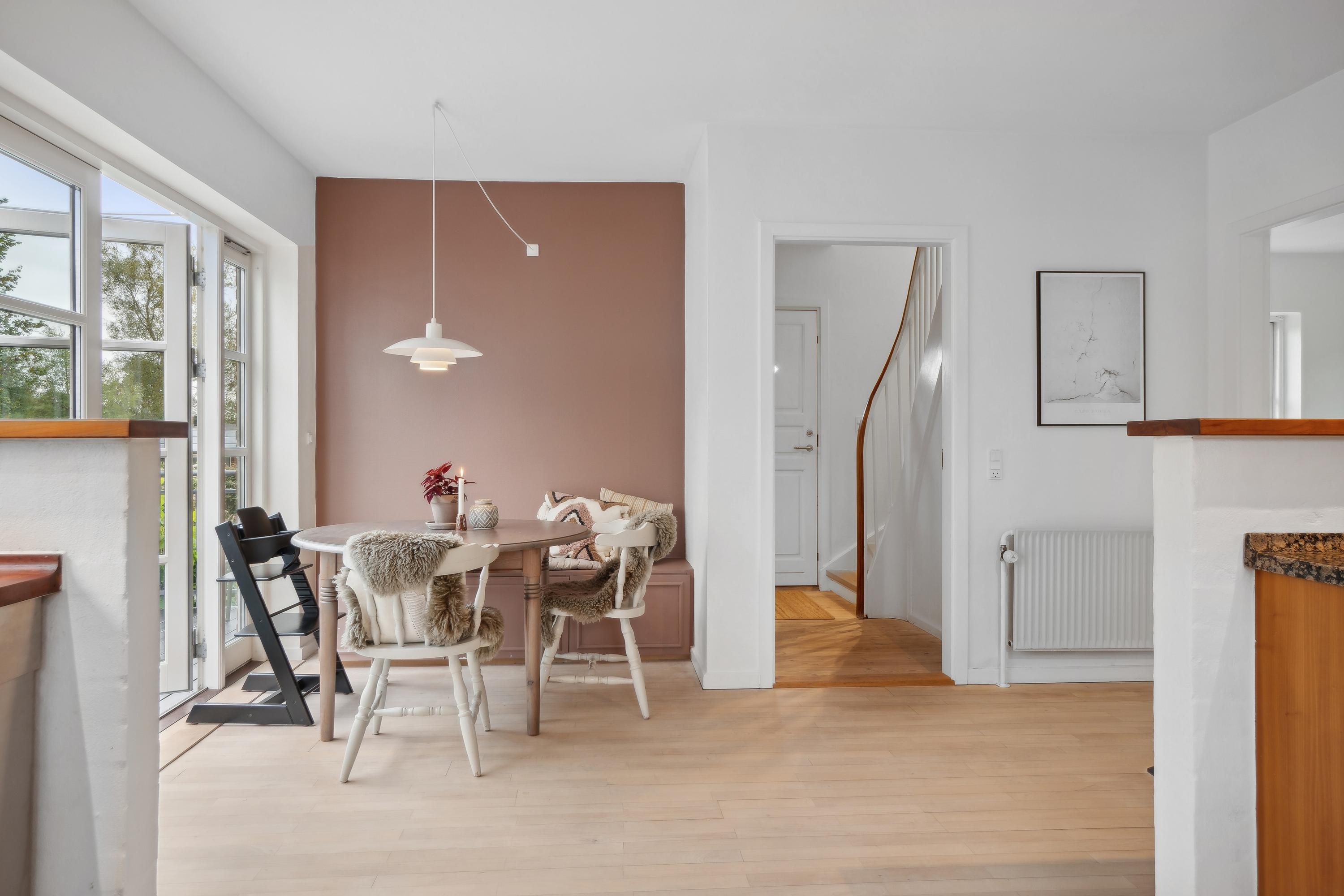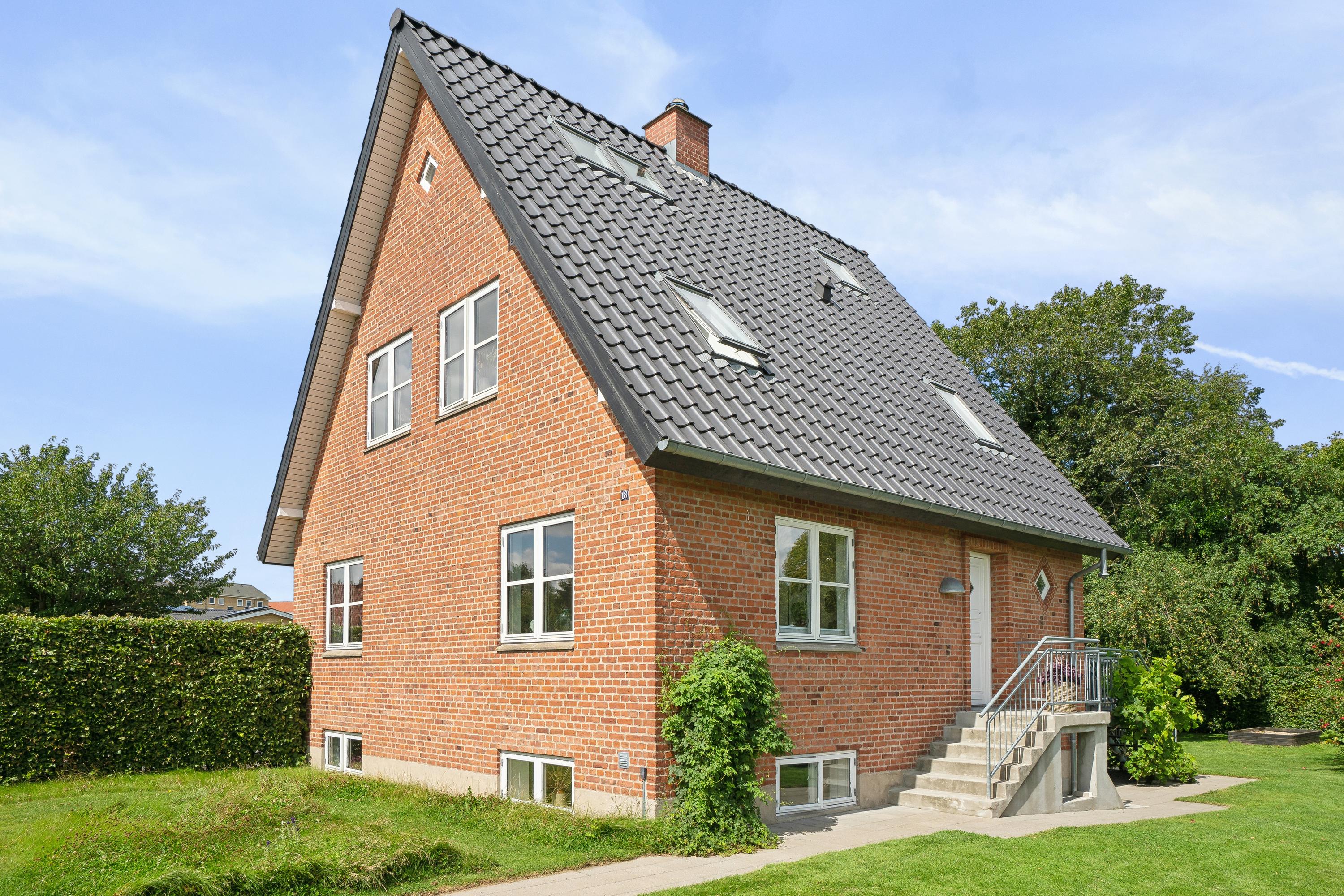 I den flotte rødstensvilla på Frejasvej 18 får I masser af plads med hele 214 boligkvadratmeter, hvor 76 af dem består af en tør kælder med gulvvarme, som er delvist over jordhøjde og dermed højloftet og lys. Villaen har dertil bibeholdt sin charme fra byggeåret 1947 med blandt andet originale