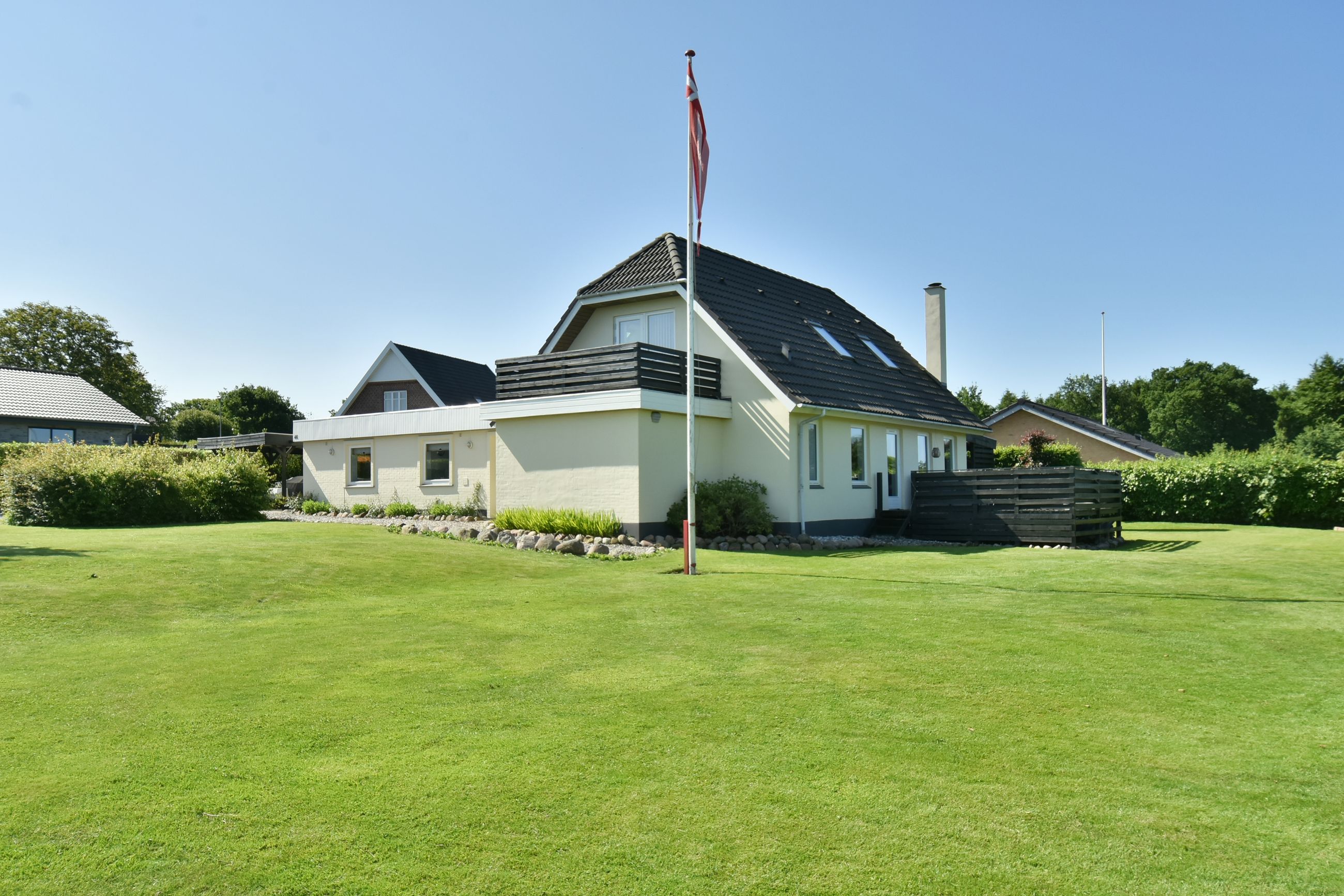 Udenfor venter en stor grund med god luft omkring huset. Her er flere terrasser rundt om huset som inviterer dig udenfor i de varme måneder, mens den skønne private gårdhave tilbyder ro, privatliv og afslapning. Haven er simpel anlagt i græs med få bede og planter. Her har du selv mulighed for at etablere din egen haveoase efter egne ønsker.