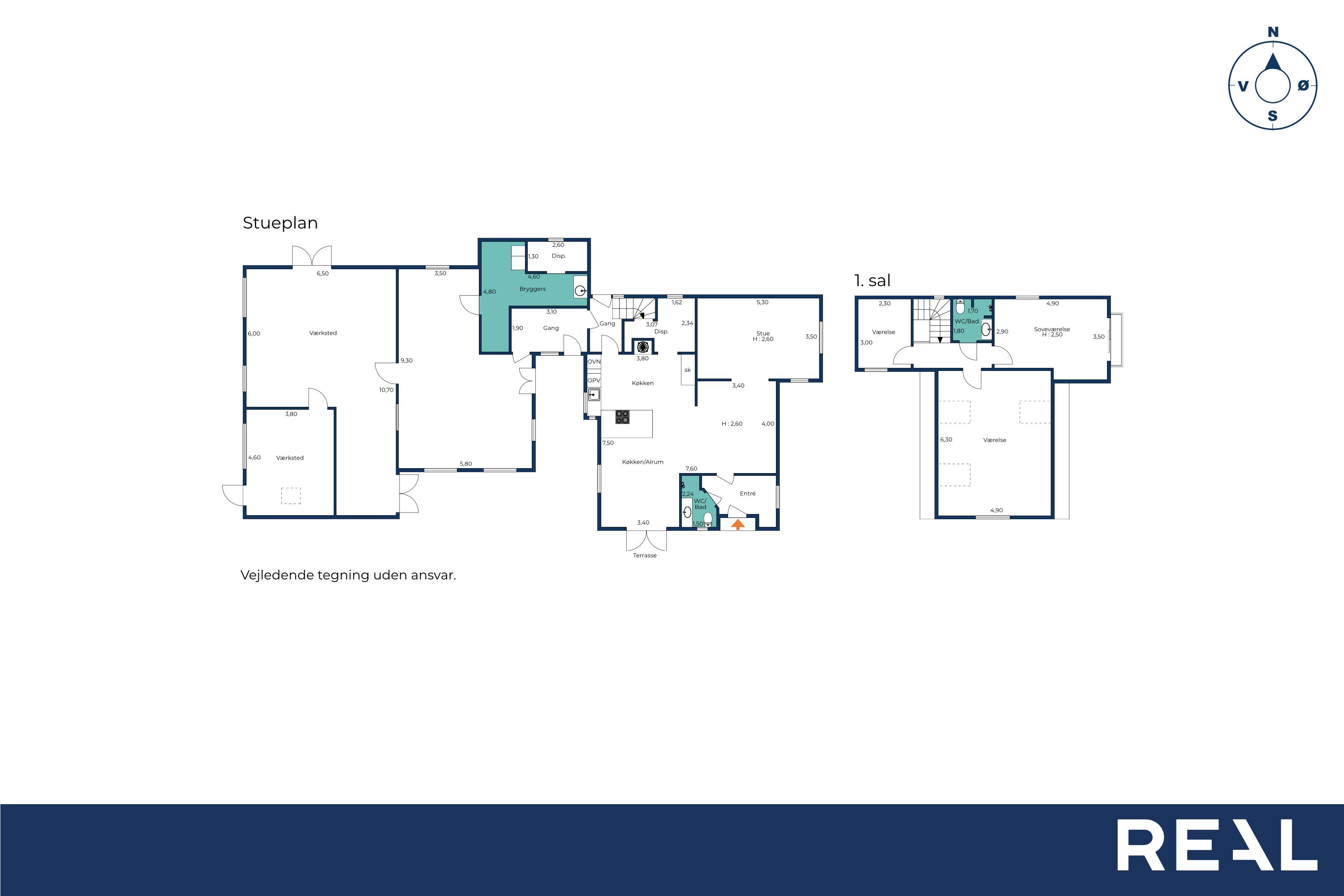 På 1. salen er der 3 gode værelser eller det ene kan bruges som stort multirum med synlige bjælker og masser af gulvplads til leg, gaming, kontor eller hobby  og let at opdele i et ekstra værelse, hvis behovet opstår. Etagen har eget WC, så morgenlogistikken kører uden kø.