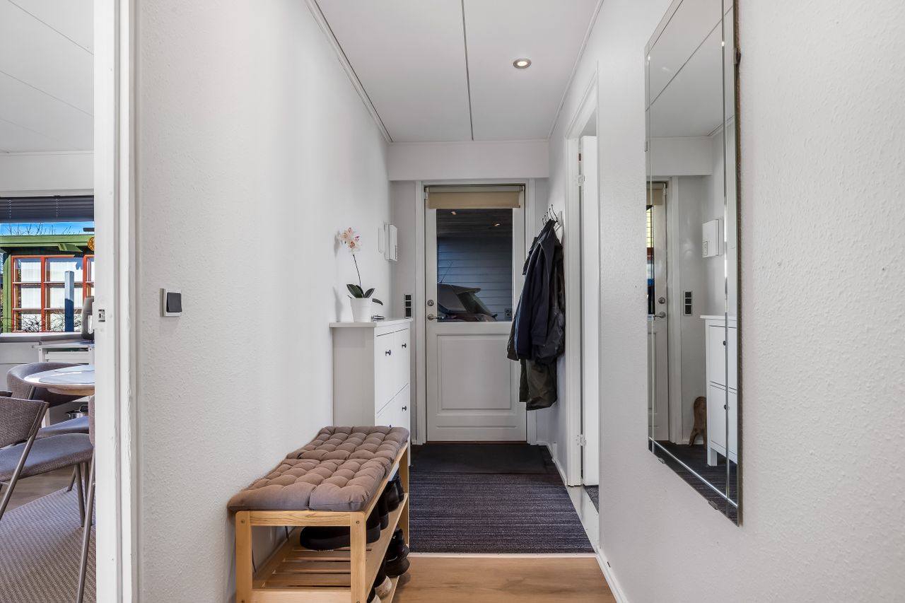 Du bydes velkommen i entré/gang med plads til jakker og sko, hvorfra boligen fordeler sig godt. Her er et ekstra værelse, som kan fungere som børneværelse, gæsteværelse eller hjemmekontor – alt efter hvad behovet er.