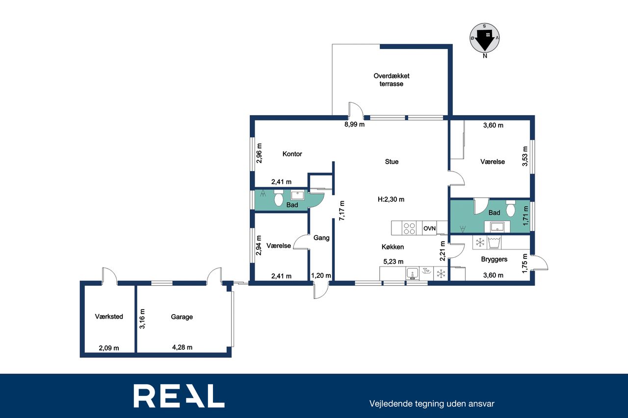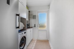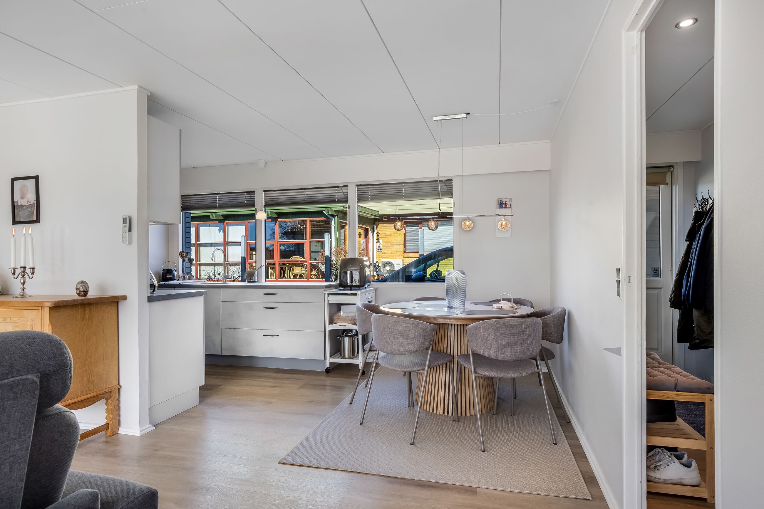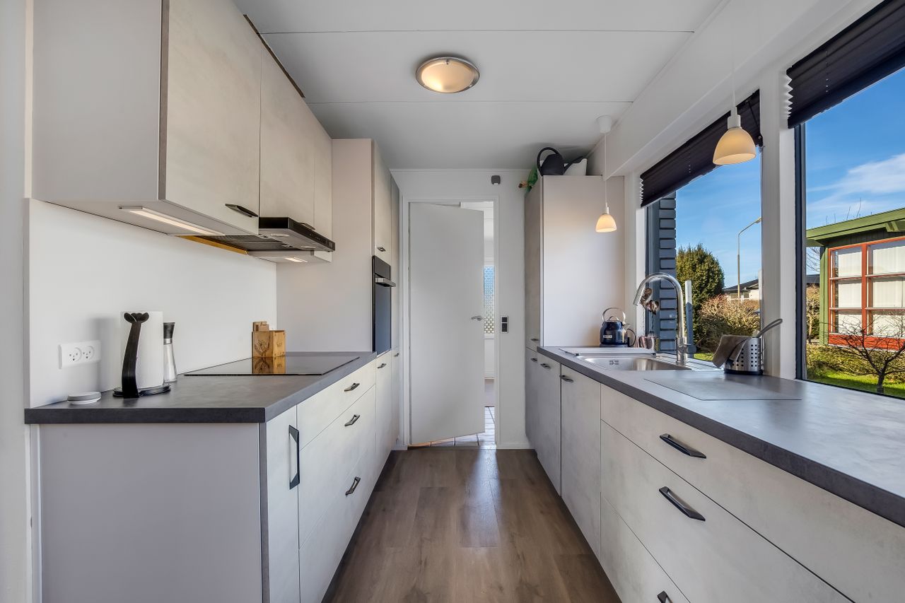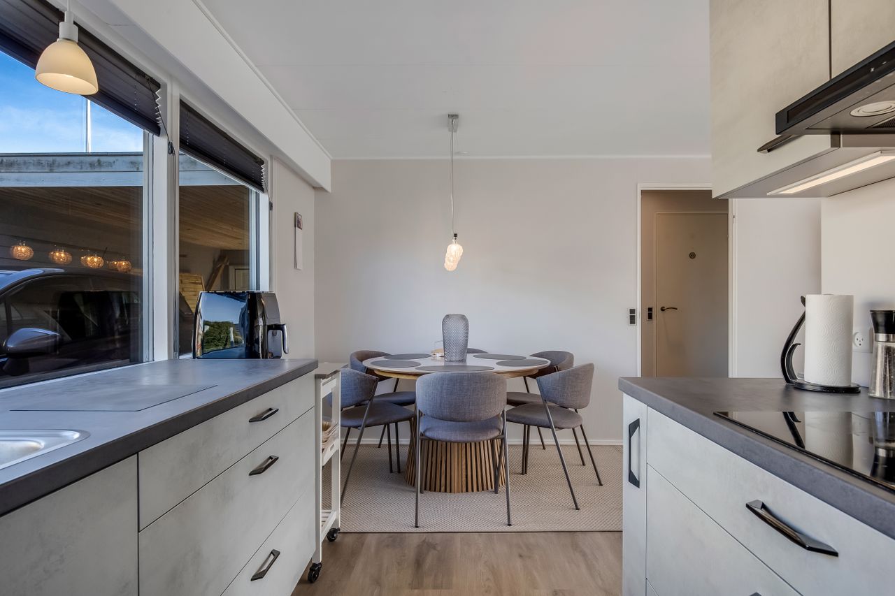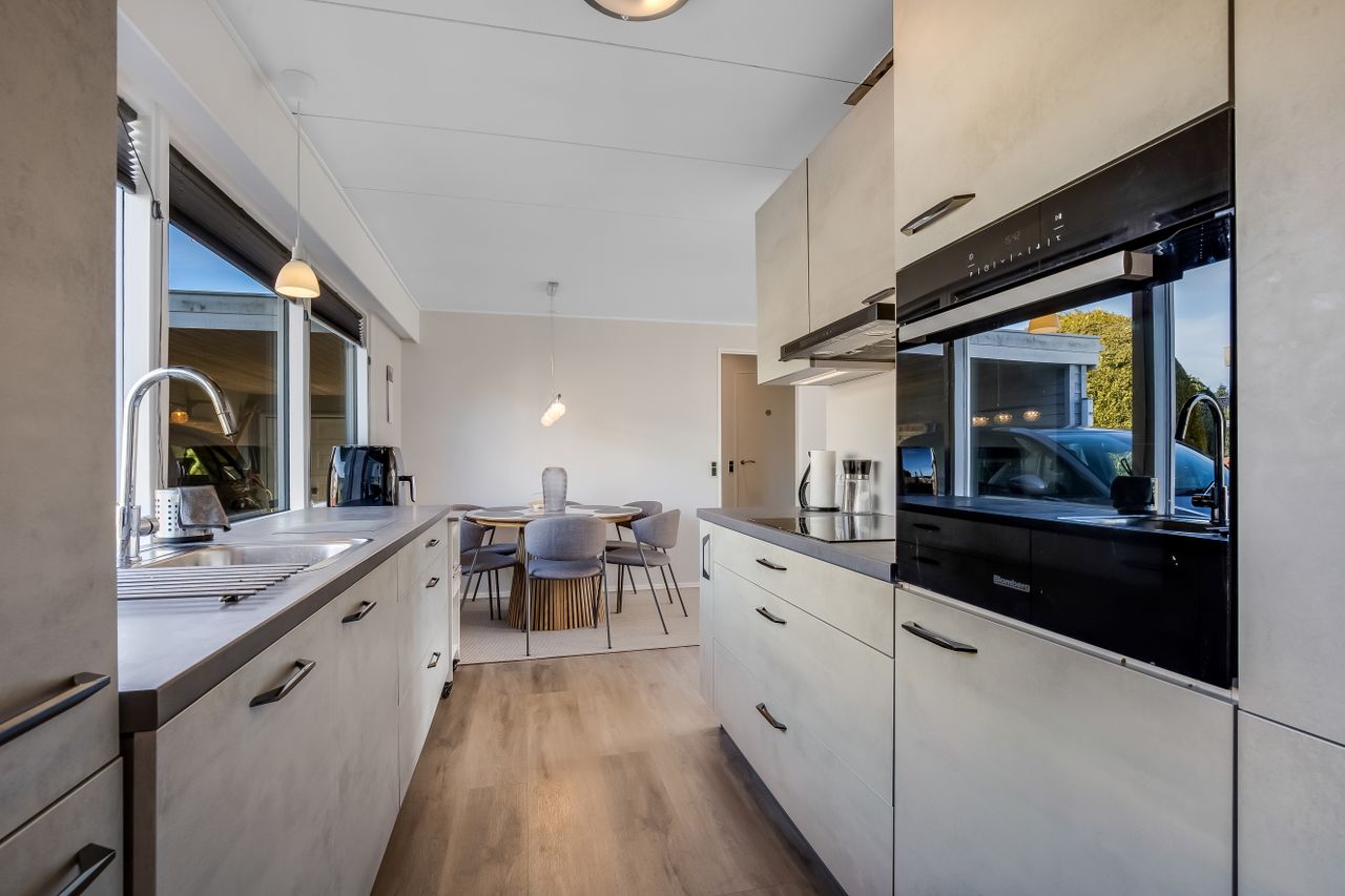 Køkkenet fremstår lyst og funktionelt med god bordplads og ligger praktisk i forbindelse med bryggerset, som har egen indgang. En detalje mange hurtigt lærer at sætte pris på i hverdagen.