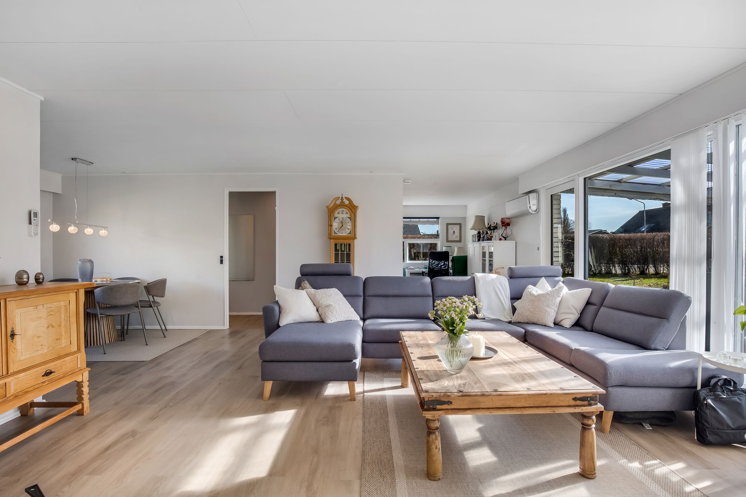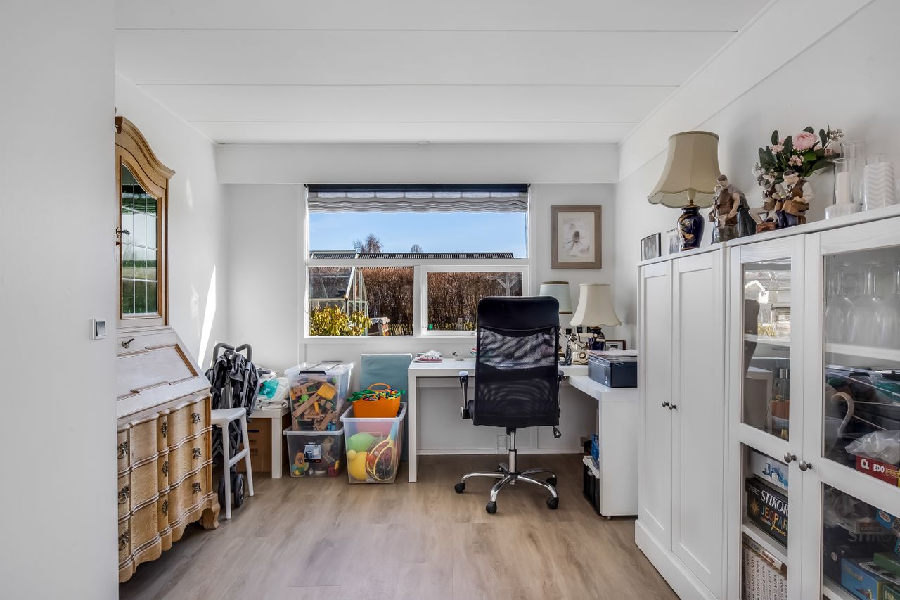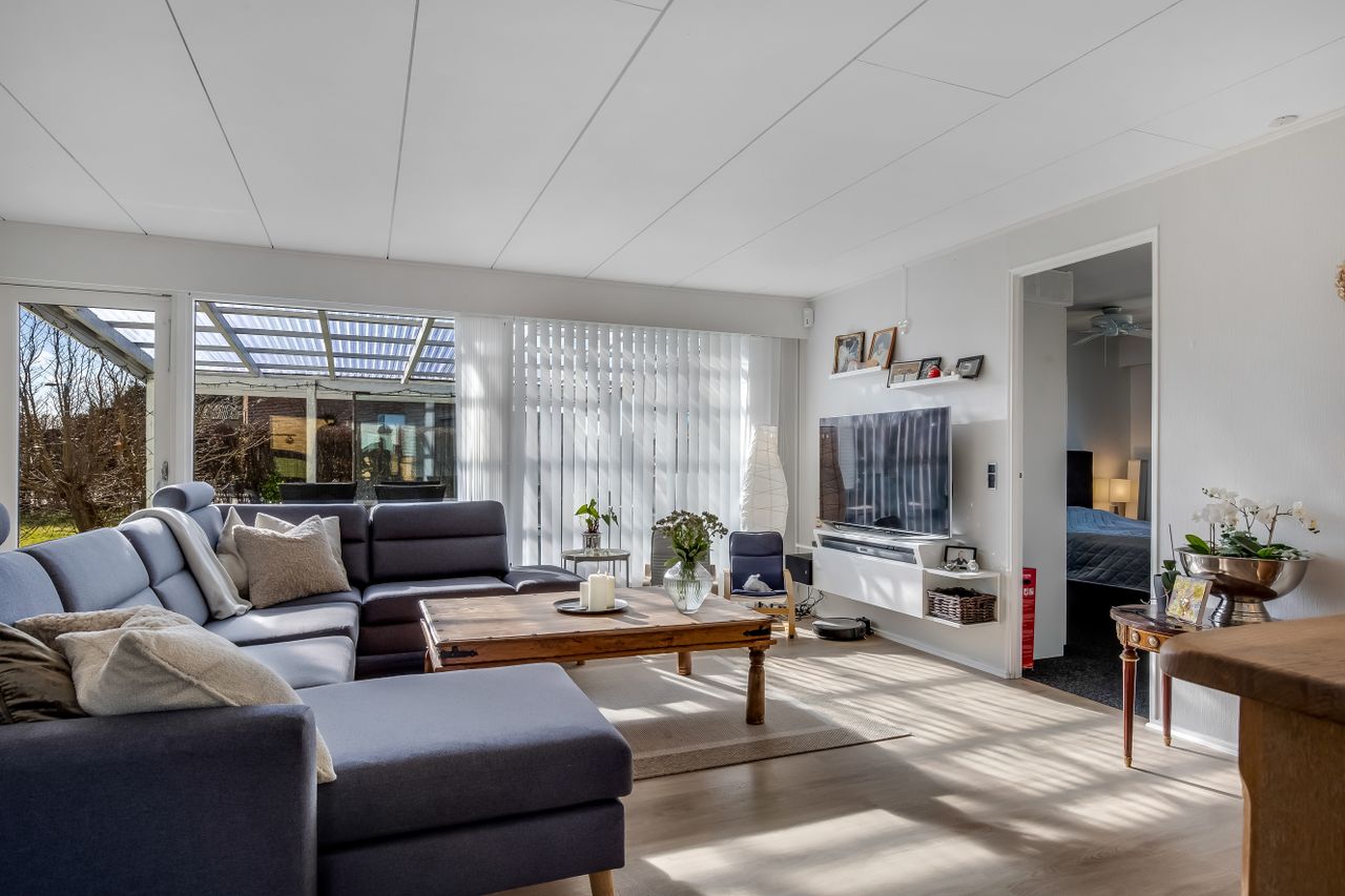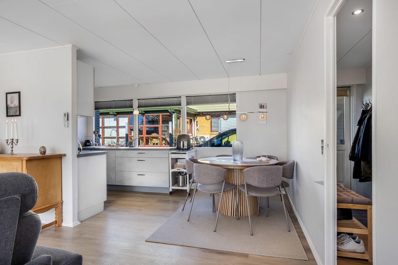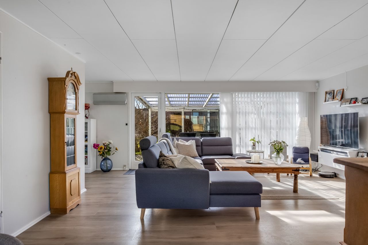 Husets naturlige samlingspunkt er den store og lyse stue i åben forbindelse med køkkenet, hvor dagslyset strømmer ind gennem de store vinduespartier. Her er god plads til både spisebord, sofa og hyggelige aftener med familie og venner. I den ene del af stuen er der i dag indrettet kontor, men her har der tidligere været et værelse, som nemt kan genetableres, hvis man har behov for et ekstra værelse.