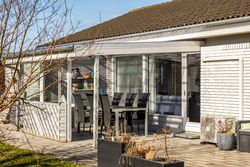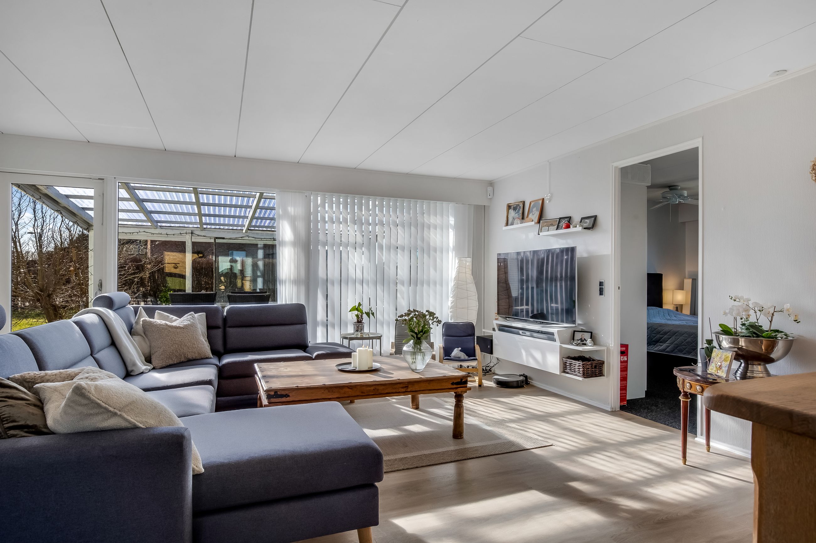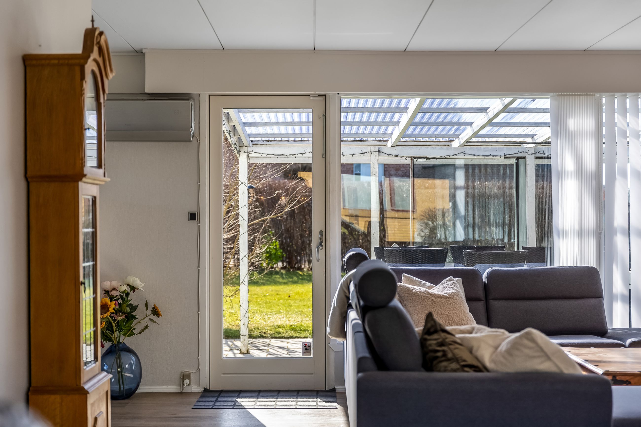 Fra stuen er der direkte udgang til terrassen samt den overdækkede terrasse, hvor sommerens måltider kan nydes, og hvor grillen hurtigt kan komme i brug.