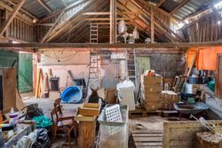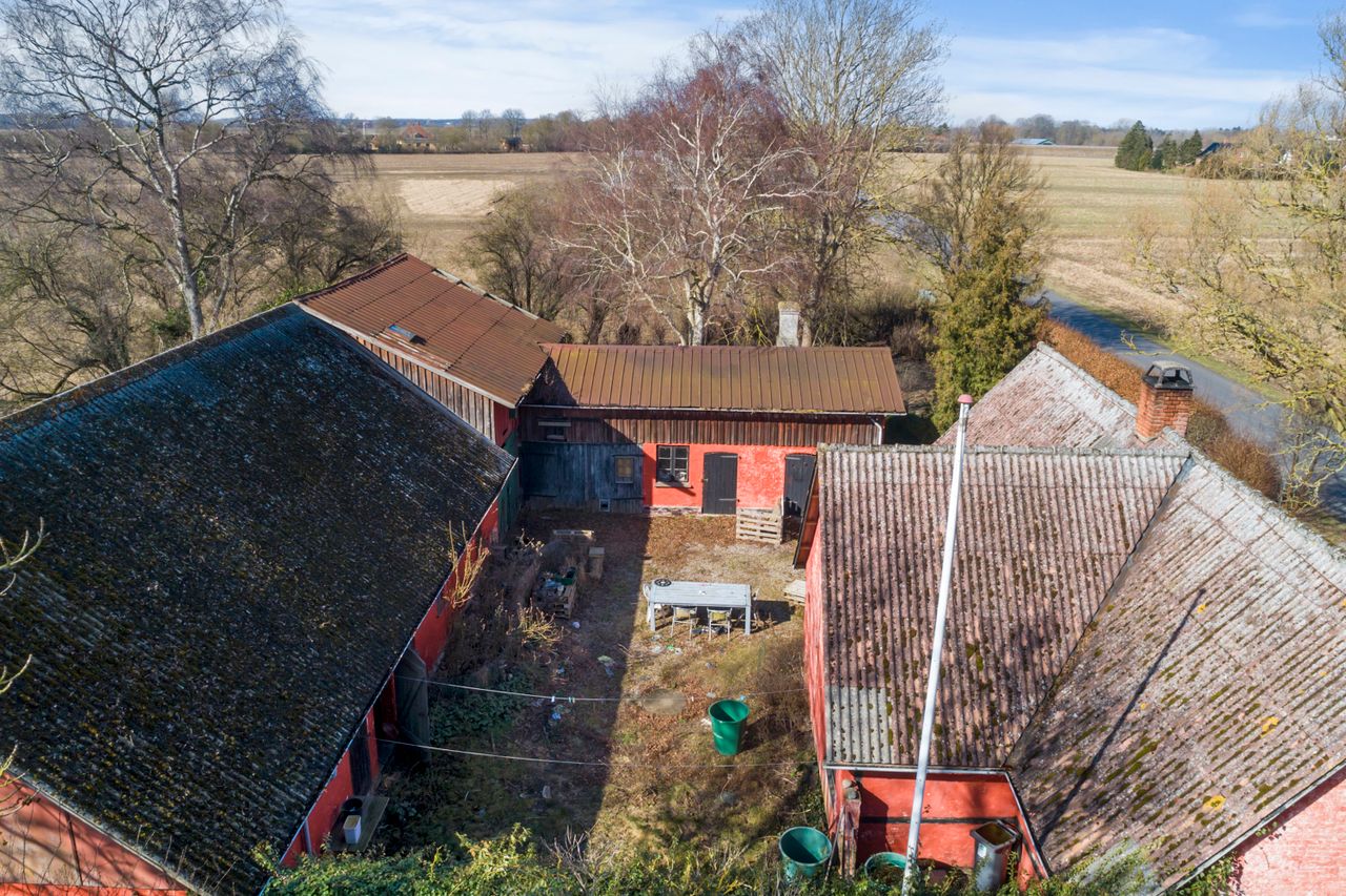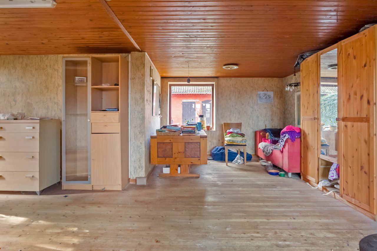 De mange kvadratmeter giver gode muligheder for værksted, opbevaring, hobbyaktiviteter eller mindre dyrehold.