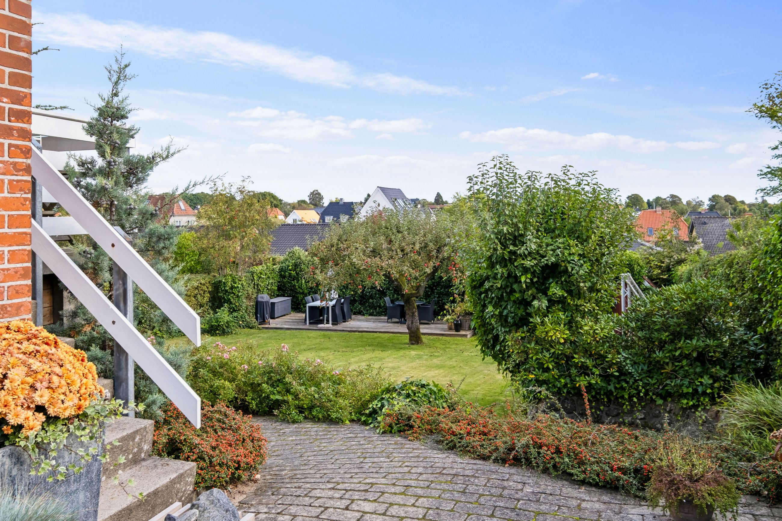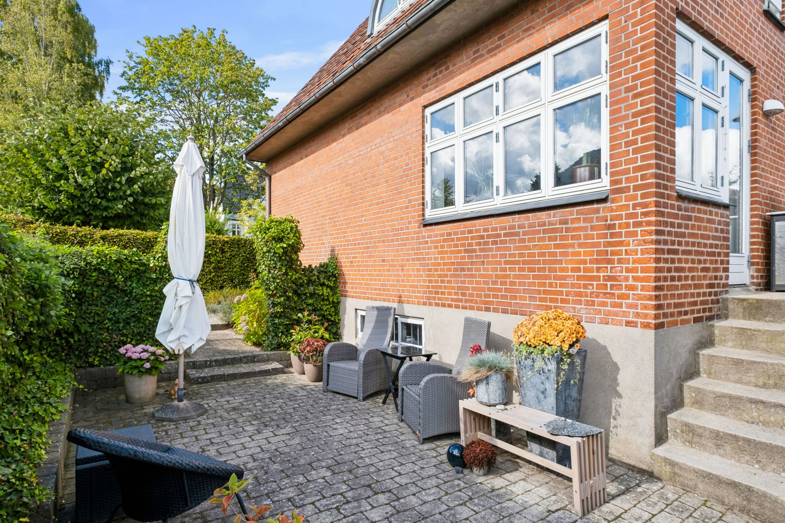 Udendørs venter en ugeneret have primært anlagt i græsplæne samt flere hyggelige terrassemiljøer, hvor sommerens solrige dage kan nydes fuldt ud. Haven tilbyder også rig mulighed for leg og aktiviteter for børnene eller blot rolig afslapning under åben himmel. Derudover findes her også en garage til bilen.