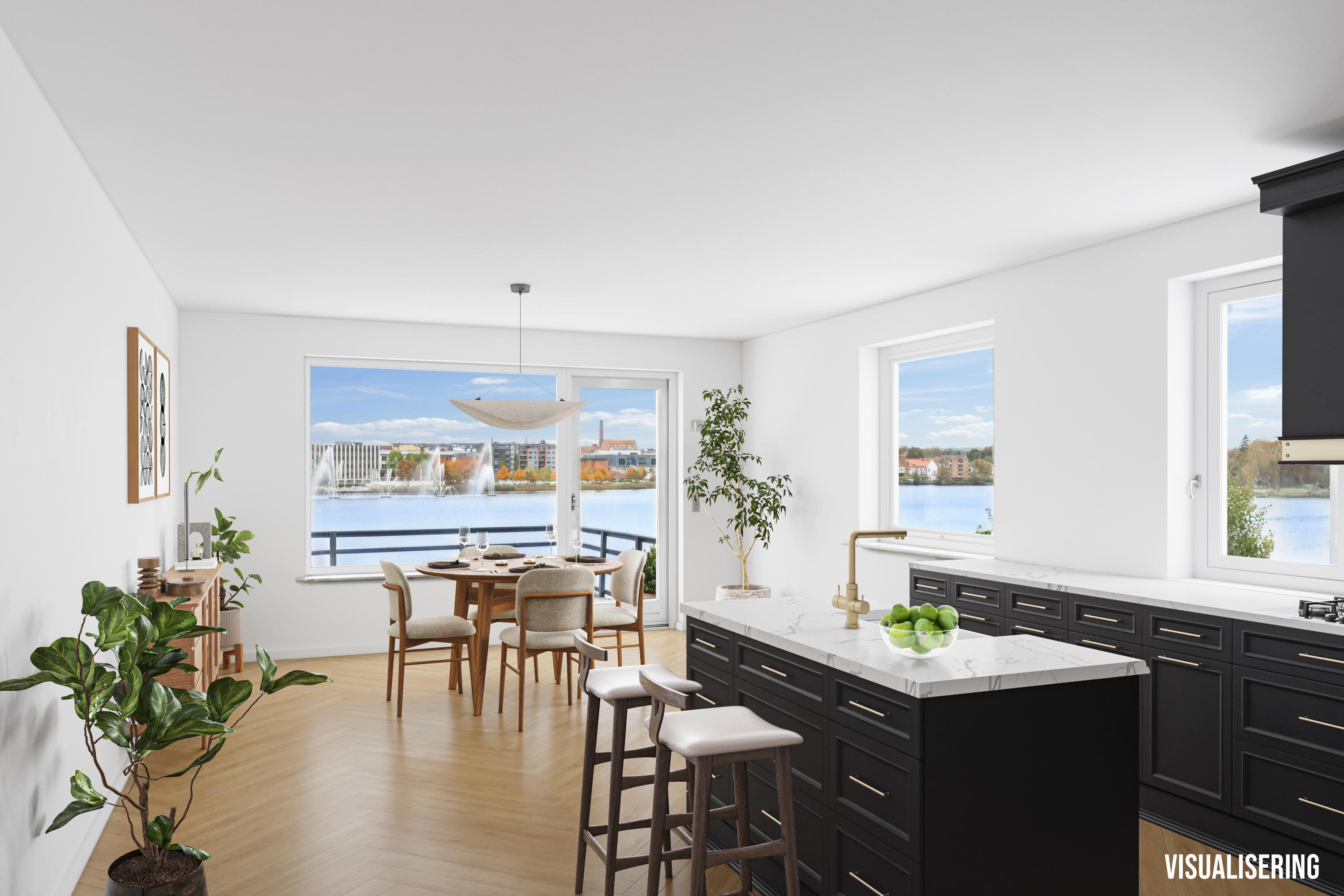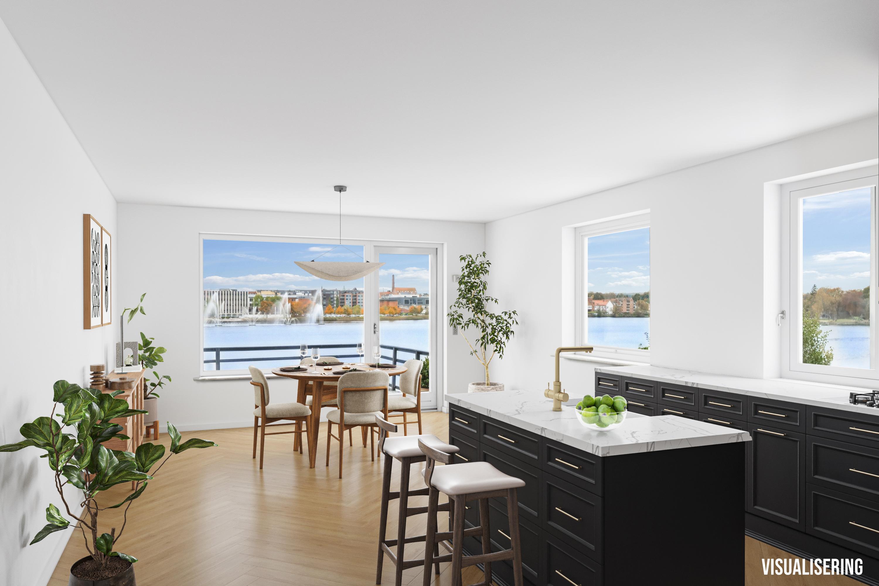 Forestil dig at vågne op til det bløde morgenlys, der danser over Silkeborg Langsø. Fra stuen, terrassen og haven har du panoramaudsigt til søens rolige vand, de gyldne skove mod vest og det ikoniske springvand foran rådhuset – en udsigt, der skifter karakter med årstiderne og aldrig bliver