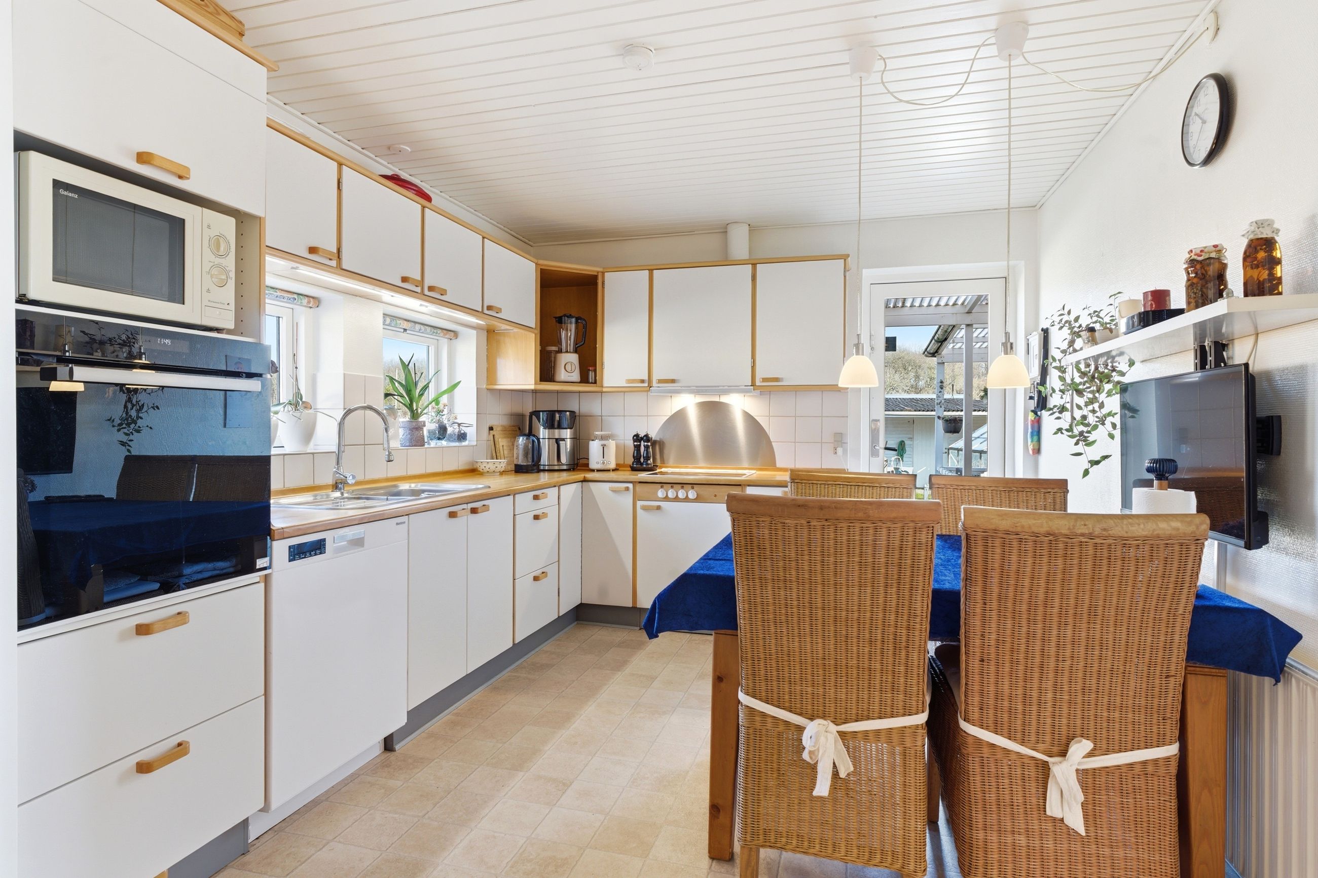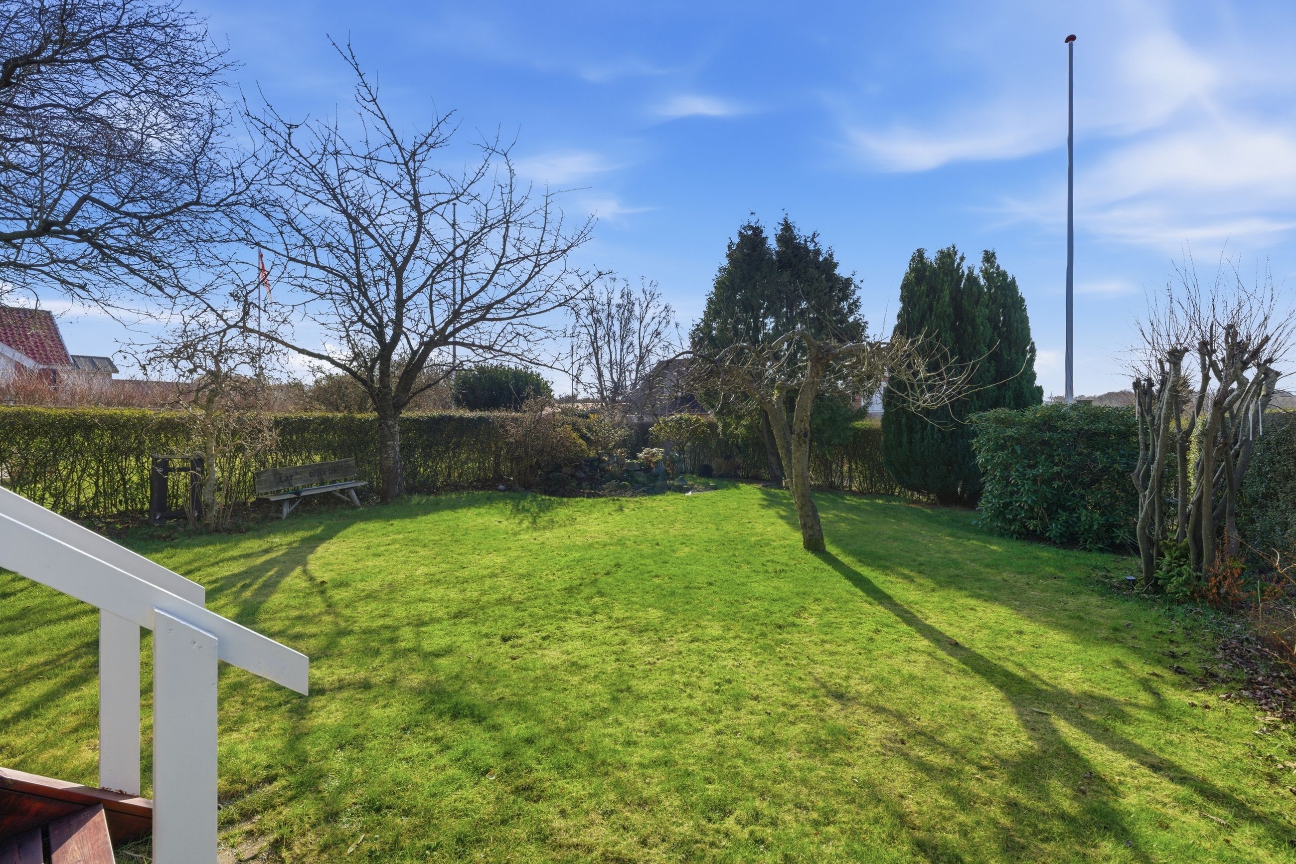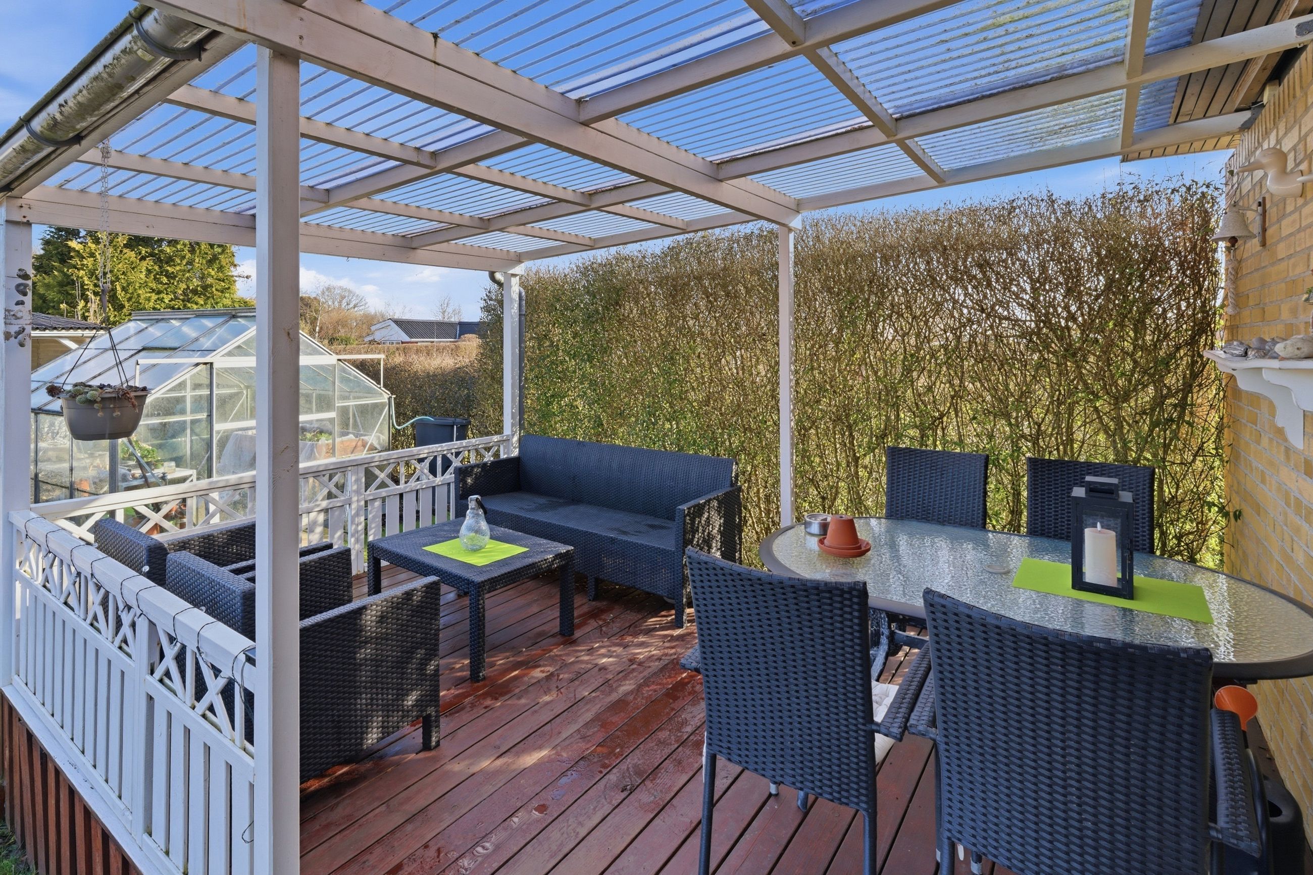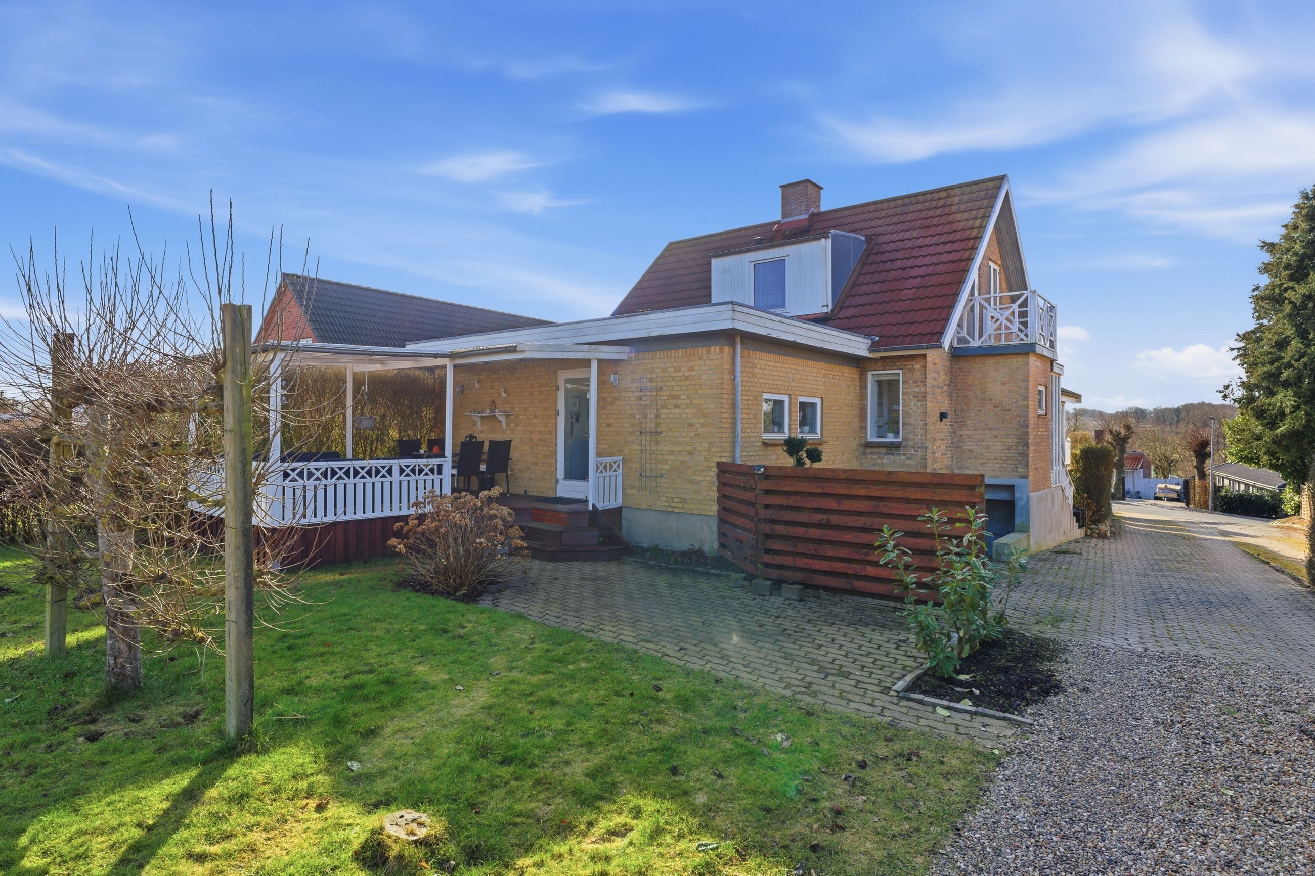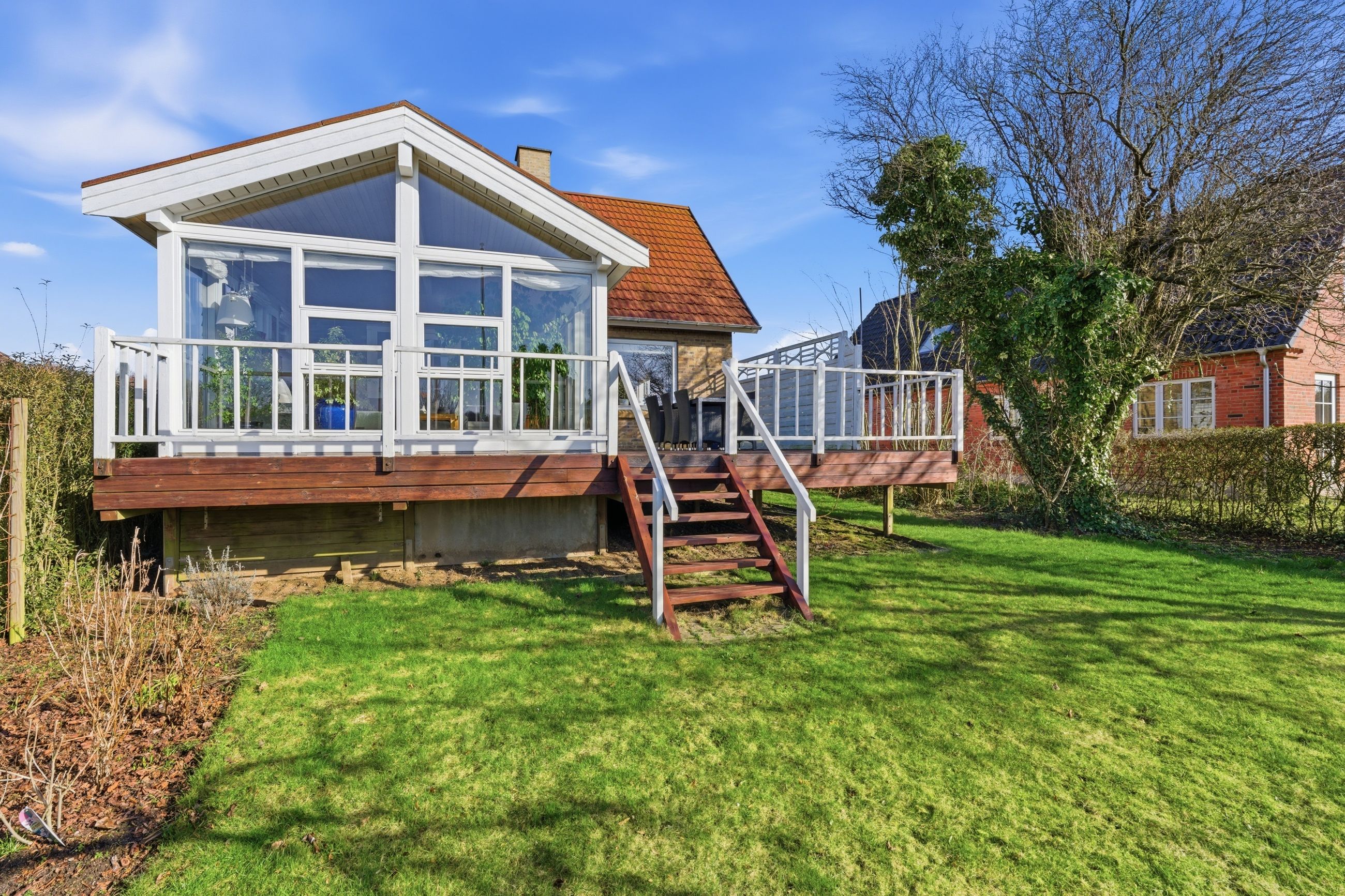 Udendørs venter en let og overskuelig have, hvor der er plads til både afslapning og hyggelige stunder. Huset har to terrasser, så solen kan følges dagen igennem – den ene ligger ideelt til middagssolen, mens den anden ved køkkenet er perfekt til eftermiddags- og aftensolen.