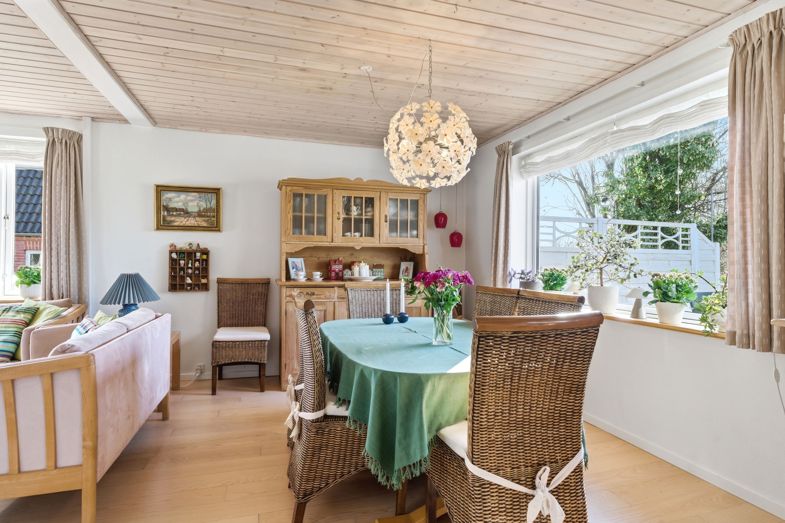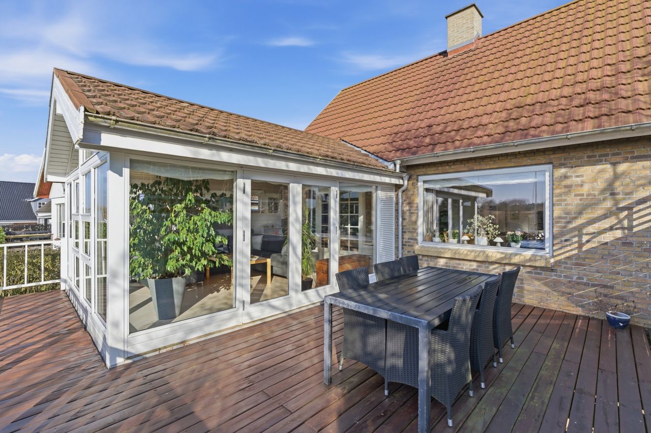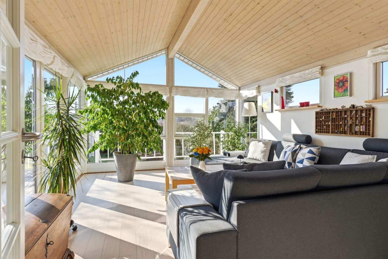 Husets naturlige samlingspunkt er køkkent, som ligger i forbindelse med stue og spisestue. Her er en god rumfornemmelse og et dejligt lysindfald, som skaber en hyggelig atmosfære i hverdagen. Fra opholdsrummene er der adgang til den store udestue, hvor udsigten virkelig kommer til sin ret. Her kan man sidde og nyde panoramaudsigten over området – uanset årstid.