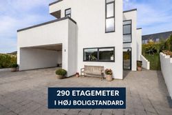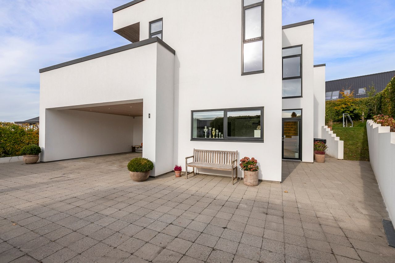 Den arkitekttegnede funkisvilla stod indflytningsklar i 2017. Villaen rummer alt, hvad hjertet kan begære, og ejendommen er opført i meget høj kvalitet. Her er ingen kompromiser, hverken hvad angår indretning eller materialevalg. Alt er gennemtænkt og kræset for ned til mindste detalje, og ejendommen er meget energivenlig med masser af naturligt lys på alle etager. Der er naturligvis gulvvarme og ventilationsanlæg i alle rum, og en rød tråd går igennem både inventar og design. Udvendigt er haven velanlagt og optimeret i forhold til solens stråler, og der er et separat udhus integreret i boligen mod øst. Desuden er der etableret flotte støttemure og flisebelægning rundt om grunden, og hækken har nu nået en højde, der sikrer fuld privatliv.