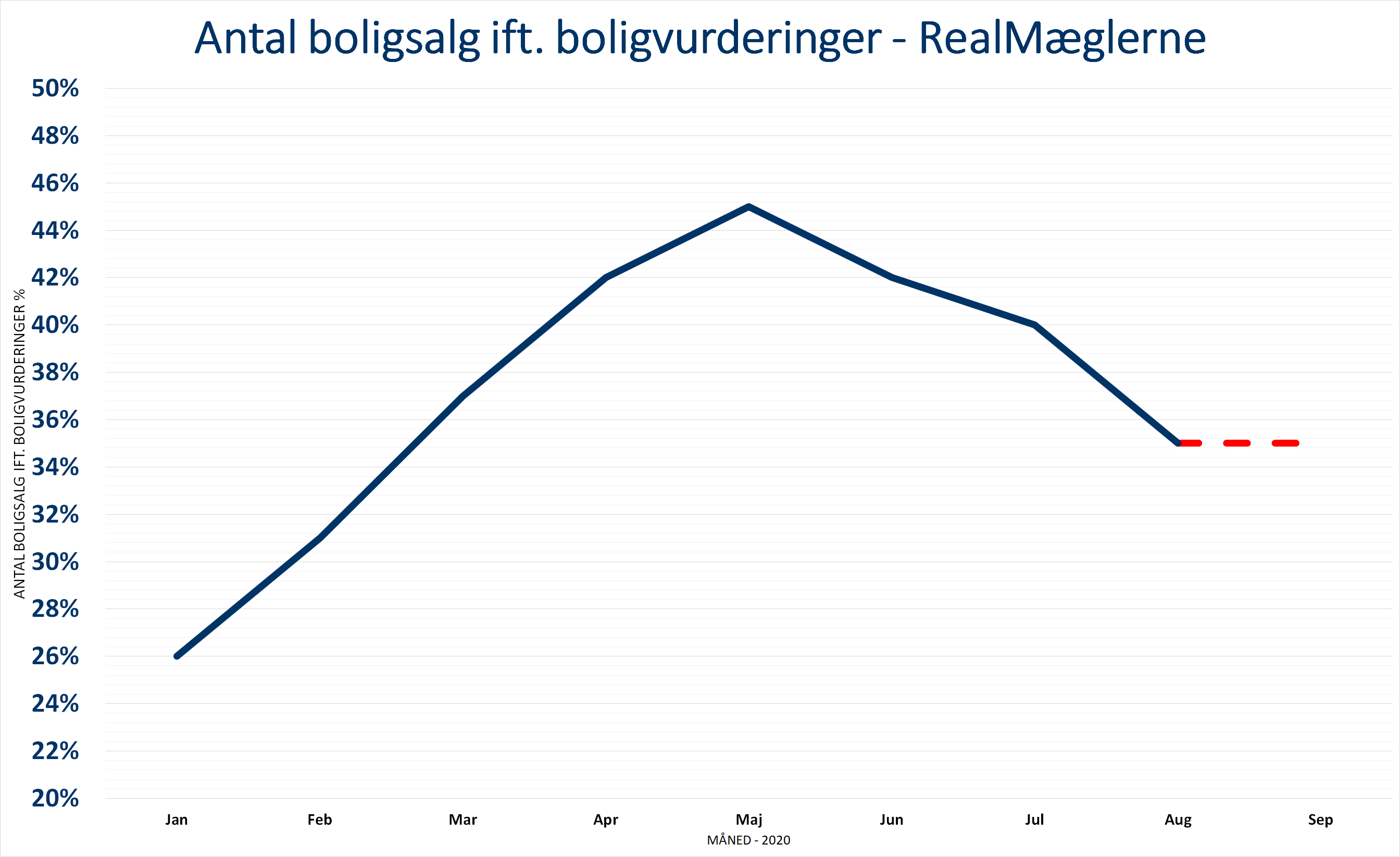 I 2018 udgjorde boligsalget i gennemsnit 30 procent i forhold til antallet af boligvurderinger i kæden. Det samme var tilfældet i 2019. I løbet af 2020 har antallet af boligsalg pr. vurderinger i RealMæglerne nærmet sig 50 procent, hvilket har medvirket til at skabe usædvanligt stor interesse om de boliger, der trods alt var i markedet.